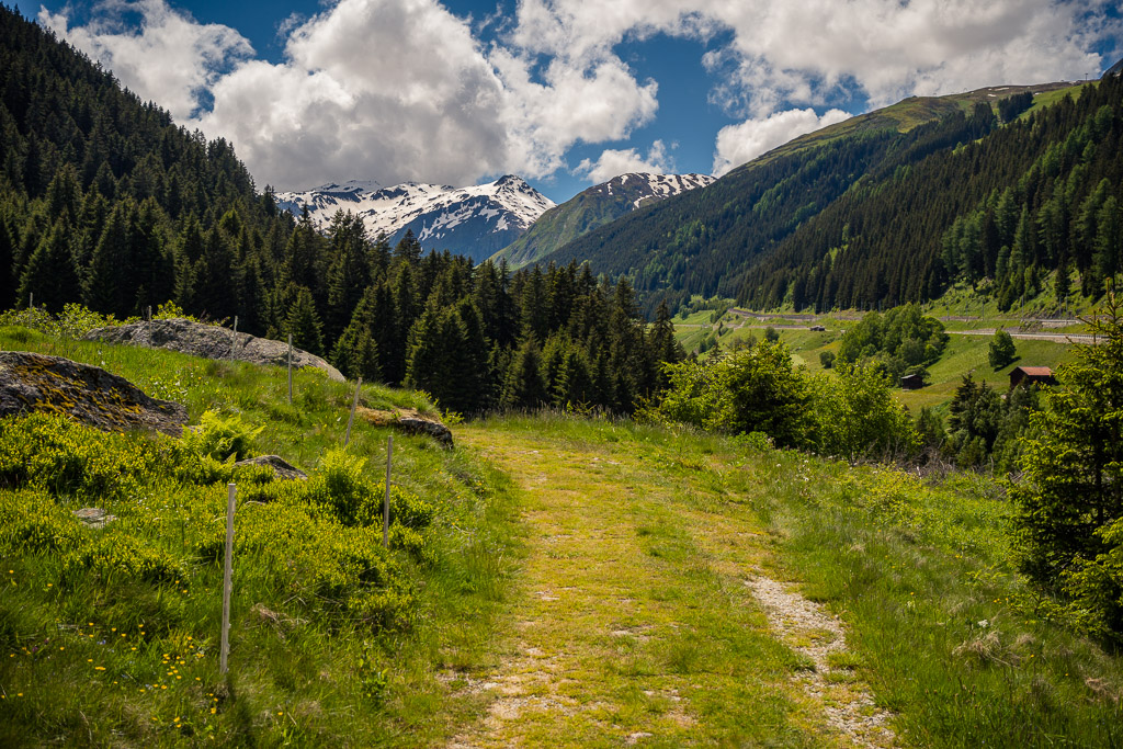 Den Weg zurück nach Disentis wollte ich allerdings nicht wieder auf der gleichen Strecke absolvieren. Stattdessen hatte ich im Voraus schon eine Alternative zusammengestellt, die teils über eine Mountainbikeroute auf der anderen Talseite und weitab der Passstrasse führen würde, gemäss Karte aber noch knapp Gravelbike-tauglich sein müsste. Vom Pass ging es aber zunächst wieder über die Serpentinen hinunter ins Tal nach Tschamut, wo ich die Strasse dann verliess.
