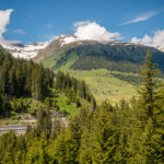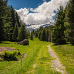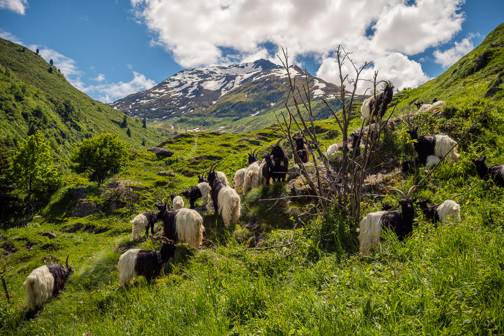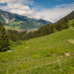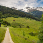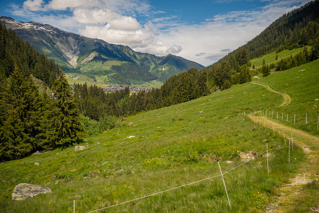 Die ersten Meter abseits der Strasse ging es auf einem völlig überwucherten Wiesenpfad zwischen Ziegen und Kühen hinunter zum Golfplatz bei Selva. Hier fuhr ich auf einem (erstaunlicherweise öffentlichem) Weg mitten zwischen den Golfspielern hindurch zur einer Brücke, hinter der es steil aufwärts in den Wald weiterging. Der nun folgende, lange Streckenabschnitt durch Wälder und über Wiesen bis nach Foppas war zusammen mit dem Schlussanstieg zum Oberalppass der schönste Teil der ganzen Route und entschädigte für die lange Fahrt auf der Hauptstrasse, die man mitsamt den Baustellen weit entfernt am gegenüberliegenden Hang sehen konnte.