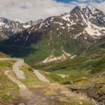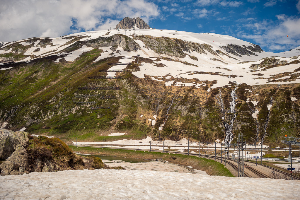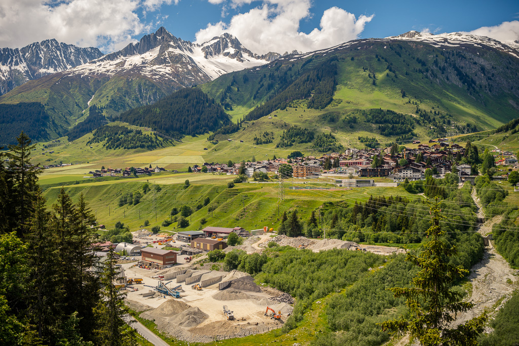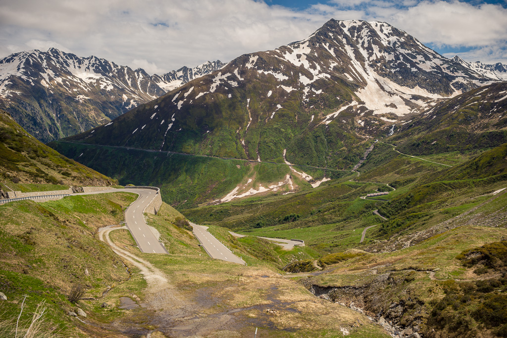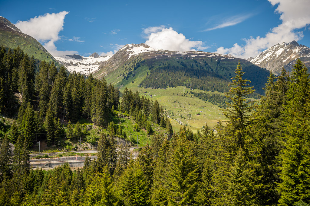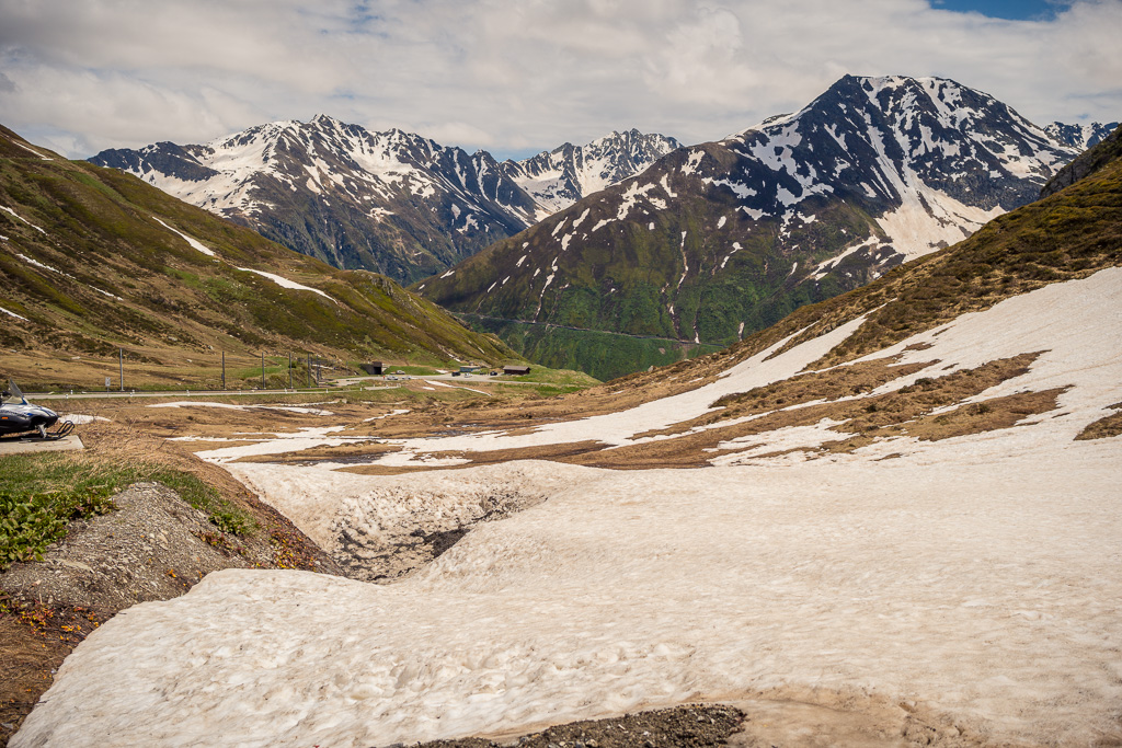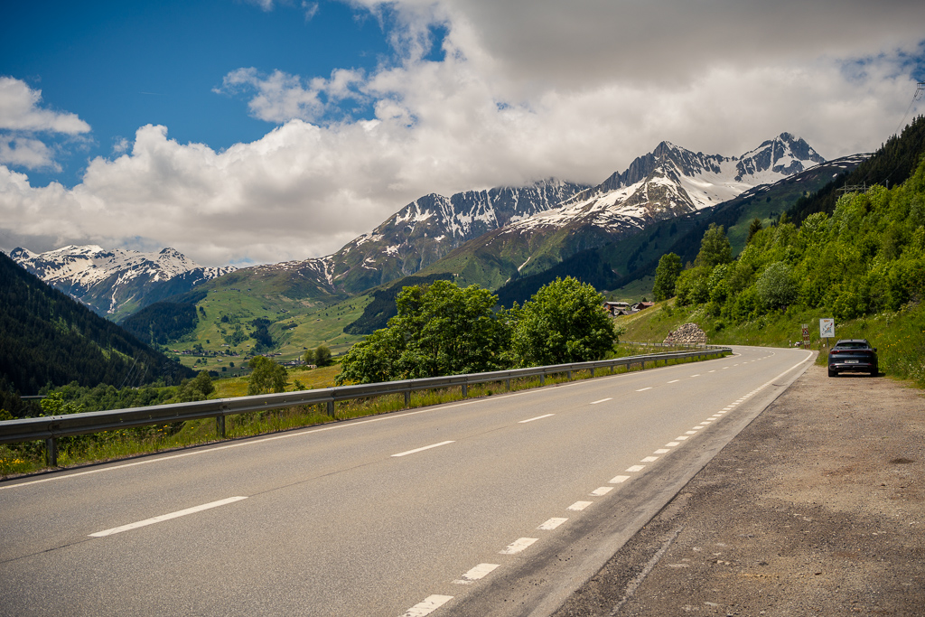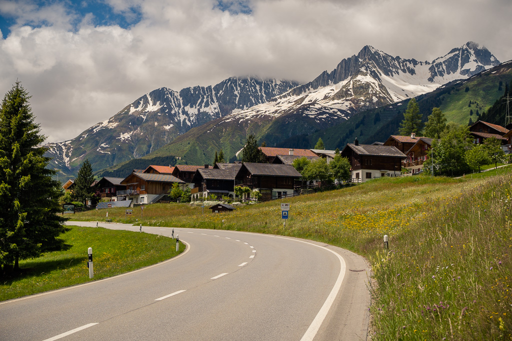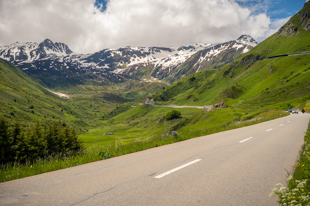 Von Disentis fuhr ich alles der Strasse entlang zum nächsten Dorf Sedrun und weiter nach Tschamut. Dieser Streckenteil zog sich leider relativ eintönig über viele Kilometer hinweg durch das Tal und war wiederum mit einigen Baustellen und Wartezeiten gespickt. Die landschaftliche Schönheit begann eigentlich erst hinter Tschamut, als sich eine Reihe von Haarnadelkurven mit zunehmend spektakulärer Aussicht aus dem Talboden auf die Passhöhe wand. Von hier an verblieben allerdings nur noch 200 Höhenmeter zum Pass, sodass das eigentliche Vergnügen im Endeffekt eher kurz war.