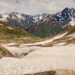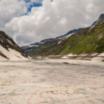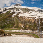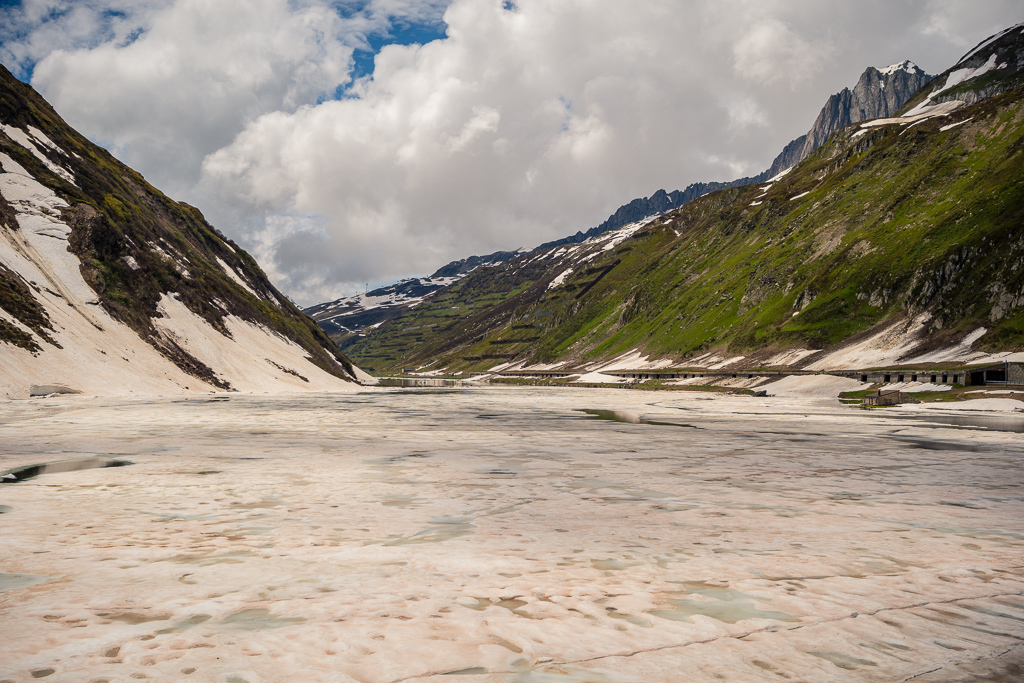 Faszinierend war wie schon bei den anderen Passfahrten in diesem Jahr die verschneite Gebirgslandschaft und auch hier ein See auf der Passhöhe, der immer noch halb zugefroren war. Damit verbunden wie schon fast üblich ein kalter und sehr ungemütlicher Wind, sodass ich mich auch diesmal nicht lange auf dem Pass aufhielt, sondern mich bald zur Abfahrt rüstete.