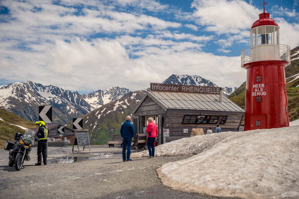 Der für mich eindrücklichste Moment im Aufstieg war sicherlich die «Zielgerade» vor der Passhöhe, als der Leuchtturm (das Wahrzeichen vom Oberalppass, das den Ursprung des Rheins symbolisieren soll) erstmals in Sicht kam. Ein etwas skurriles Gefühl, das rote pulsierende Leuchtfeuer vom Turm auf einem Alpenpass als Fixpunkt auf dem letzten Kilometer im Blick zu haben und nicht auf dem Meer bei der Einfahrt in einen Hafen.