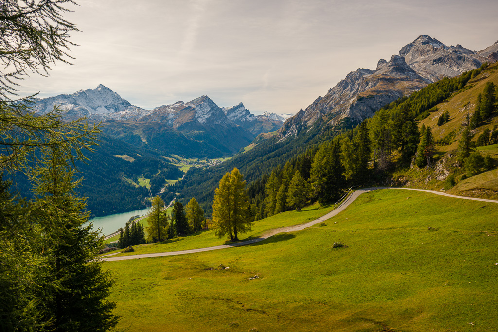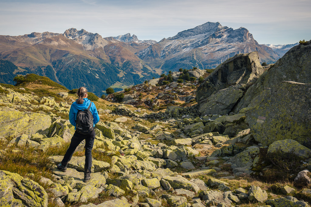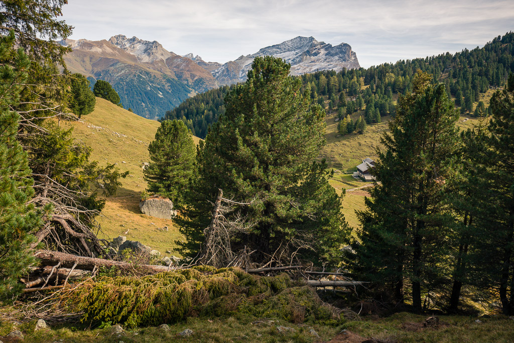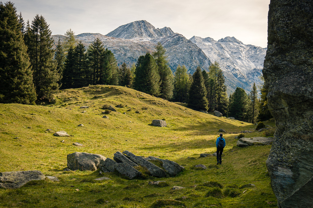 Ab hier geht es steil auf markiertem Weg durch den Wald hinab, streckenweise auf einem riesigen Hang mit Blockgeröll, das sich mitten durch den Wald hinabzieht. Wir kommen schlussendlich an der Hauptstrasse aus dem Wald hinaus. Einen halben Kilometer folgen wir dem Weg im Verkehrslärm am Strassenrand, bevor es wieder in den Wald und zum Festungsmuseum Crestawald geht. Weiter nach Westen auf dem Wanderweg in Richtung Sufers, der bald in eine Fahrstrasse mündet und im Dorfzentrum endet.