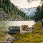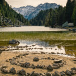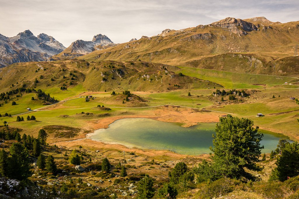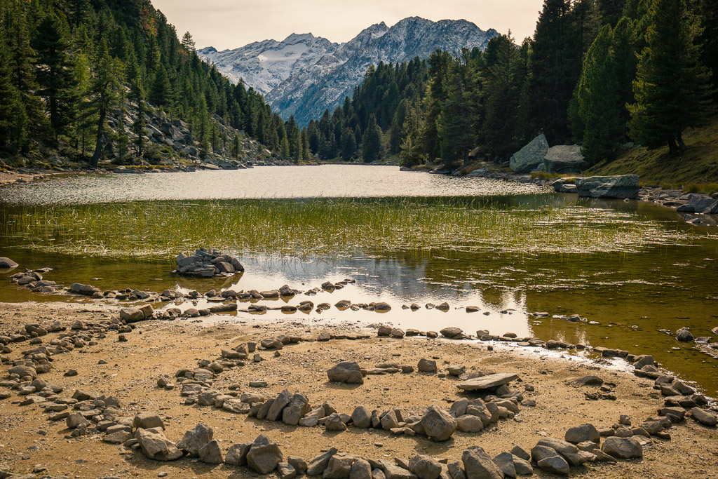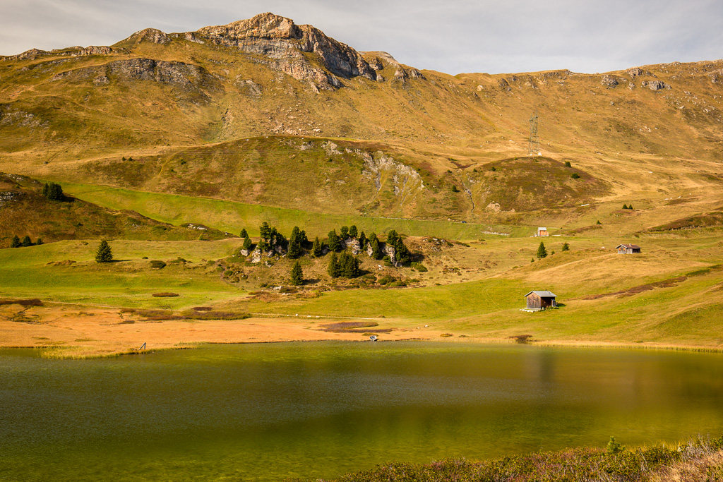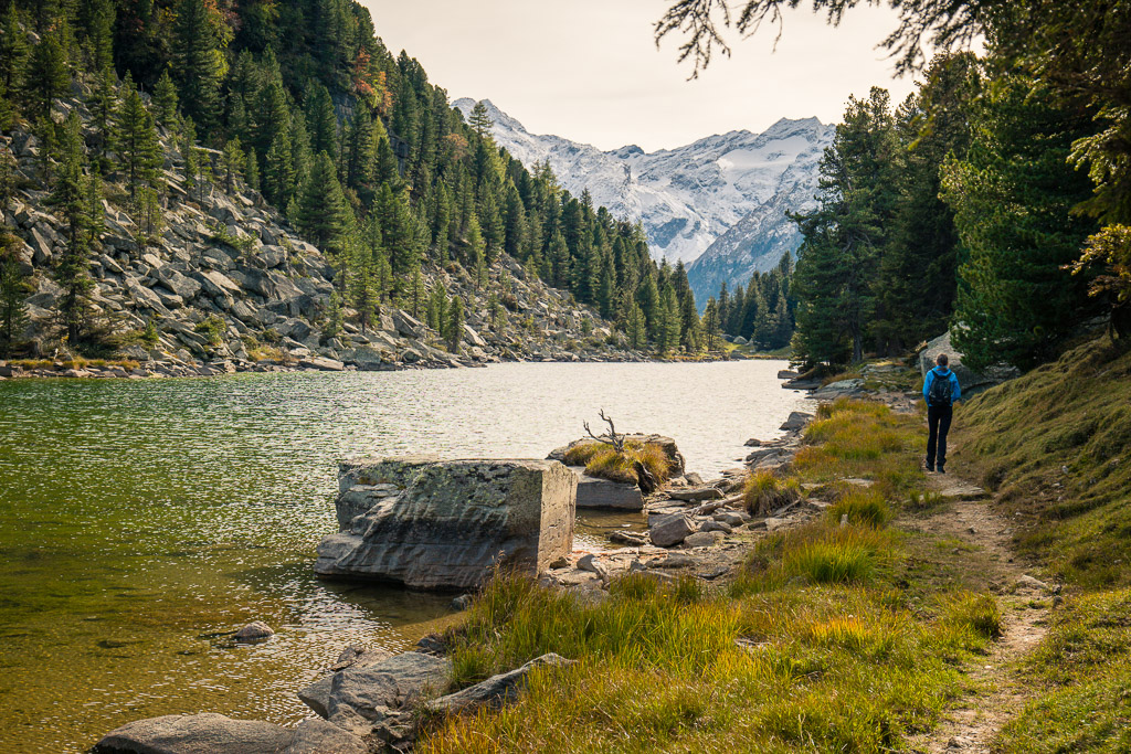 Etwa auf Höhe der Seemitte zweigt ein markierter Weg nach rechts ab in Richtung Alp Durnan und Lai Lung. Er führt steil über Gras und grobes Blockgeröll hinauf und erreicht einen namenlosen Passübergang bei P.2068 mit sehr schöner Aussicht nach Osten. Auf der anderen Seite geht es ebenso steil, aber bequemer durch den Wald hinunter zu den Hütten der Alp Durnan, wobei man den nahegelegenen Lai Lung schon von weitem sieht. Weiter nach Süden zum See und auf einem malerischen Weg am westlichen Ufer zu einem weiteren Übergang mit grossen Felsblöcken.
