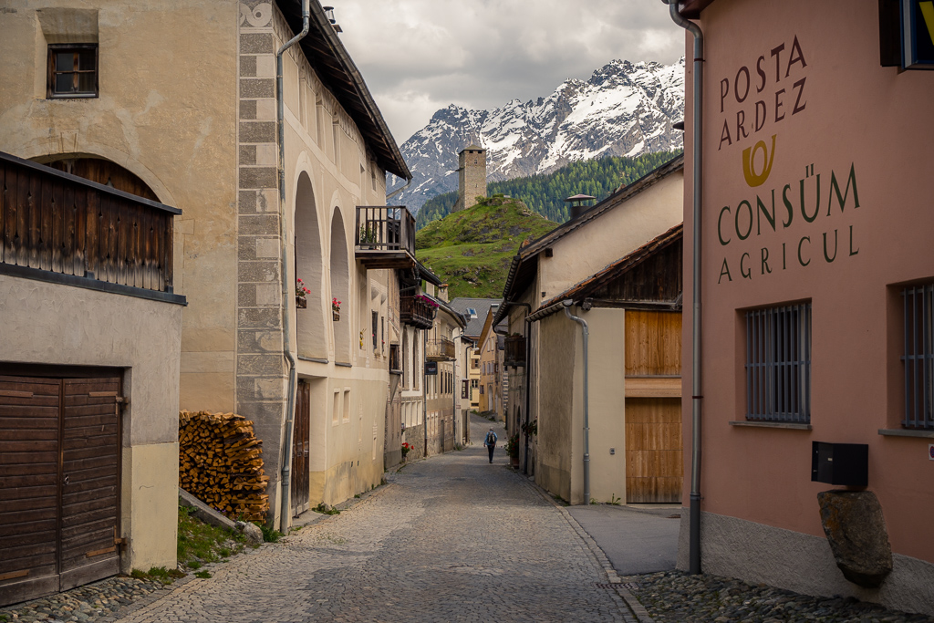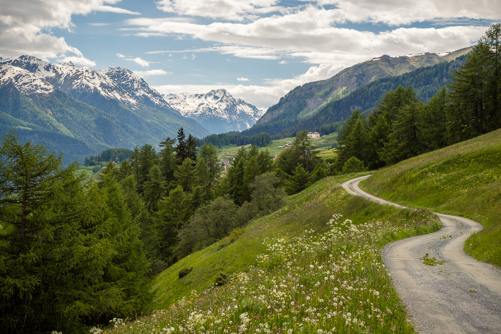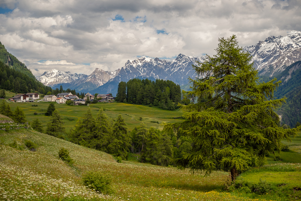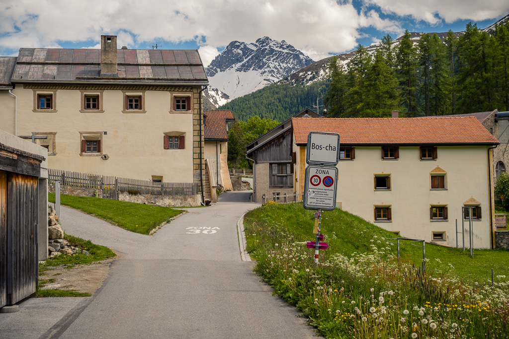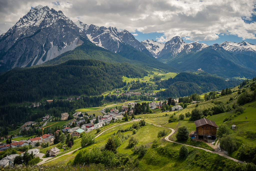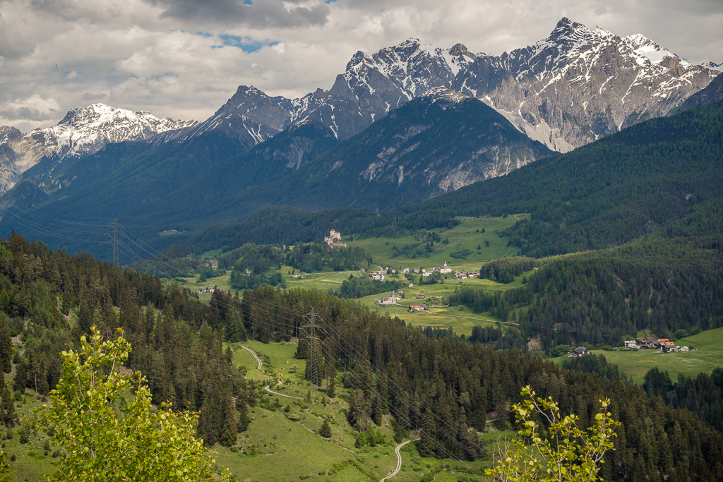 Von Susch aus ging es abseits des Autoverkehr zunächst auf dem Inn-Radweg über Feldwege im Talboden entlang der Inn flussabwärts. Bei Lavin wechselte der Weg auf die nördliche Talseite und stieg in der Folge rund 250 Höhenmeter an, sodass man mit zunehmender Höhe immer neue Ausblicke auf das Inntal geniessen konnte. Durch die wunderschönen Dörfer von Guarda, Bos-cha und Ardez mit ihren alten Dorfkernen fuhr ich weiter bis nach Ftan, dem höchsten Dorf auf meiner Route.