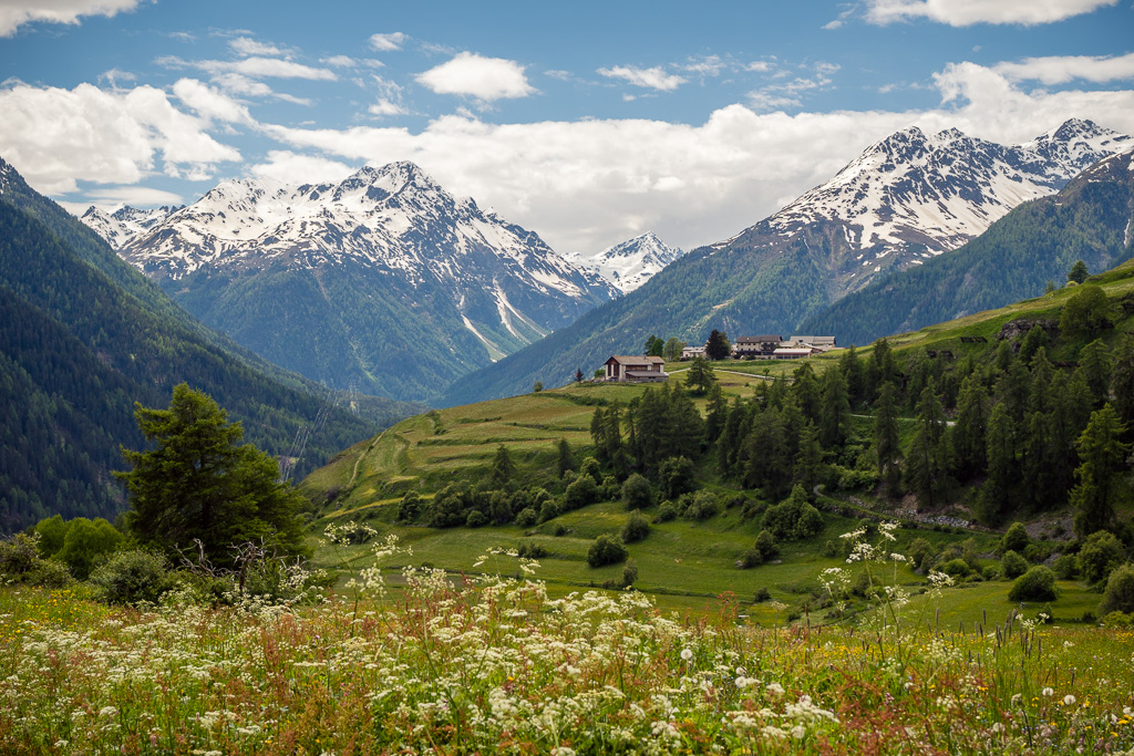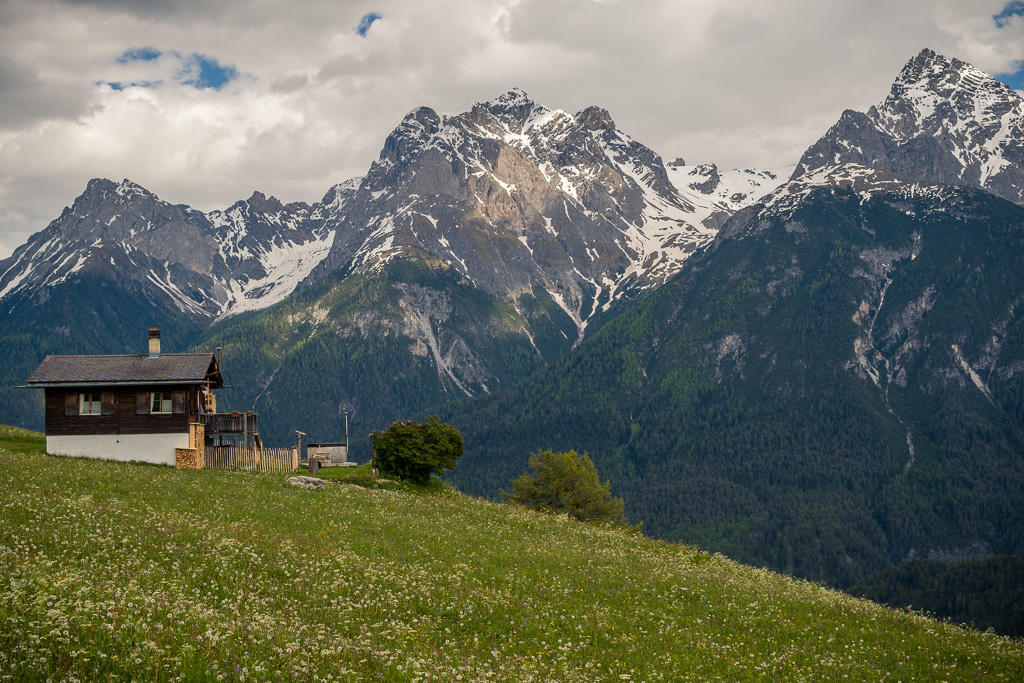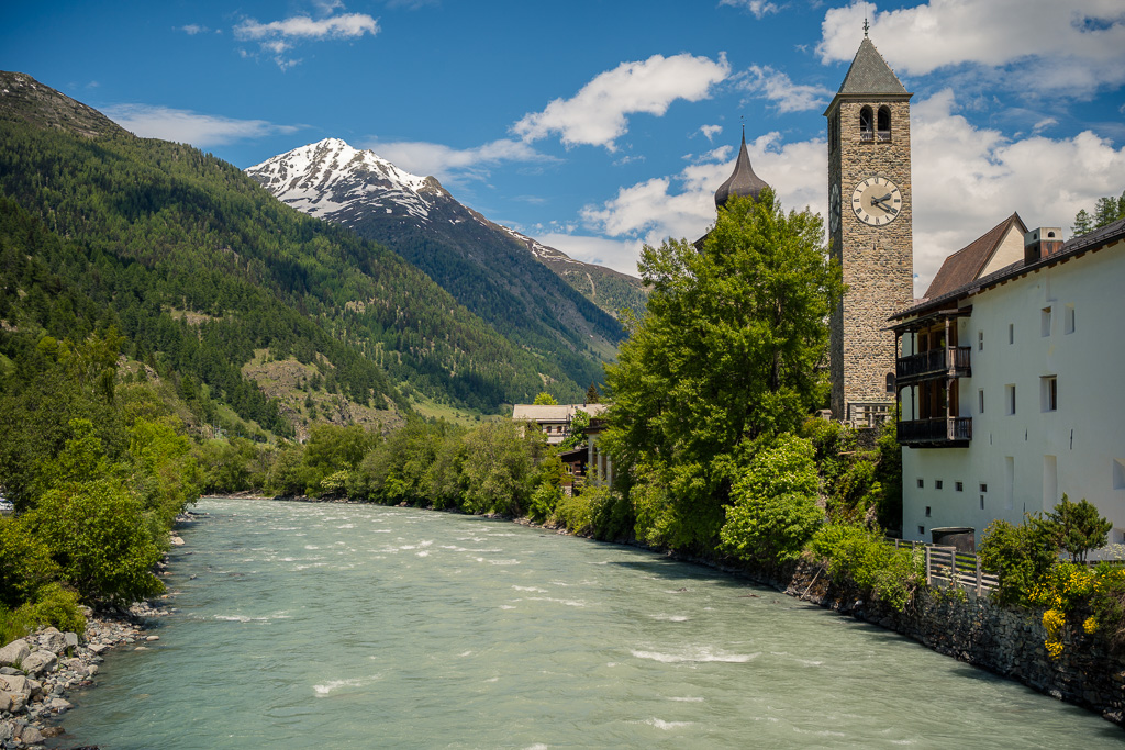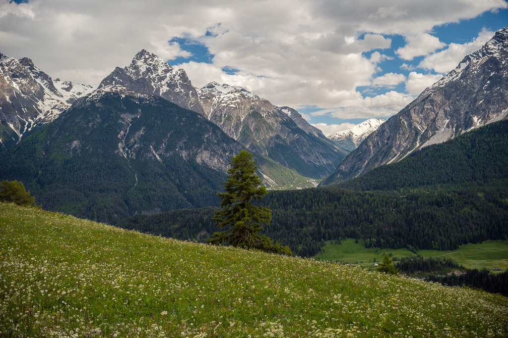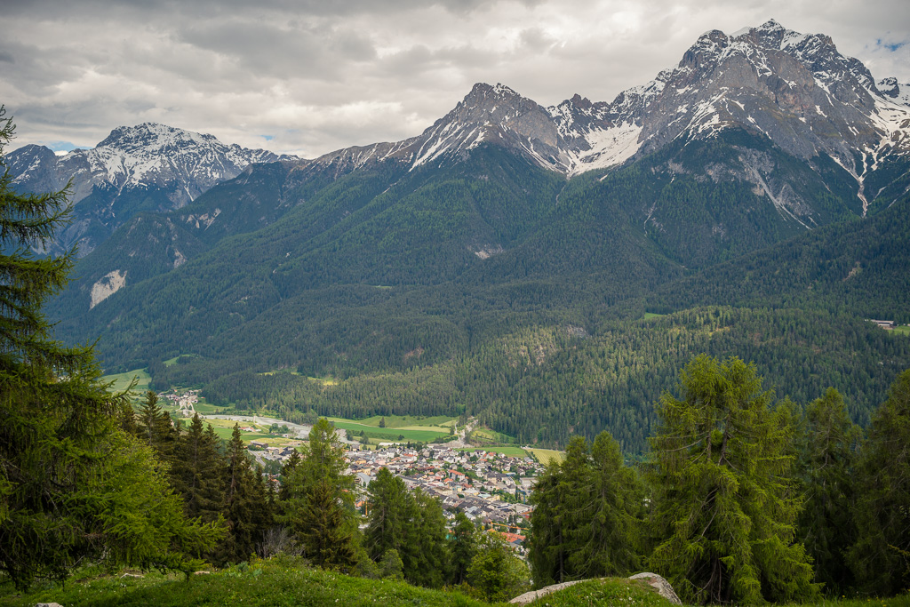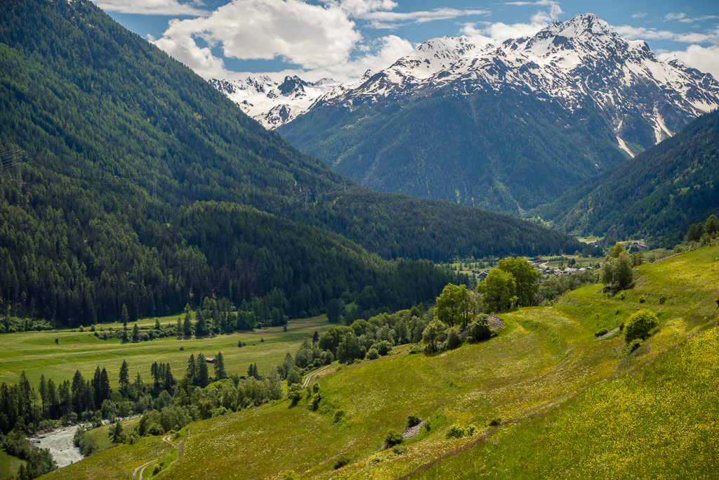 Von Susch aus ging es abseits des Autoverkehr zunächst auf dem Inn-Radweg über Feldwege im Talboden entlang der Inn flussabwärts. Bei Lavin wechselte der Weg auf die nördliche Talseite und stieg in der Folge rund 250 Höhenmeter an, sodass man mit zunehmender Höhe immer neue Ausblicke auf das Inntal geniessen konnte. Durch die wunderschönen Dörfer von Guarda, Bos-cha und Ardez mit ihren alten Dorfkernen fuhr ich weiter bis nach Ftan, dem höchsten Dorf auf meiner Route.