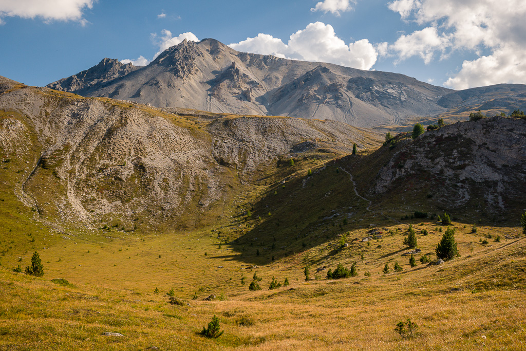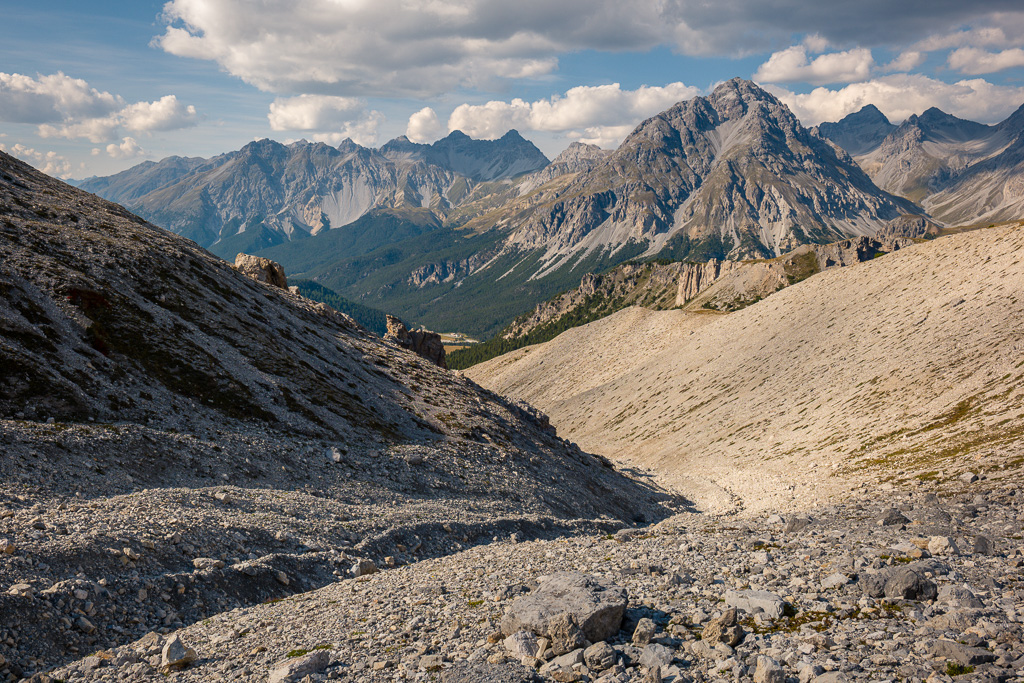 Nun steigt der Weg nach Süden über die weiten Grasflächen von Murtaröl an und wendet sich dann am Fuss der gewaltigen Geröllhänge des Piz Daint nach SW. Auf gutem Weg quert man das Geröll ansteigend und erreicht einen Wegweiser auf der weiten Fläche von P.2649 am Ausläufer des Rückens, der sich vom Gipfel herunterzieht. Von hier aus kann man auf dem Rückweg auch in einem weiten Bogen nach Westen über Jufplaun wieder nach Davo Plattas zurückkehren.