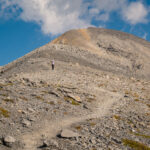 Von P.2649 nun geradewegs hoch in Richtung des bald von weitem sichtbaren Gipfelkreuzes. Der Weg schlängelt sich auf dem Rücken über das Geröll empor und man erreicht etwas anstrengend, aber ohne technische Schwierigkeiten den höchsten Punkt (Gipfelbuch)