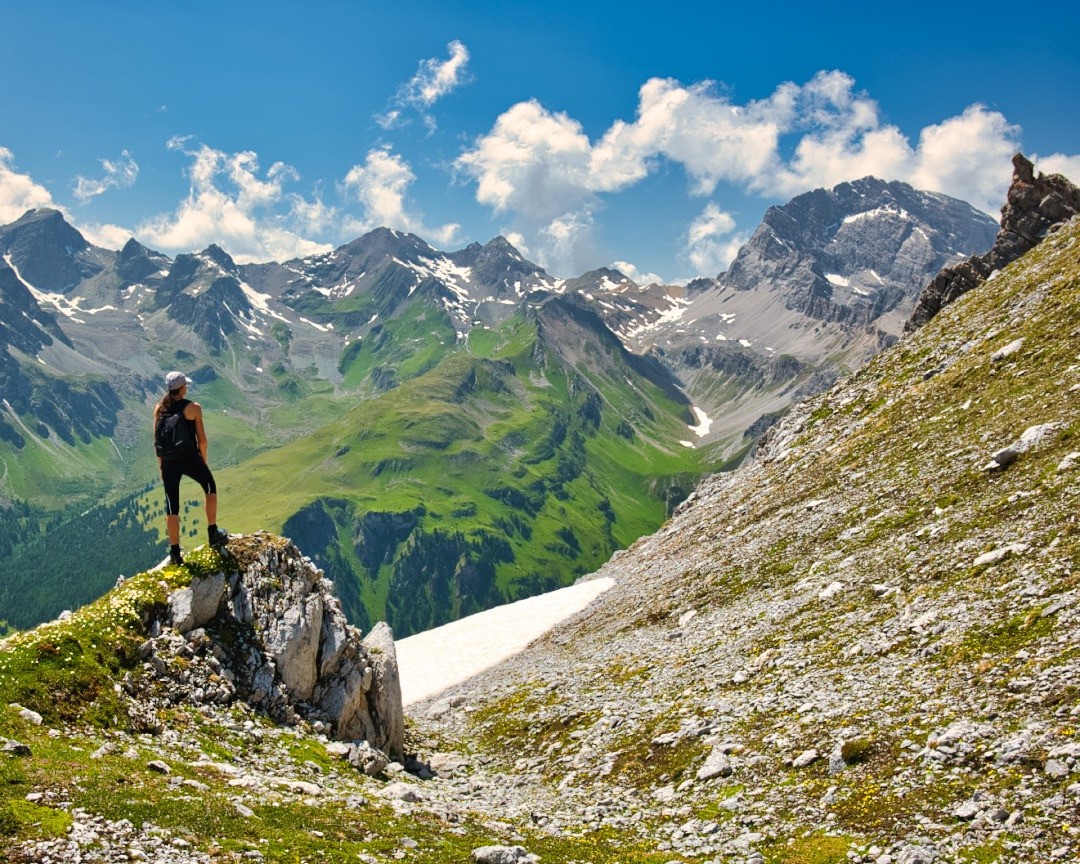 Auf der Grasschulter angekommen, verlassen wir den Weg und wenden uns nach rechts, um direkt in der Falllinie über das zunehmend steile Geröll zur Grathöhe hinaufzusteigen. Alternativ kann auch eine etwas rechts davon aus dem Geröll herausragende Felsrippe angesteuert und verfolgt werden, die etwas bequemer ist. In der Nähe der Grathöhe geht das Geröll in flachere Grashänge über. Über diese erreichen wir den Grat und geniessen schon hier eine herrliche Aussicht in alle Richtungen über die Albularegion und die Bergüner Stöcke.