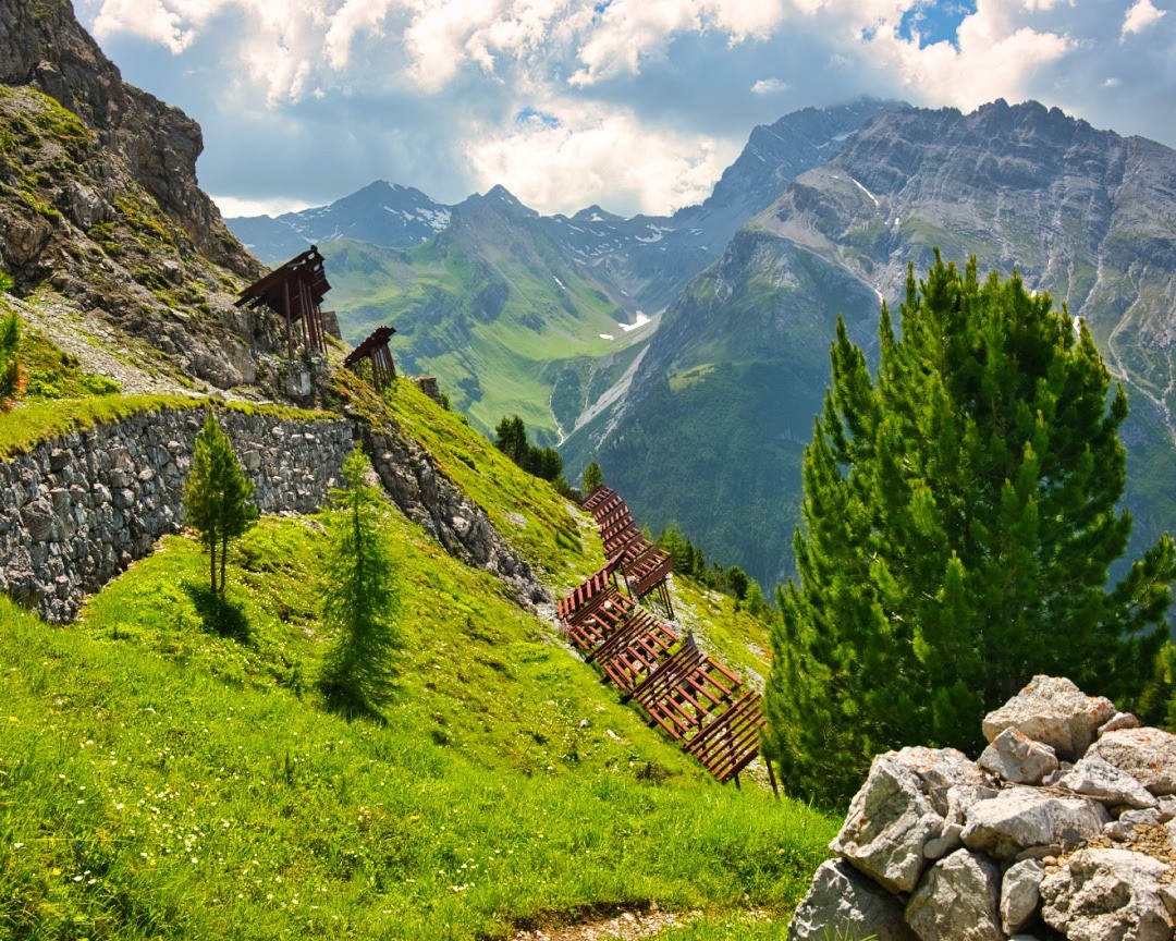 Auf dem markierten Wanderweg nach Bergün geht es jedenfalls weiter hinunter nach Muot. Hier durchqueren wir ein eindrücklich dichtes Netz an Steinmauern und Lawinenverbauungen, welche die tief unten gelegene Bahnlinie der RhB schützen. Danach kommen wir in den Wald, erreichen einen Forstweg bei einer Hütte mit Brunnen und kehren auf diesem ins Tal zurück. Über die Wiesen von Chaneletta, dem Campingplatz Albula und der Talstation der Sesselbahn Darlux kommen wir zum Ortseingang von Bergün und zum Ende unserer Tour.