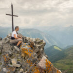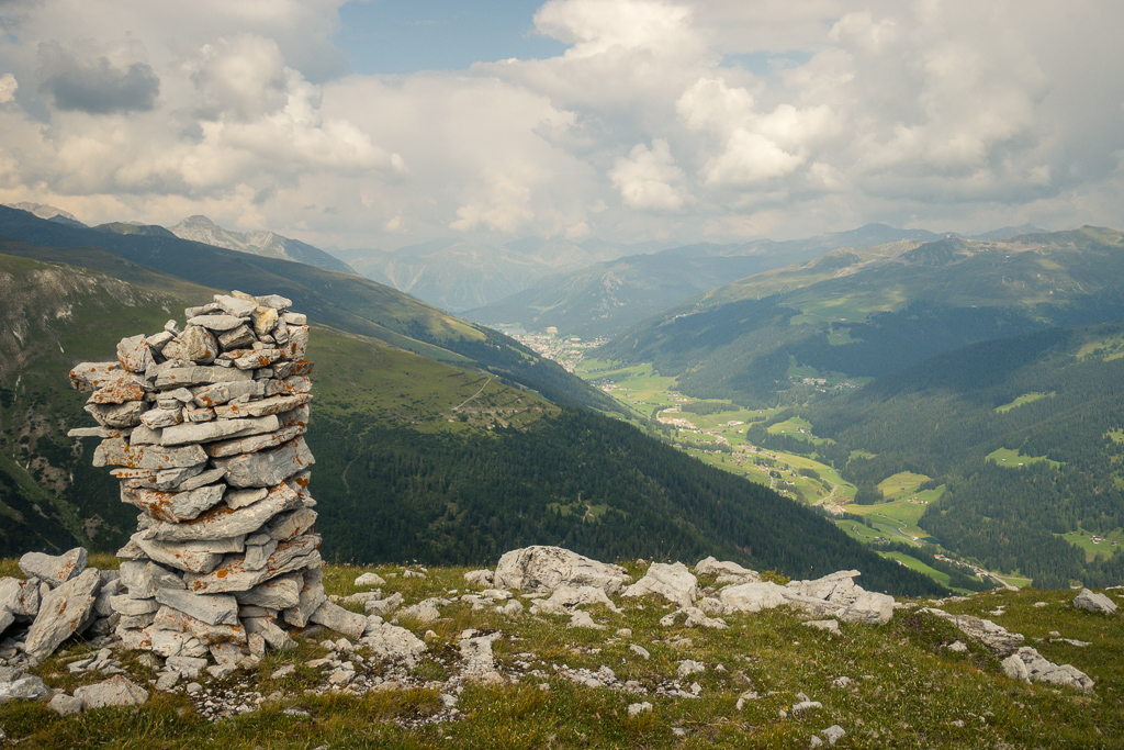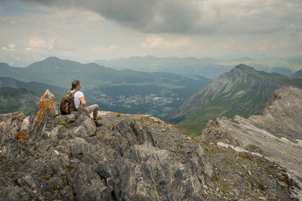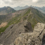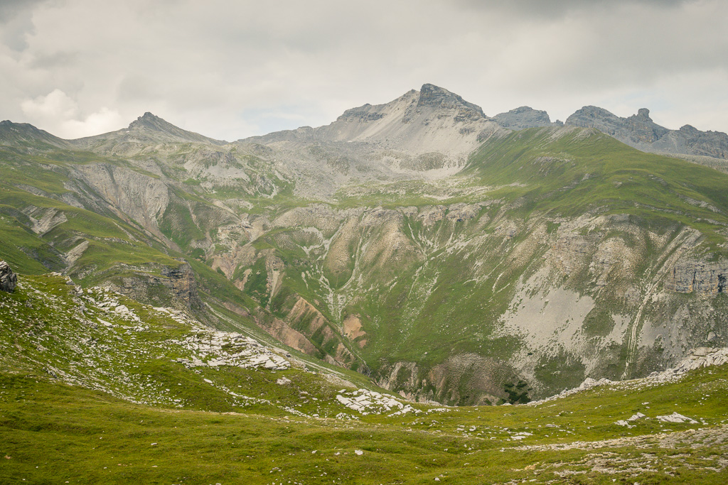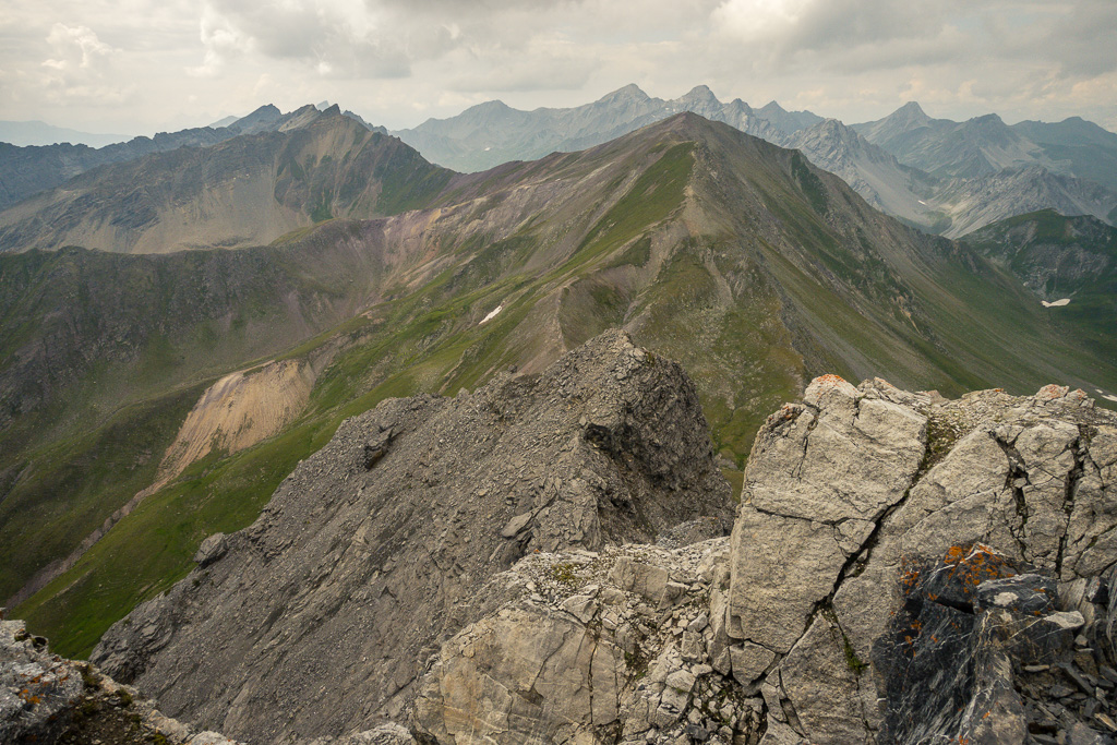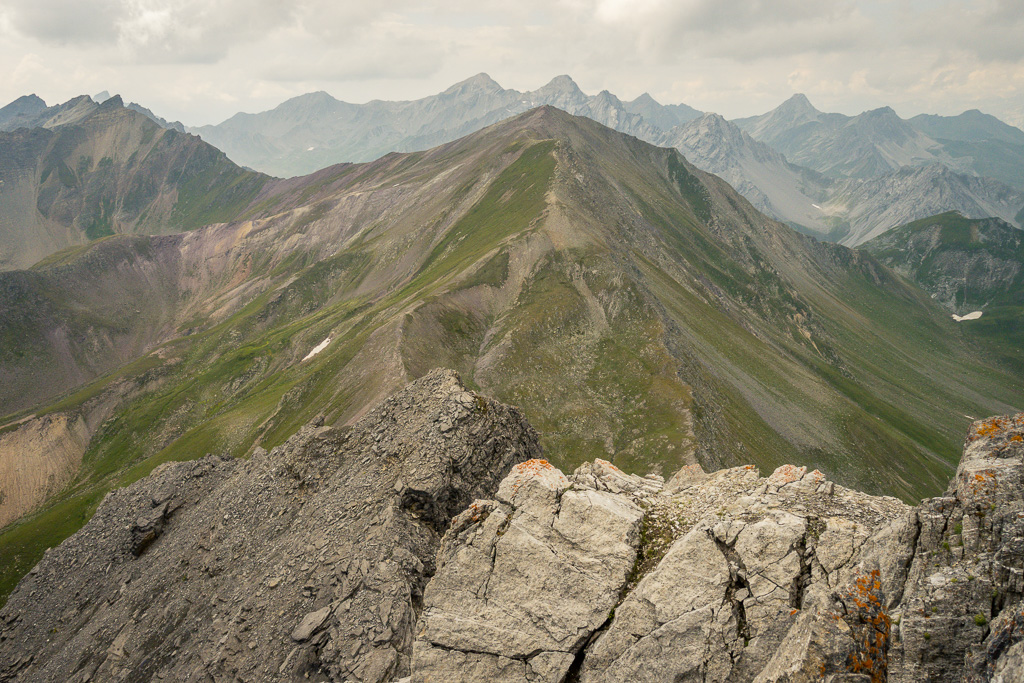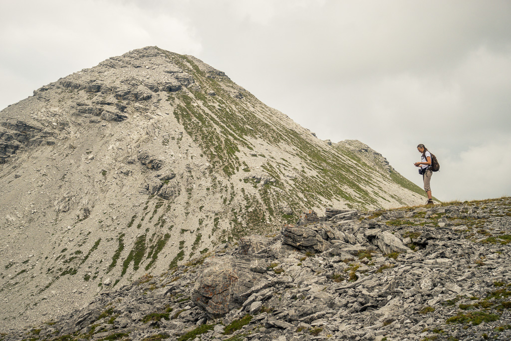 Immer in Richtung Gipfel, ab ca. 2200m auf steilen Grashängen und weiter oben in zunehmendem Geröll zu den Gipfelfelsen. Das letzte Teilstück im Fels wird auf der Grathöhe überwunden; Hindernisse und Felsaufschwünge können durchwegs einfach bis zum Gipfelkreuz überklettert oder umgangen werden.