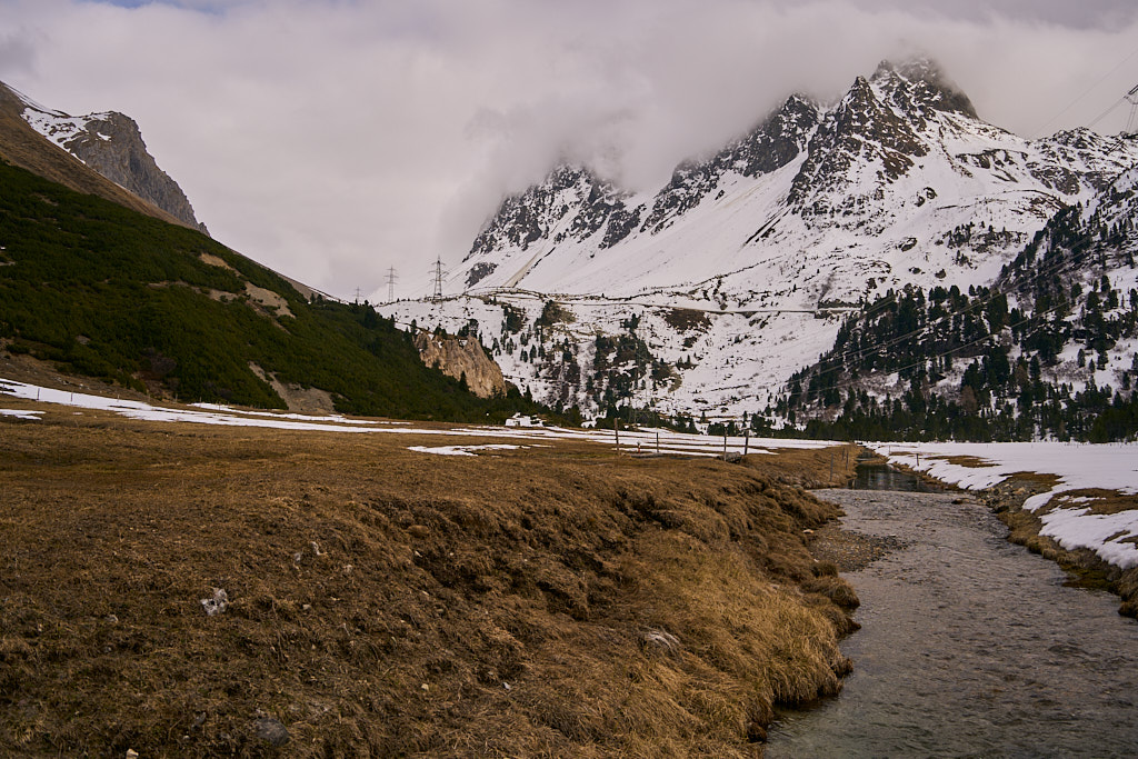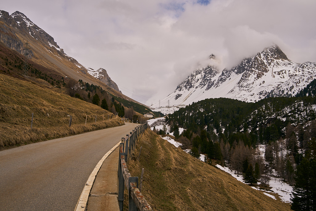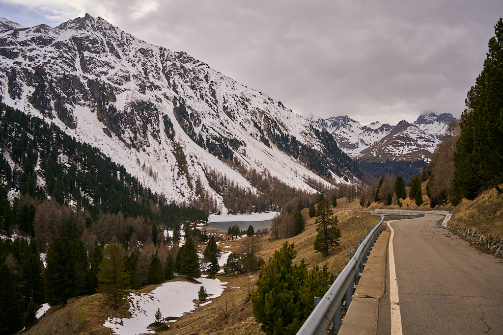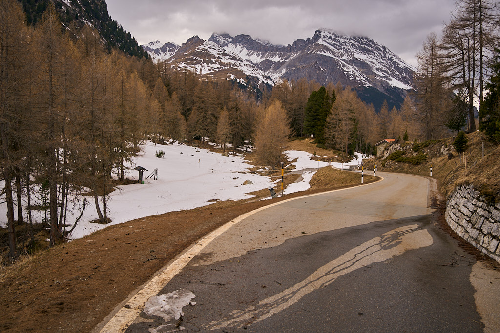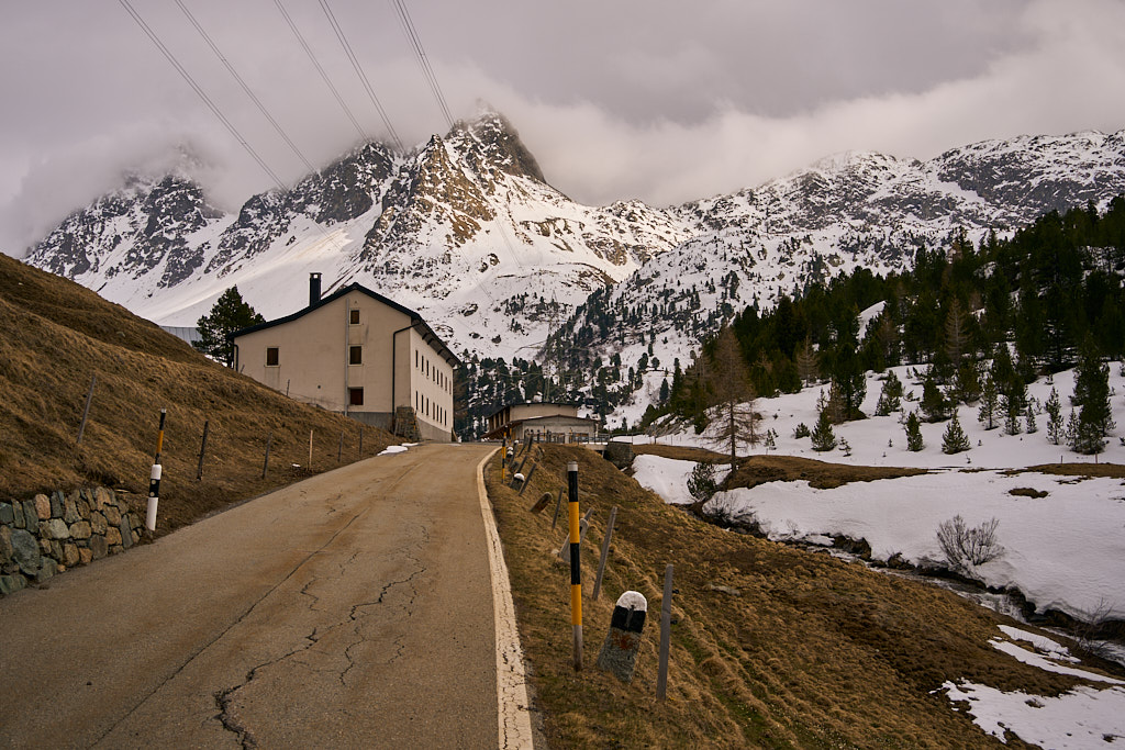 Ich beschloss, auf dem festgetretenen Schnee weiterzugehen. Fünfzig Meter weiter war der Schnee am Strassenrand schon etwas abgeschmolzen, danach kam wieder eine kompakte Schneedecke. So ging es die paar Kurven bis zum Lai da Palpuogna weiter, wo sich um diese Zeit niemand mehr weit und breit aufhielt. Das Wetter lud auch nicht gerade zum Bleiben ein; war es unten im Albulatal noch einigermassen erträglich kühl, wehte hier oben ein starker und unangenehm kalter Wind. Dichte Wolken verhüllten die meisten umliegenden Gipfel.