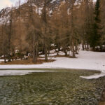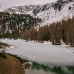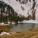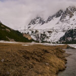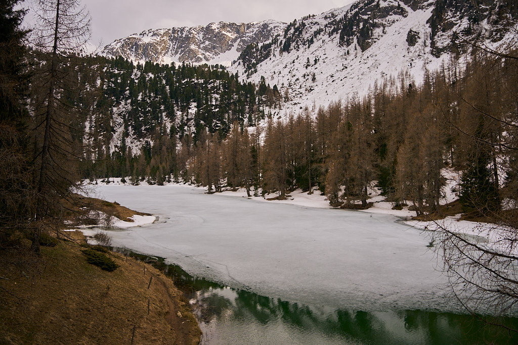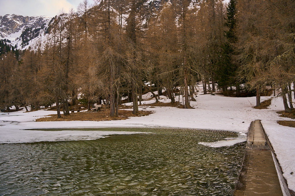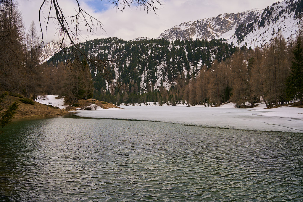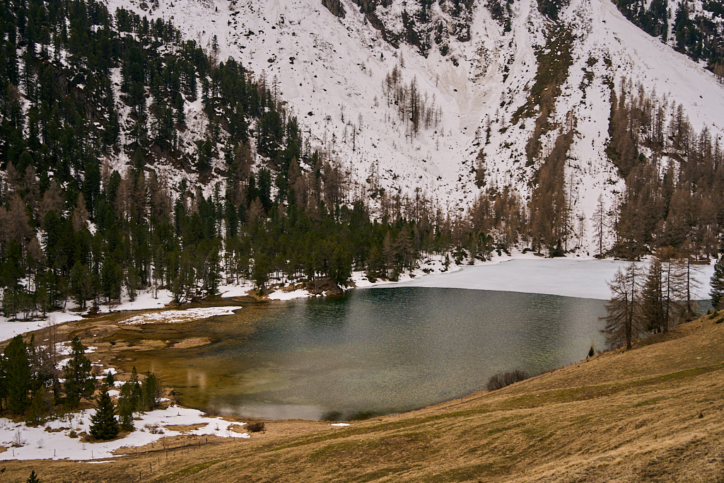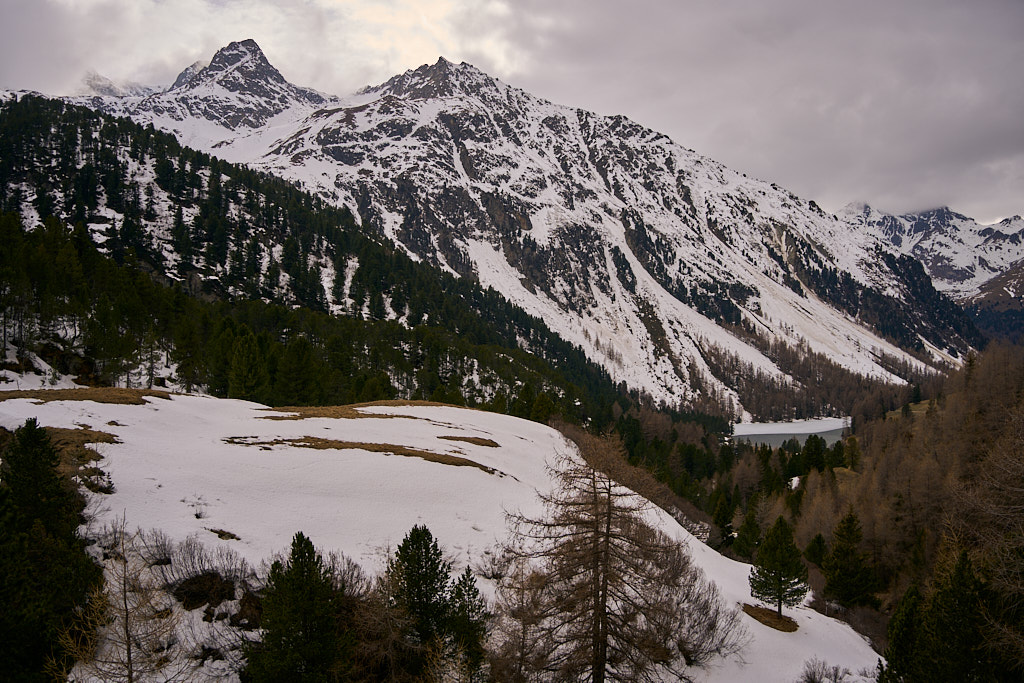 Ich beschloss, auf dem festgetretenen Schnee weiterzugehen. Fünfzig Meter weiter war der Schnee am Strassenrand schon etwas abgeschmolzen, danach kam wieder eine kompakte Schneedecke. So ging es die paar Kurven bis zum Lai da Palpuogna weiter, wo sich um diese Zeit niemand mehr weit und breit aufhielt. Das Wetter lud auch nicht gerade zum Bleiben ein; war es unten im Albulatal noch einigermassen erträglich kühl, wehte hier oben ein starker und unangenehm kalter Wind. Dichte Wolken verhüllten die meisten umliegenden Gipfel.