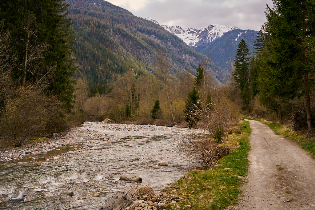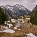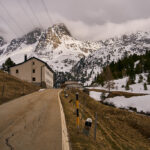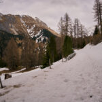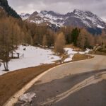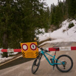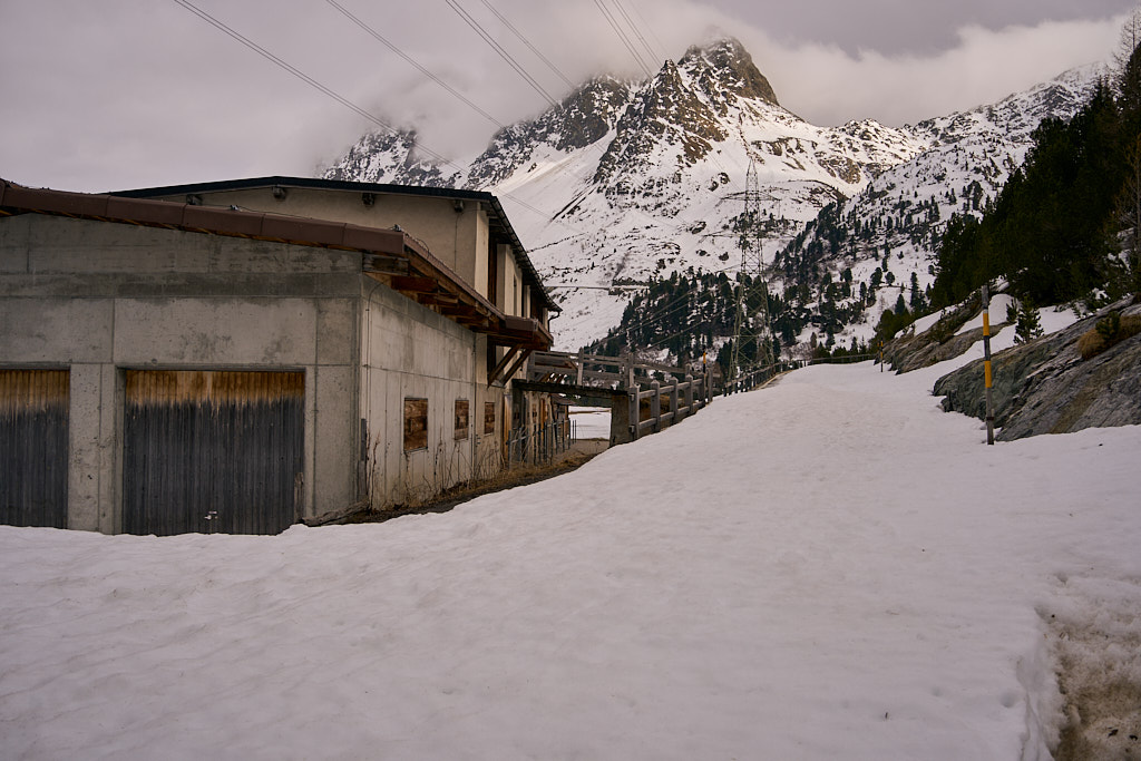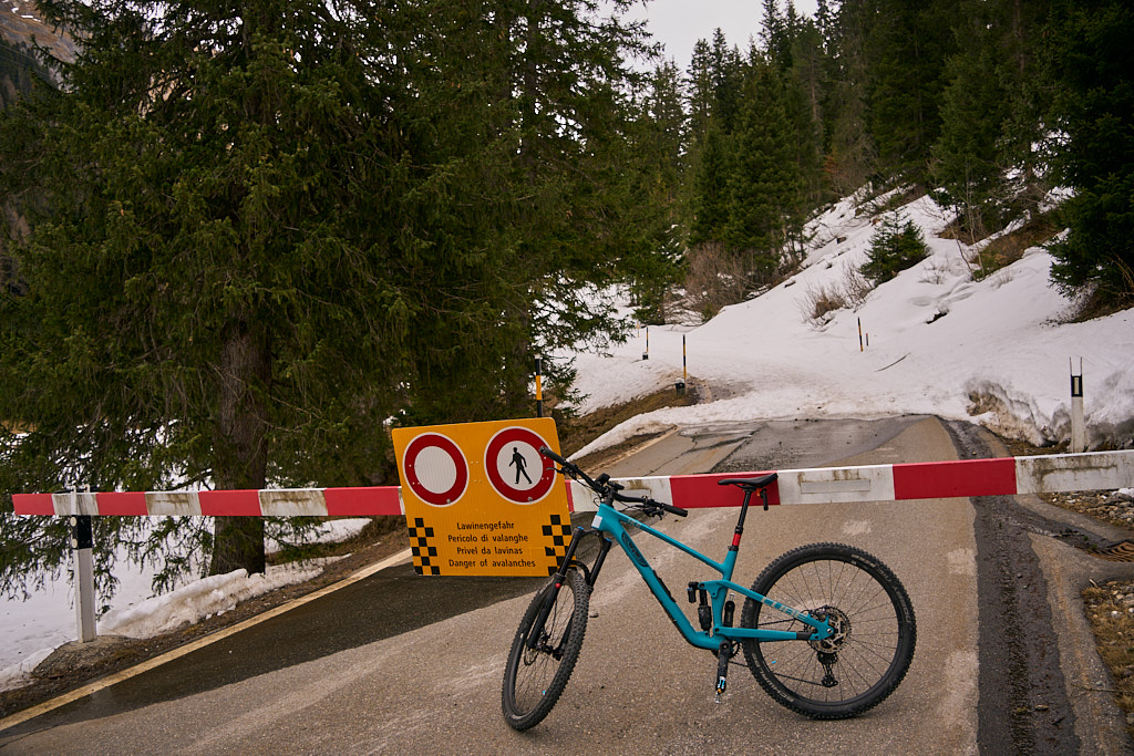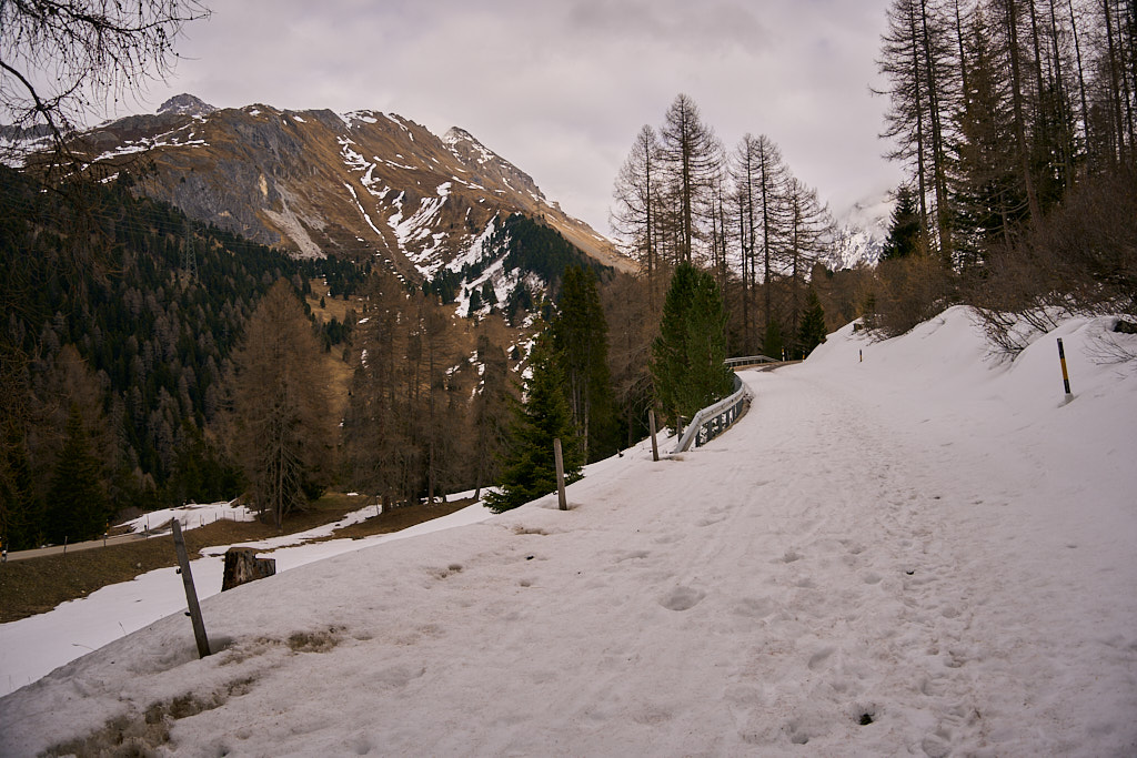 Von Bergün ging es dann auf der inzwischen fast leeren Strasse nach Preda. Etwas weiter oben traf ich dann auf die übliche Strassensperre. Im Vergleich zum letzten Mal war der Schnee zwar immer noch nicht geräumt, aber schon deutlich abgetaut. Zudem hatte sich in der Zwischenzeit ein veritabler Trampelpfad im Schnee herausgebildet. Radspuren waren aber keine zu sehen.