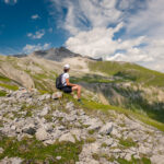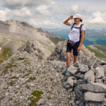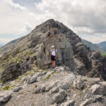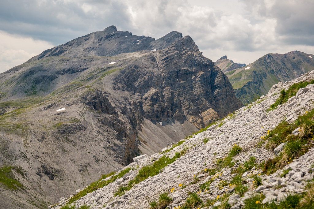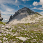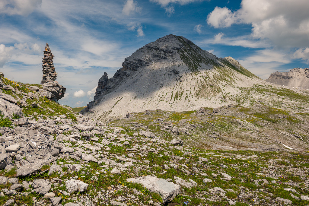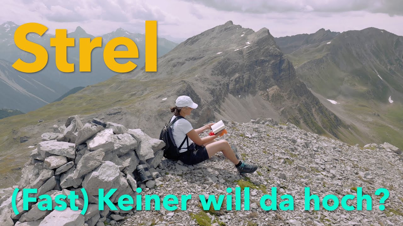 Ab jetzt weglos, etwas rechts ausholend über den Gras- und Geröllhang des Strel gerade empor zu seinem Westgipfel (T3). Der Hang wird nach oben hin steiler, ist aber auf Graspolstern und gröberen Geröllblöcken stets gut begehbar. Falls man auf die abwärts geschichteten Felsriegel kurz unter dem Gipfel trifft, lassen sich diese auf beiden Seiten im Geröll umgehen oder aber auch direkt überklettern. Auf dem Gipfel steht ein Steinmann mit einem Gipfelbuch von 2017 und erstaunlich wenigen Einträgen.