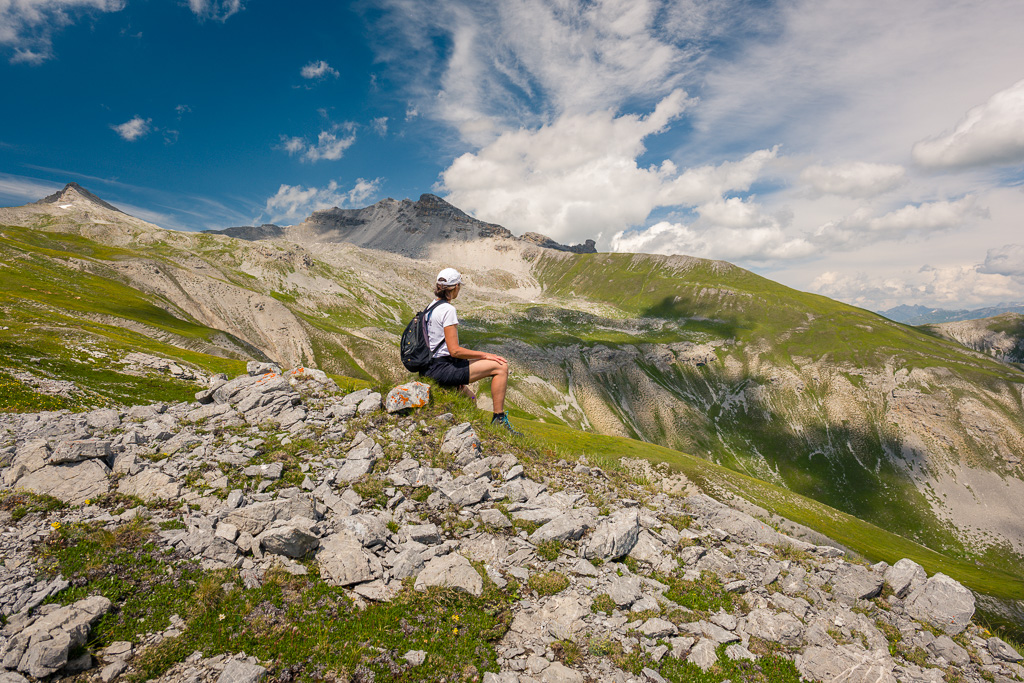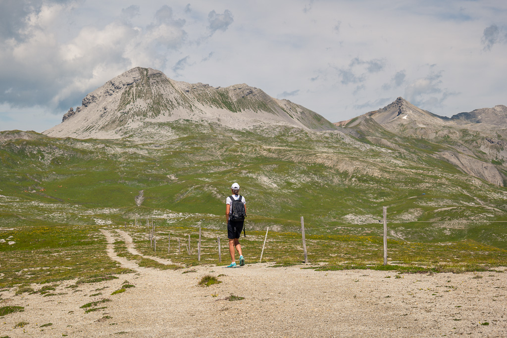 Von der Alvascheiner Alp zunächst weiter auf dem Alpweg bis zum Wegweiser nach Läger. Ab hier auf dem markierten Wanderweg zum allein auf weiter Ebene stehenden Holzschuppen von Läger, dann weiter zur von weitem sichtbaren kleinen Valbellahütte und von dort den rot-weissen Markierungen folgend zum Sattel am Alteiner Fürggli. Bisher hierher T1-T2 und keine Schwierigkeiten.