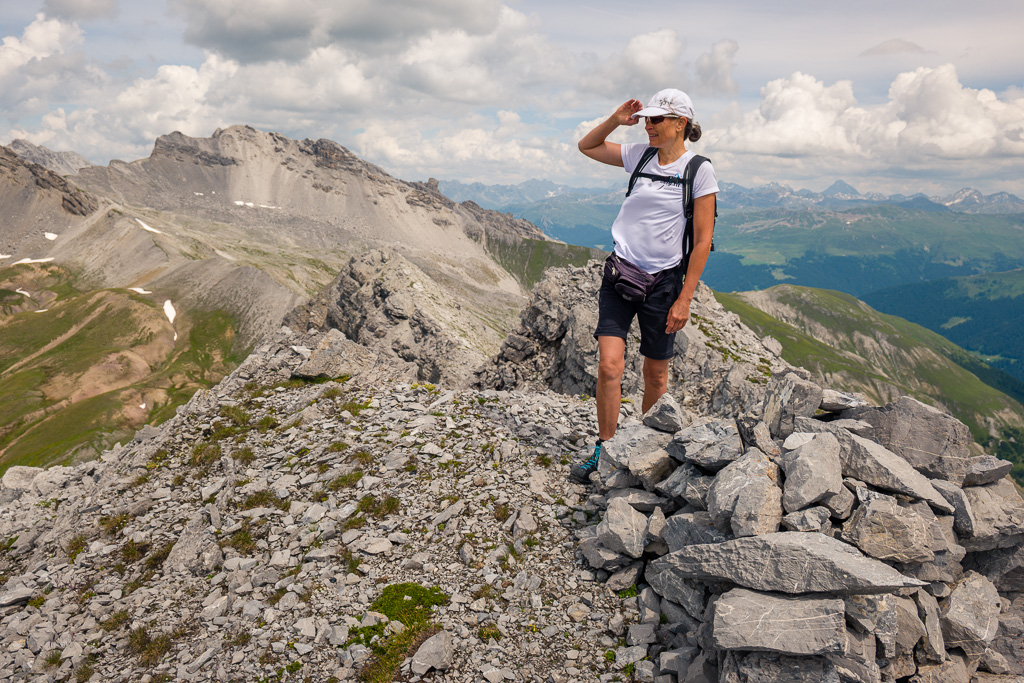 Vom Gipfel aus sind wir dem gesamten Grat bis zu seinem östlichen Ende gefolgt. Die Überschreitung ist eindrücklich und wirkt auf den ersten Blick schwieriger und heikler, als sie tatsächlich ist. Auf der Nordseite des Grats (gegen Arosa hin gesehen) brechen die schrägen Felsschichten senkrecht ab und bieten einen gar fürchterlichen Anblick. Man kann die Grathöhe selber aber durchwegs gut begehen. Wo immer man scheinbar auf einen jähen Abbruch im Grat zusteuert, öffnet sich beim Näherkommen stets der Blick auf gestuftes Schrofengelände, auf dem man leicht bis zum nächsten Aufschwung weiterkommt. Beim unauffälligen Ostgipfel verläuft der Grat dann wieder in einen einfachen Hang gegen die Bärentaler Furgga hinab.