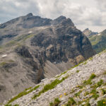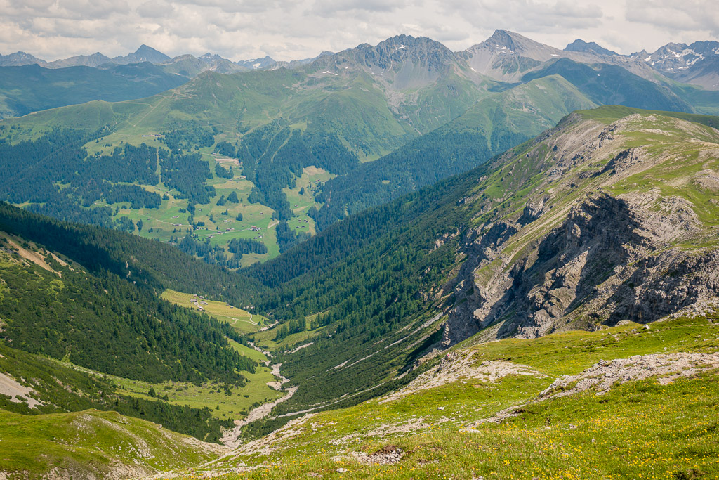 Nach der Abzweigung zur Alp Vedra geht es steil und eher mühsam auf einen ruppigen Karrenweg durch den Wald bis zur Waldgrenze. Wir lassen die Hütten der Alp Vedra auf einem Hügel links liegen und gehen stattdessen weiter geradeaus auf die etwas höher gelegenen Hütten der Alvascheiner Alp zu. Eine weit ausholende Kurve des Alpwegs kann im direkten Aufstieg zu den Hütten über Gras abgekürzt werden.