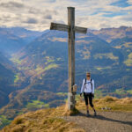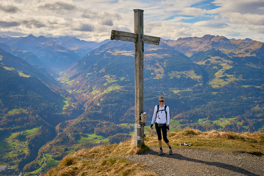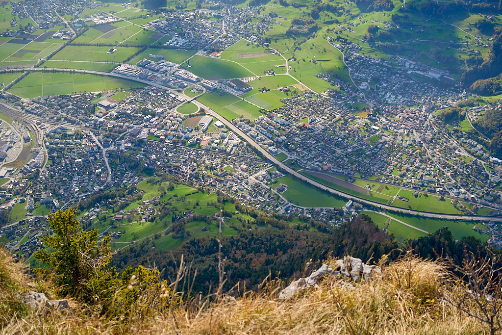 Das Gipfelkreuz stand auf einem kleinen Grasplateau, das nach Süden hin jäh und fast senkrecht abbrach. Man stand hier buchstäblich am Rand vom Abgrund. Die Aussicht war schwindelerregend und faszinierend zugleich. Unter den Schuhspitzen konnte man Sargans, die Industriegebiete von Mels, die Parkplätze und die Autobahnen sehen, auf denen die Autos im Sonnenlicht wie kleine Wasserperlen glitzerten. An den Hängen gegenüber waren das Weisstannental und die Flumserberge zu erkennen. Am Gipfel wehte ein kräftiger, frischer Wind. Da uns der Tiefblick etwas unheimlich vorkam, blieben wir nicht lange und machten uns bald wieder vorsichtig auf den Abstieg über den rutschigen Pfad nach Folla und zurück zu unseren Bikes bei den Rieterhütten.