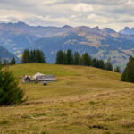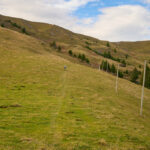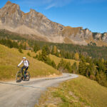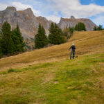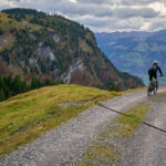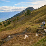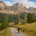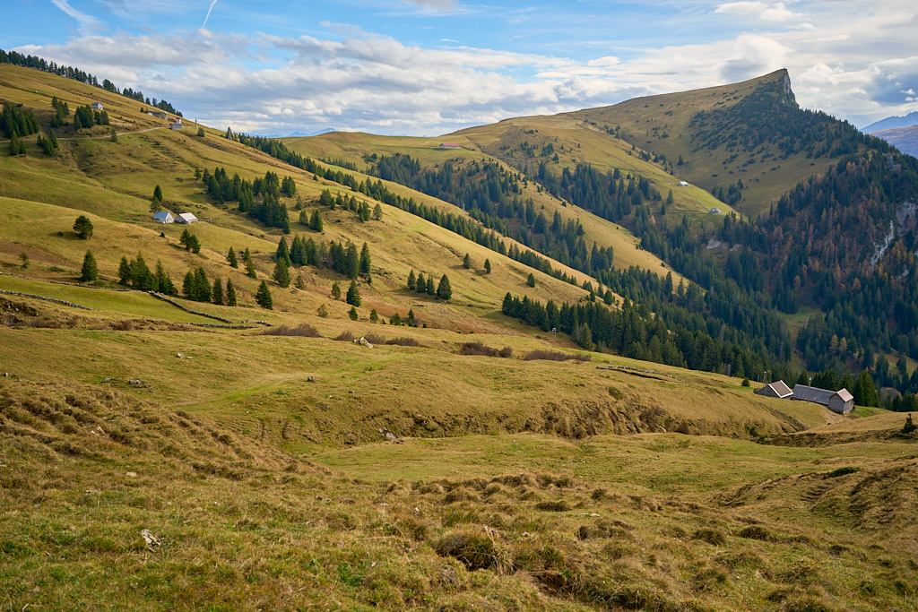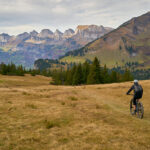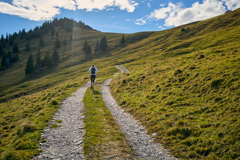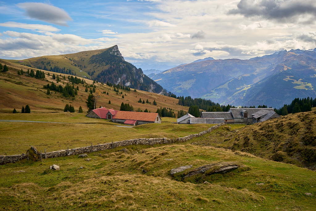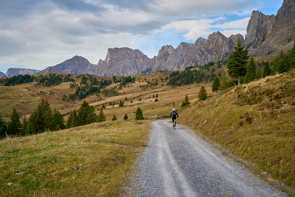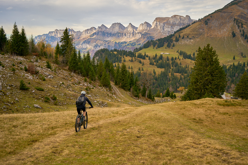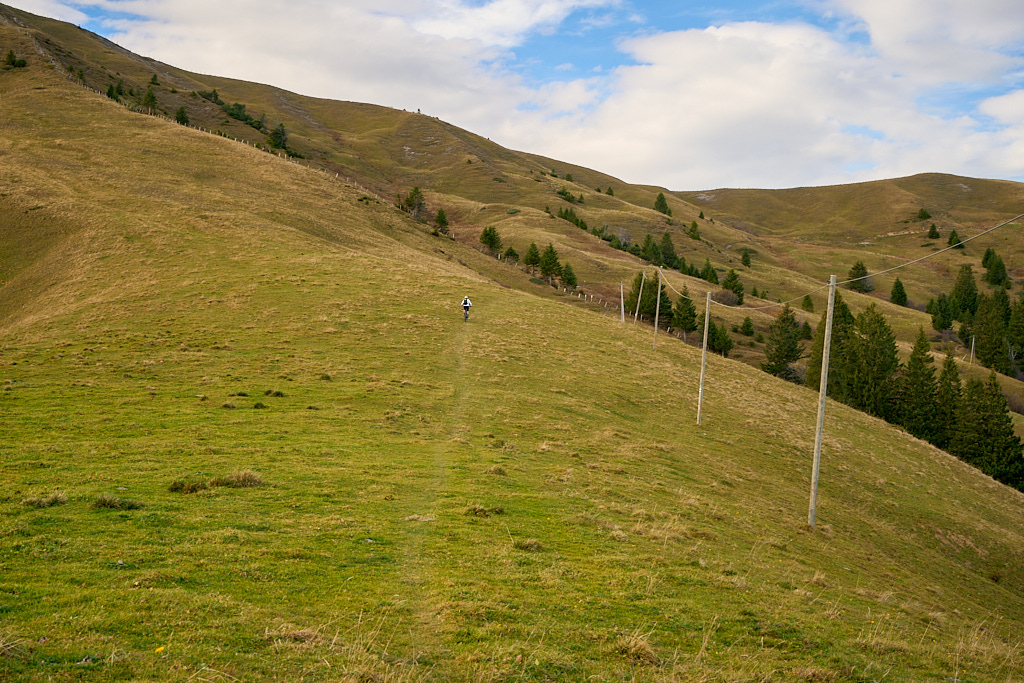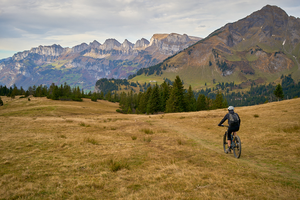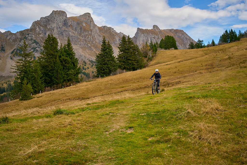 Hier kamen wir erneut zur Schlüsselstelle der Tour: der Abfahrt über die Sumpfwiesen zur Alp Castilu. Was mir beim letzten Mal auf dem Gravelbike (zum Glück nicht wörtlich) Kopfzerbrechen bereitet hatte, war diesmal auf dem Mountainbike ein pures Vergnügen. Das Gelände war heute trockener als damals und zudem folgte ich strikt den Wanderwegmarkierungen statt davon abzuweichen. In der Tat ist der Wanderweg tatsächlich die beste Fahrlinie auf dem weiten Hang.