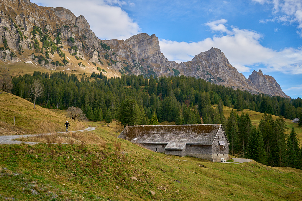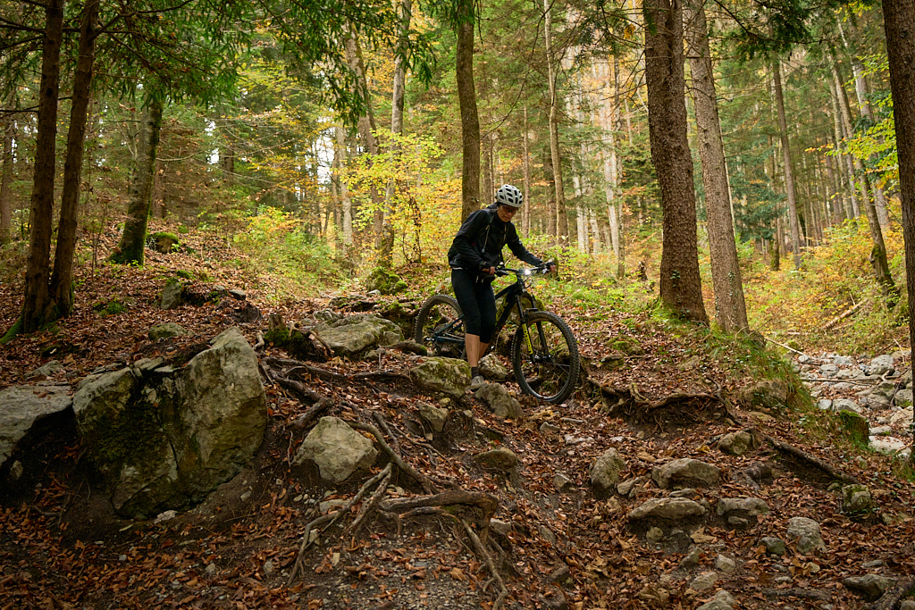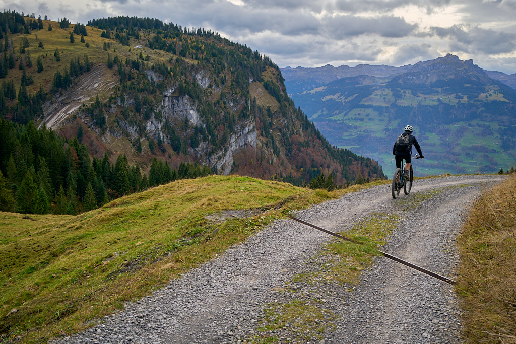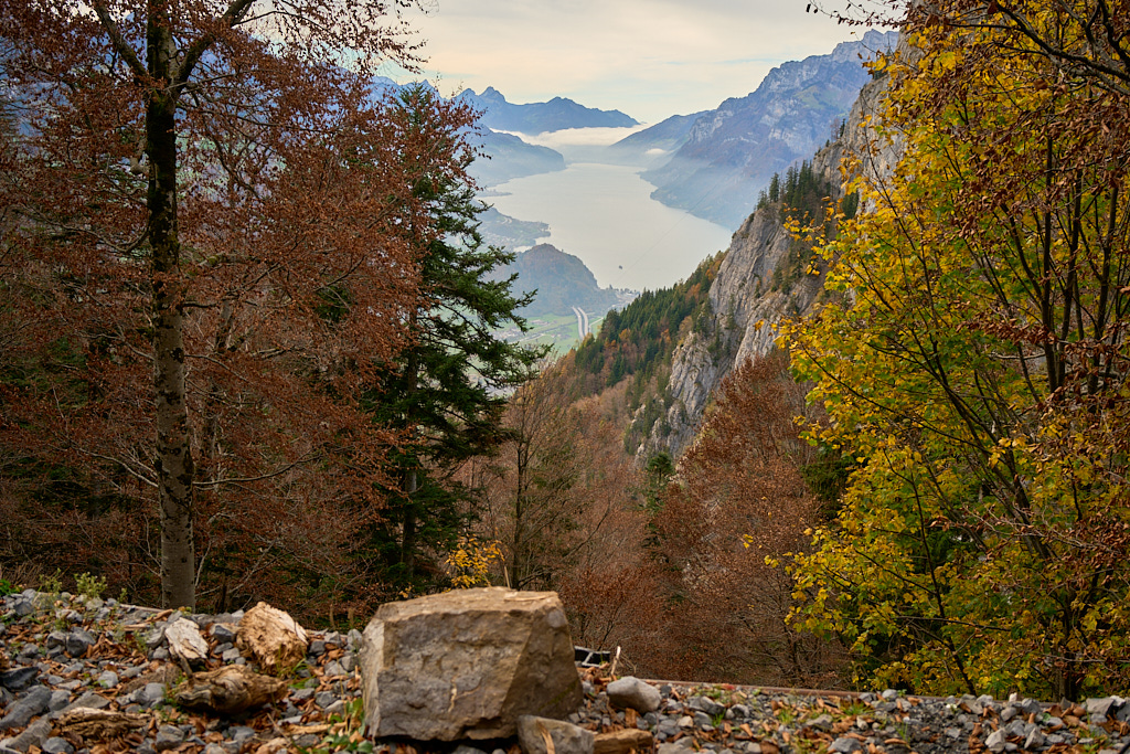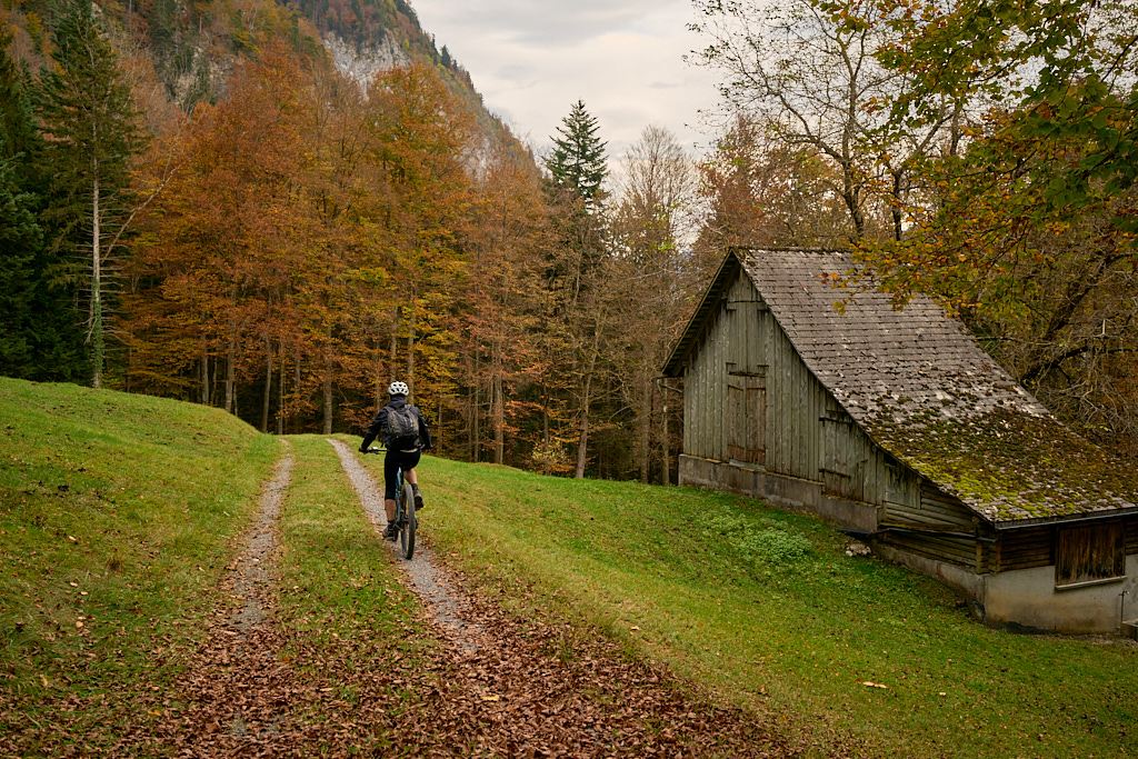 Nach der Alp Castilu begann die lange Abfahrt auf einem Schotterweg zur Sennisalp und von dort auf der kurvenreichen Strasse über die steilen Bergflanken ins Seeztal. Bisher war ich stets auf der Alptrasse bis an ihr Ende im Dorf Berschis gefahren. Heute wollten wir hingegen erstmals einen markierten Mountainbiketrail ausprobieren, der auf der Höhe von Forggels von der Strasse abzweigte und an mehreren Höfen vorbei zunächst leicht abfallend im Buechwald verschwand. Hier wurde es dann ernst: ein breiter, aber ziemlich verblockter und von dichtem Herbstlaub bedeckter Wanderweg führte steil zwischen den Bäumen hinab. Ich konnte ihn grösstenteils fahren, bei einigen Absätzen und Stellen mit nassem Laub und Felsen trug ich das Bike dann aber doch lieber.