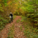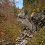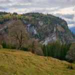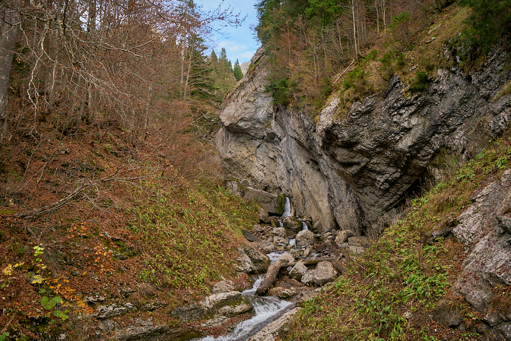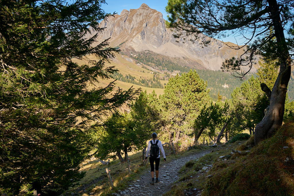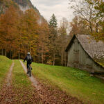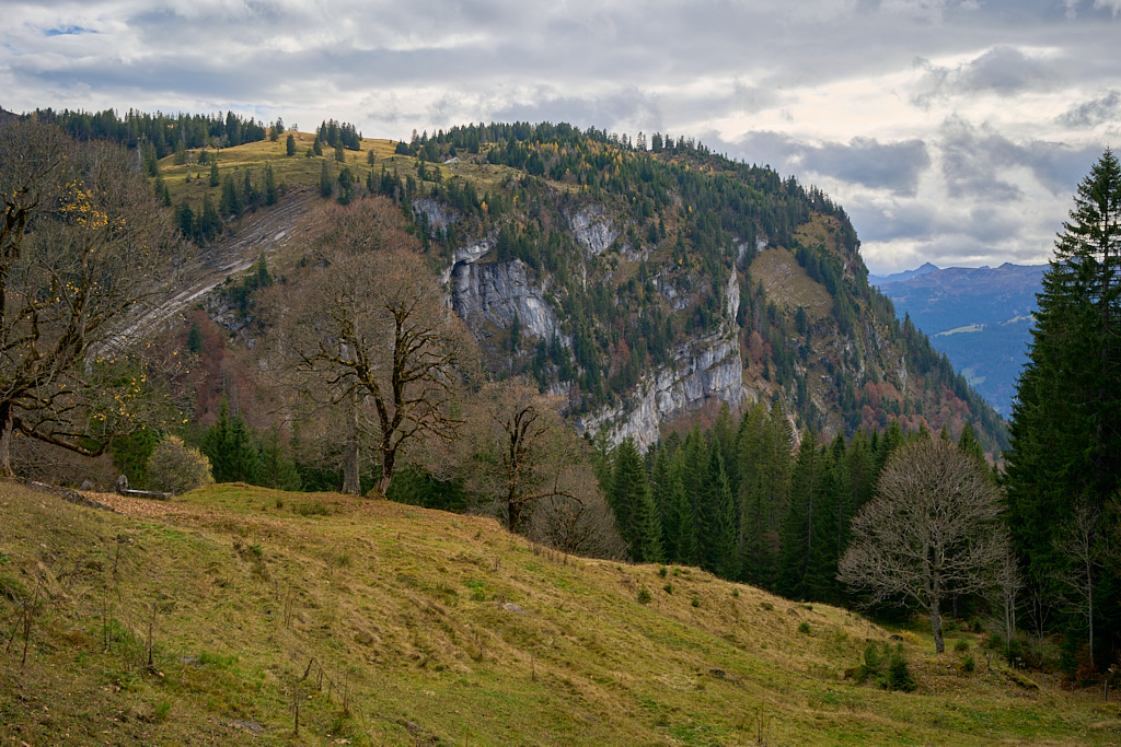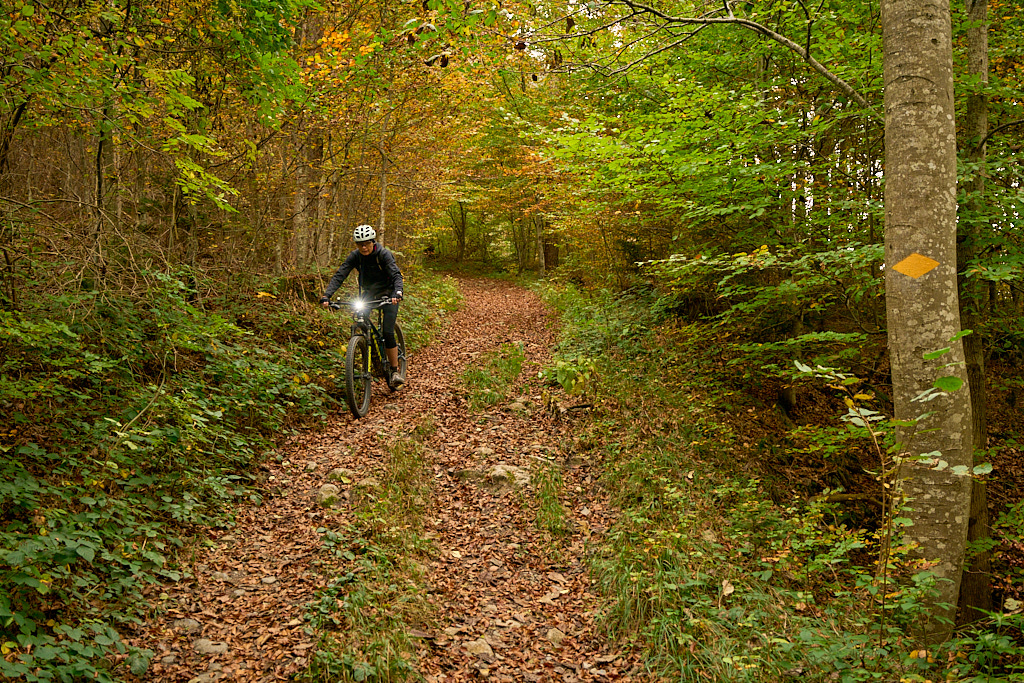 Nach der Alp Castilu begann die lange Abfahrt auf einem Schotterweg zur Sennisalp und von dort auf der kurvenreichen Strasse über die steilen Bergflanken ins Seeztal. Bisher war ich stets auf der Alptrasse bis an ihr Ende im Dorf Berschis gefahren. Heute wollten wir hingegen erstmals einen markierten Mountainbiketrail ausprobieren, der auf der Höhe von Forggels von der Strasse abzweigte und an mehreren Höfen vorbei zunächst leicht abfallend im Buechwald verschwand. Hier wurde es dann ernst: ein breiter, aber ziemlich verblockter und von dichtem Herbstlaub bedeckter Wanderweg führte steil zwischen den Bäumen hinab. Ich konnte ihn grösstenteils fahren, bei einigen Absätzen und Stellen mit nassem Laub und Felsen trug ich das Bike dann aber doch lieber.