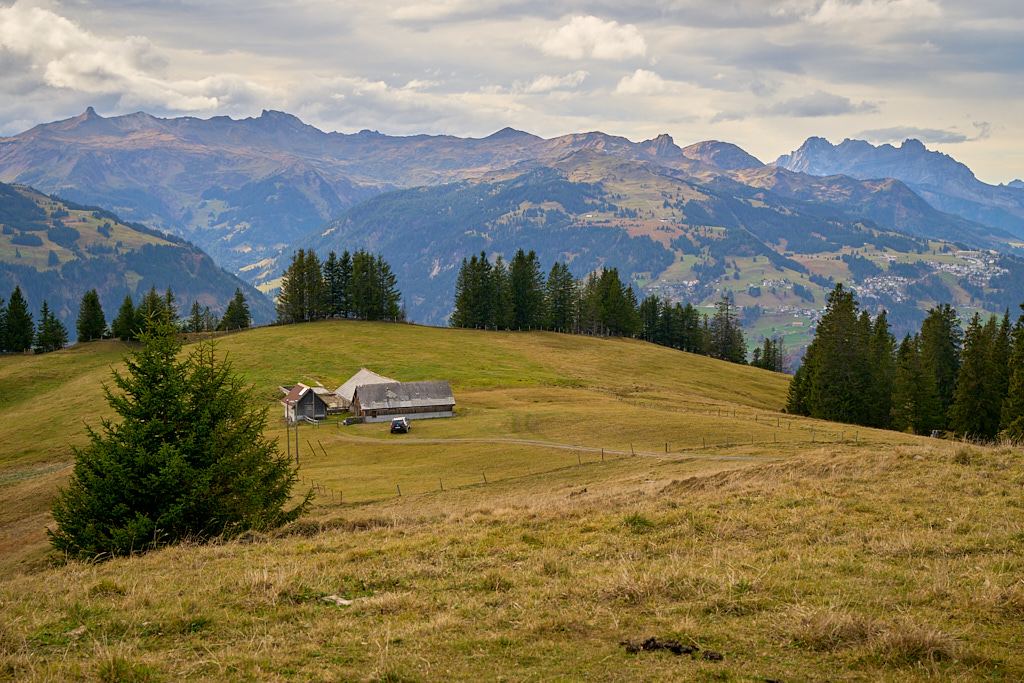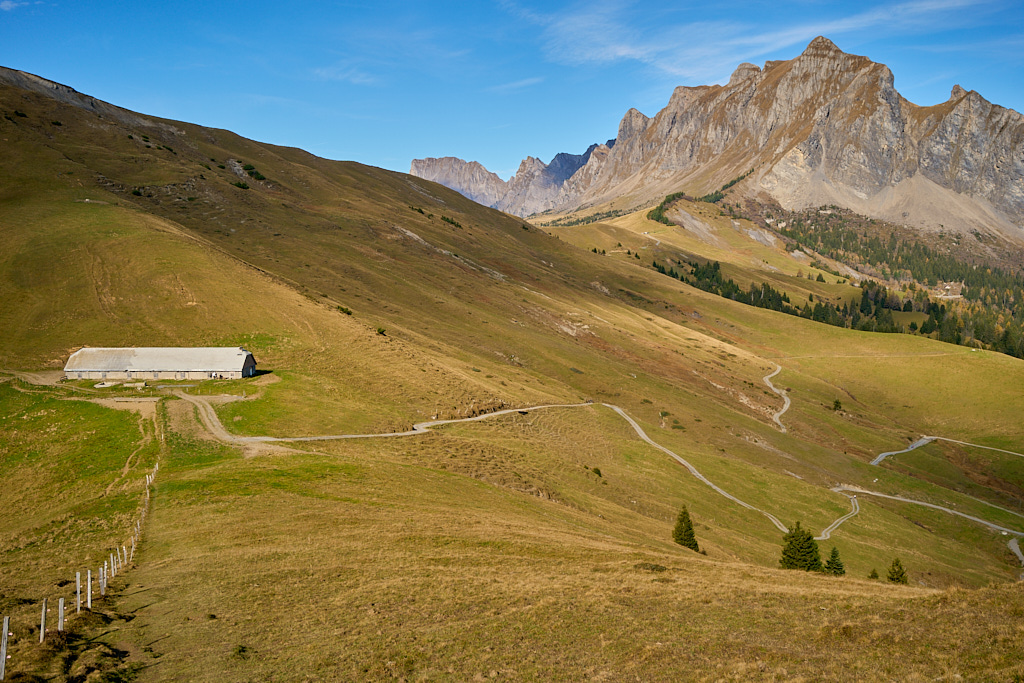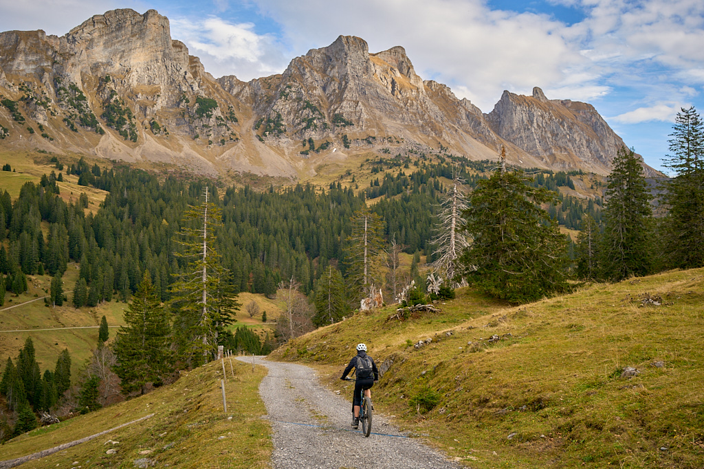 Wir hatten zunächst überlegt, auf dem Hinweg bis zur Strasse zum Palfris zurück und von dort aus zum Übergang beim Chamm zu fahren. Dies hätte allerdings einen Höhenverlust und Wiederaufstieg zur folge gehabt, den wir gerne vermeiden wollten. Auf der Karte sahen wir, dass ein direkter und nicht allzu langer Wanderweg von den Rieterhütten hinauf zur Strasse nahe beim Chamm eingezeichnet war. Wir hielten dies für die bessere Wahl, zumal die erste Weghälfte von den Hütten aus sogar noch halbwegs fahrbar aussah.