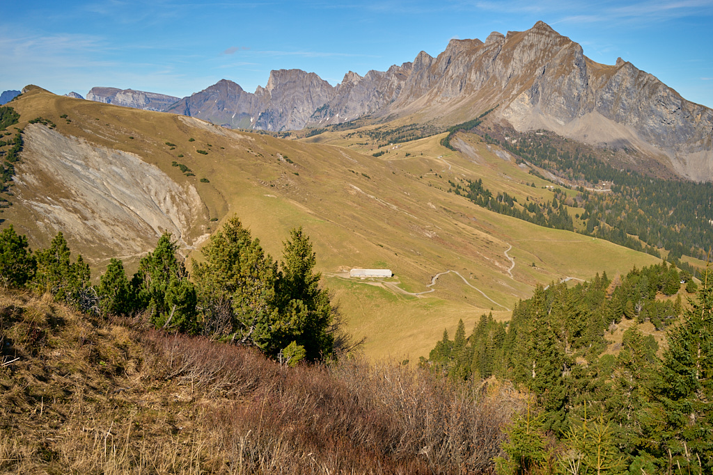 Nach dem noch verbleibenden, kurzen Aufstieg auf den Übergang ins Palfris beim Chamm hatten wir den höchsten Punkt der Tour erreicht und der genussvolle Teil der Tour konnte beginnen. Mit dem herrlichen Panoramablick auf die gegenüberliegende Talseite mit den Flumserbergen zur Linken und den wild gezackten Gauschla mit seinen Nachbarn zur Rechten querten wir entspannt die Hänge des Palfris über Vorderpalfris und Stralrüfi bis nach Rietälpli.