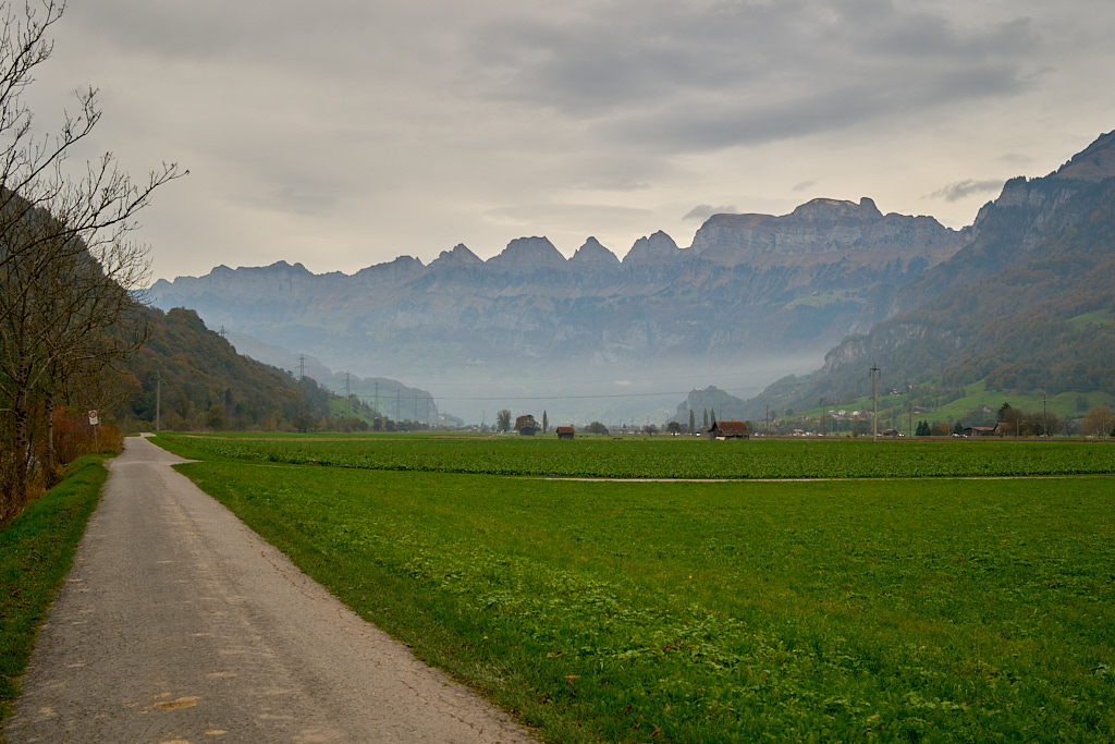 Auf einem Radweg unterquerten wir die Autobahn und gelangten auf der schnurgeraden Radroute über das Plonserfeld nach Mels. Wir fuhren von hier nicht wie neulich über Wangs und Vilters nach Bad Ragaz, sondern wählten den Radweg durch die Wohnviertel und der Bahnlinie entlang nach Sargans. Durch die Unterführung beim Bahnhof gelangten wir auf die weiten Felder zwischen dem Autobahnkreuz Sarganserland und den Rheinufer. Auf einem Feldweg ging es über mehrere Kilometer hinweg erneut schnurgerade bis zum Bahnhof in Bad Ragaz und zum Ende unserer Rundfahrt.