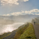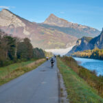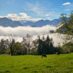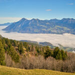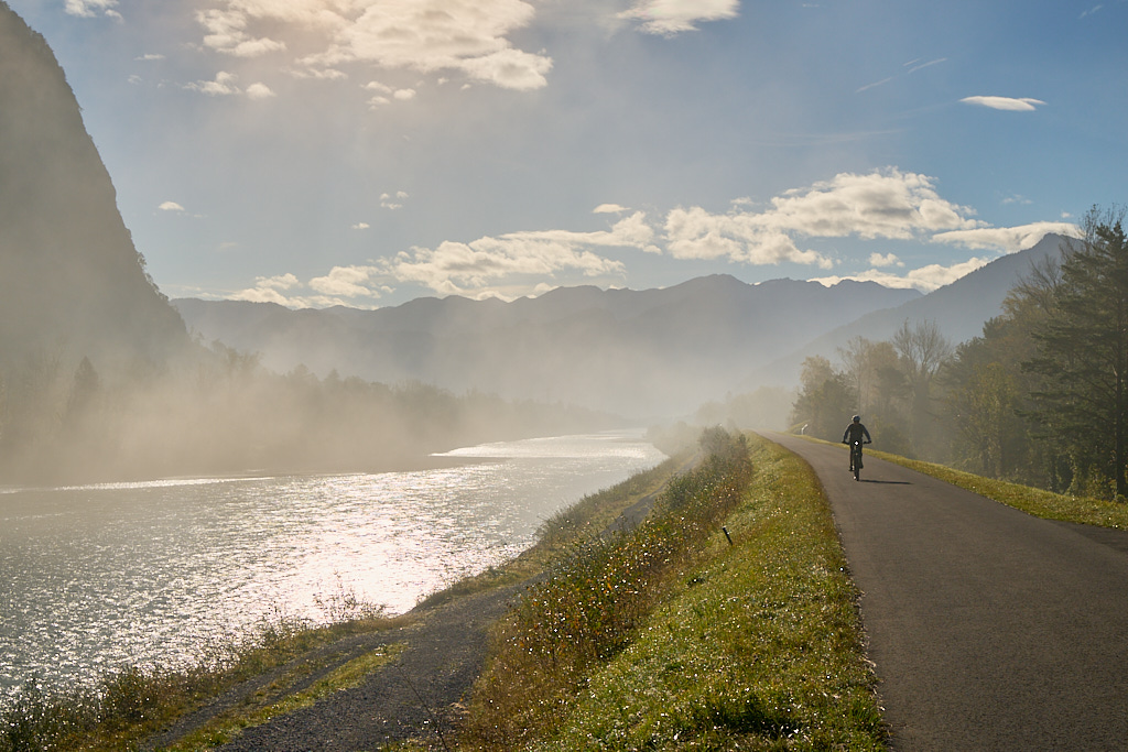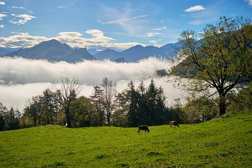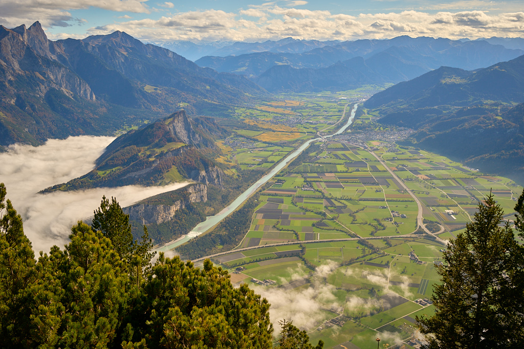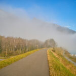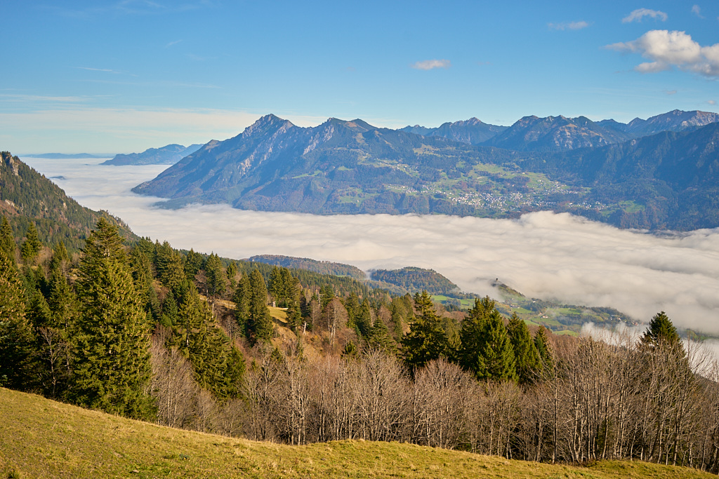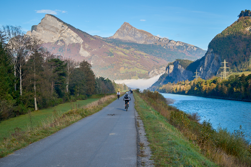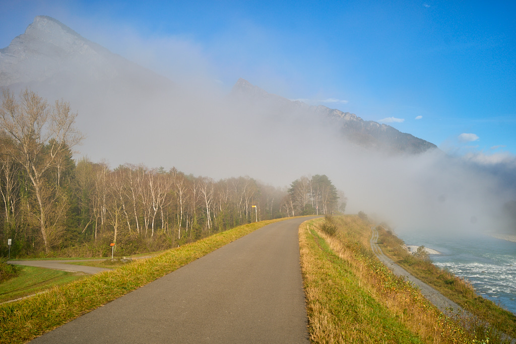 Da wir von Bad Ragaz aus starteten, verlängerte sich der gewohnte Routenverlauf (mit Start in Azmoos) diesmal um einige Kilometer. Auf dem Hinweg fuhren wir auf dem Uferweg am Rhein entlang nach Trübbach und wurden dabei Zeugen eines eindrücklichen Naturschauspiels. Im südlichen Rheintal und Sarganserland herrschte wolkenlos blauer Himmel und strahlender Sonnenschein, während nördlich davon eine dichte Nebeldecke bis hin zum Bodensee das Flachland überlagerte. Die Nebelsuppe wurde vom Fläscher Berg zwischeh Sargans und Balzers zurückgehalten. Immer wieder schwappten jedoch einzelne Nebelschwaden nach Sargans über wie Trockeneis, das über einen Tellerrand kriecht. Je mehr wir uns Trübbach näherten, desto mehr kamen wir in dieses Wechselspiel zwischen Sonne und Wolken, die malerisch über dem Rhein lagen.