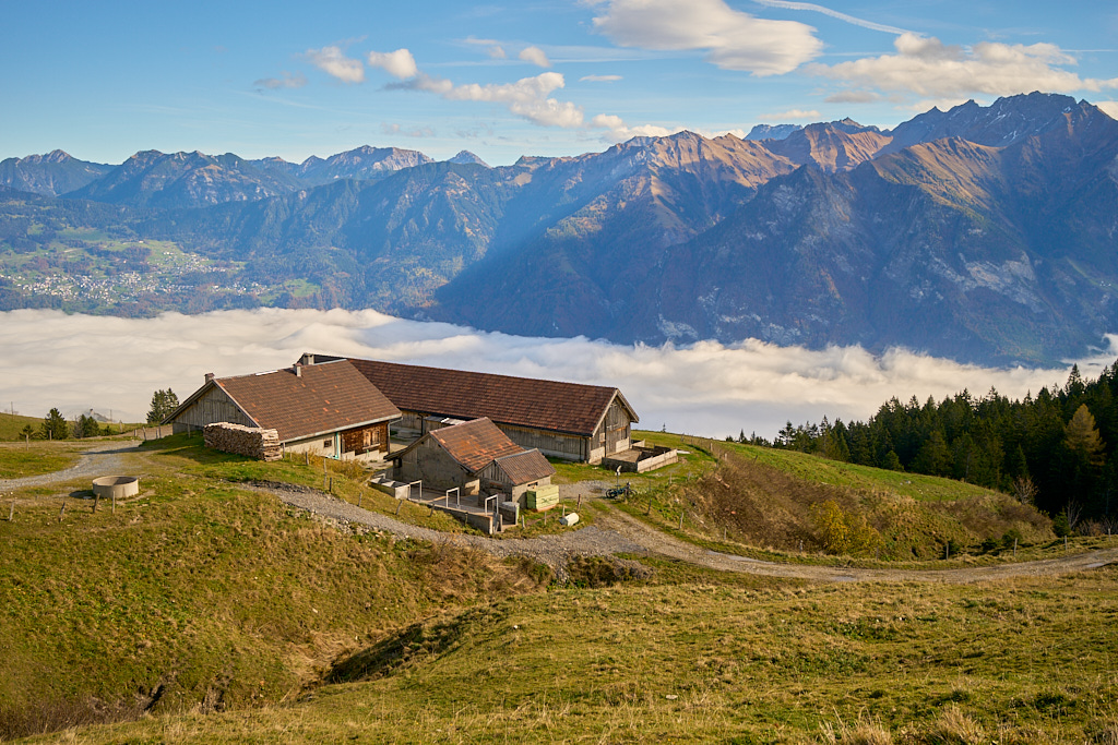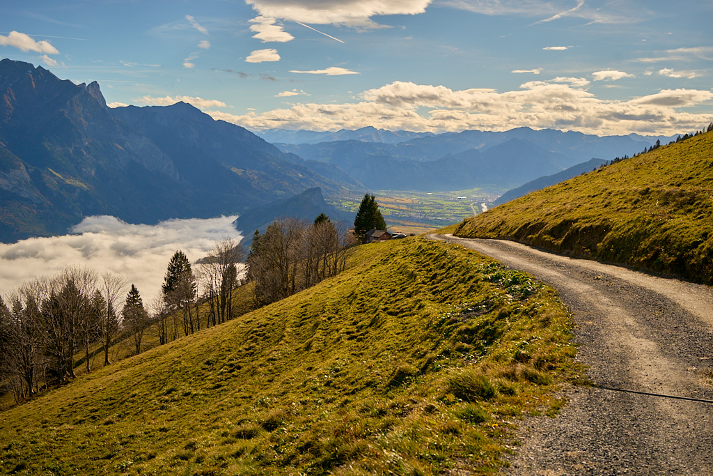 In Trübbach teilte sich der Weg in die Strasse nach Azmoos, von wo aus ich bis anhin immer in weiten Schleifen nach Palfris aufgestiegen bin, und einer direkteren (und damit auch steileren) Abkürzung auf einem Feldweg, der 200 Höhenmeter weiter oben wieder in besagte Strasse nach Palfris einmündete. Der Übergang vom flachen Rheinuferweg zum happigen Anstieg auf Schotter kam für mich etwas abrupt. Schwitzend mühte ich mich nach diesem Kaltstart über die Nebelgrenze hinauf und war froh, als die asphaltierte und weniger ansteigende Strasse erreicht war. Das nächste Mal würde ich wohl lieber wieder die bequemere Variante über Azmoos wählen.