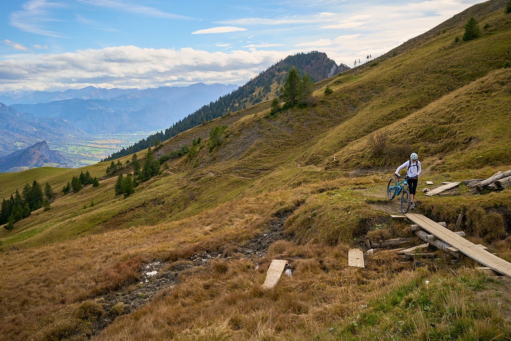 Unsere Einschätzung bestätigte sich – bis wir ans Ende der ersten Weghälfte gelangten. Dort ging der bislang breite Wiesenpfad abrupt in einen verblockten und matschigen Weg über, der sich mit abrupten Steigungswechseln dem Hang entlang zum Chamm hinauf zog. Zu allem Überfluss war dies auch noch ein Sumpfgebiet, sodass immer wieder schmale Holzstege über grosse Schlammtümpel mit den Bikes unter den Armen balancierend zu überschreiten waren. Nur selten waren Weg und Steg breit genug, um das Bike schieben zu können.