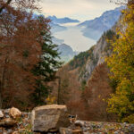 Danach ging es weiter wie gewohnt in vielen Kurven durch den Wald aufwärts in Richtung „Chamm”, dem Sattel zwischen Gonzen und Gauschla und Übergang nach Palfris. Diesmal allerdings mit dem Ausblick auf den sich bis zum Horizont erstreckenden Bodennebel im Rheintal, der auch am Mittag keine Anstalten machte, sich aufzulösen. Auf 1363m erreichten wir die Abbiegung zum Scheidweg, der um mehrere Geländekanten herum zu den Rieterhütten auf der Alp Riet nördlich vom Gonzen führte. Hier liessen wir unsere Bikes zurück und machten uns zu Fuss auf den Weiterweg zum Gipfel.