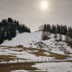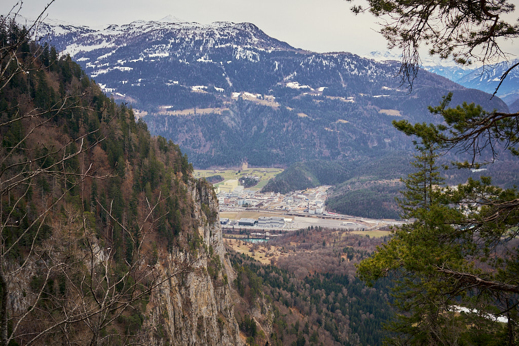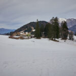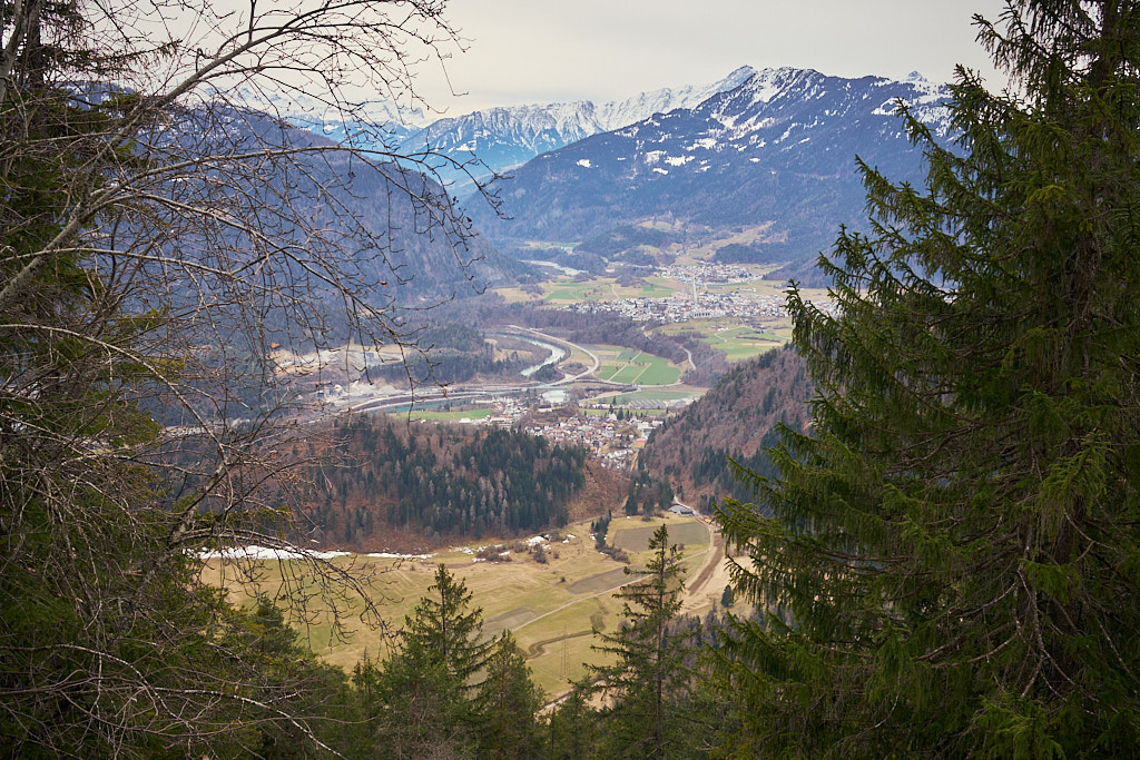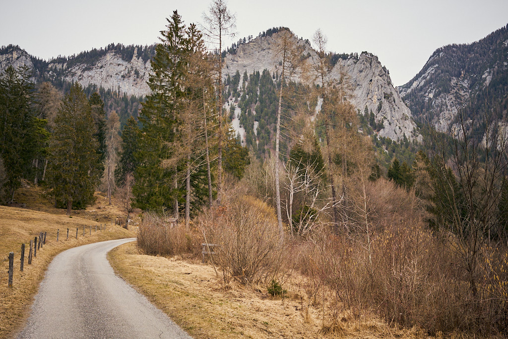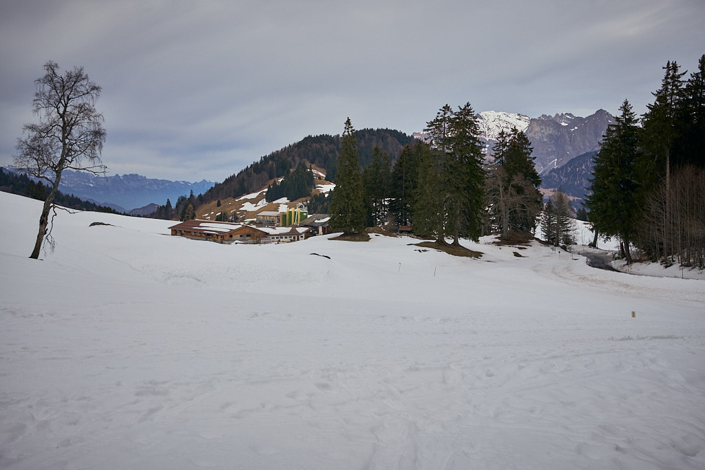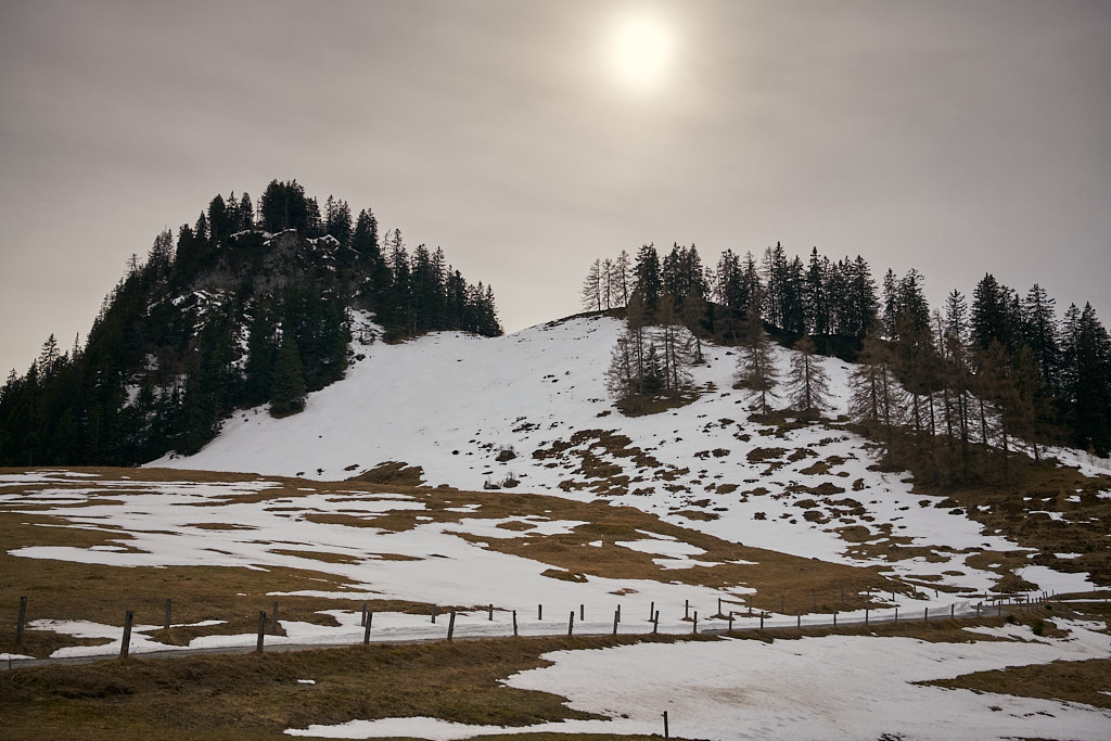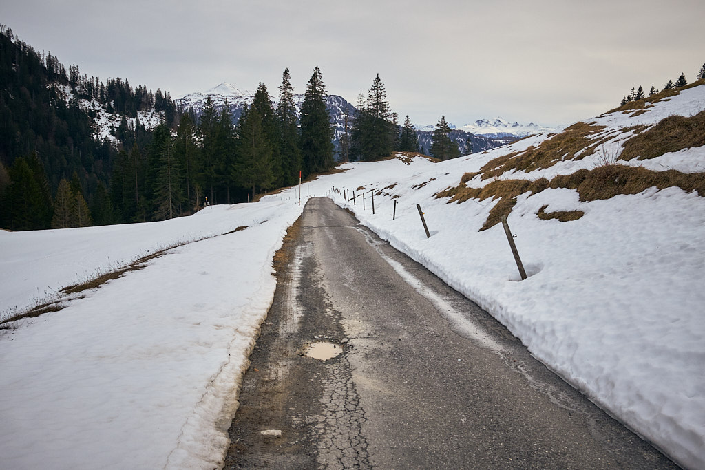 Zügig und leicht bergab erreichte ich nun (immer noch zu Fuss) den Übergang am Fürgglichopf, auf dessen anderer Seite ein Fahrweg nach St. Margarethenberg führt. Ich hatte fest damit gerechnet, dass der Spuk hier nun ein Ende hätte und traute deshalb meinen Augen nicht, als ich jenseits vom Übergang auf weisse Hänge schaute, soweit das Auge reichte. Zum Glück stellte sich aber heraus, dass die Strasse von St. Margarethenberg zum nahegelegenen Wanderparkplatz schwarz geräumt und (wenn auch wegen Nässe und möglicher Glätte vorsichtig) befahrbar war.