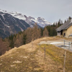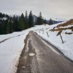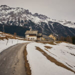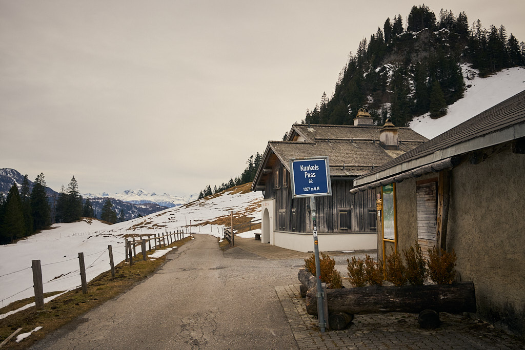 Die Strasse hinter Vättis nach Kunkels war trocken und schneefrei. Auch auf den weiten Weidehängen am Wegrand (ein offenbar beliebtes Langlaufgebiet im Winter) waren nur noch spärliche Schneereste zu sehen. Ich entschied mich daher für die Weiterfahrt. Ich empfand diese Etappe von Vättis zum Kunkelspass dann auch als den bisher schönsten und entspannendsten Teil der Strecke. Da die Fahrstrasse für Autos (noch) gesperrt war, hatte ich den Weg auch völlig für mich allein. Der Aufstieg kam mir trotz den verbleibenden 300 Höhenmetern recht kurzweilig vor und bald kurbelte ich schon um die letzten schneefreien Wegbiegungen im Wald herum zu den Hütten auf der Passhöhe. Hier genoss ich den Blick auf die noch tief verschneite Berglandschaft weiter oben, die wir im letzten Herbst auf einer Biketour zur Ringelspitzhütte besuchten.