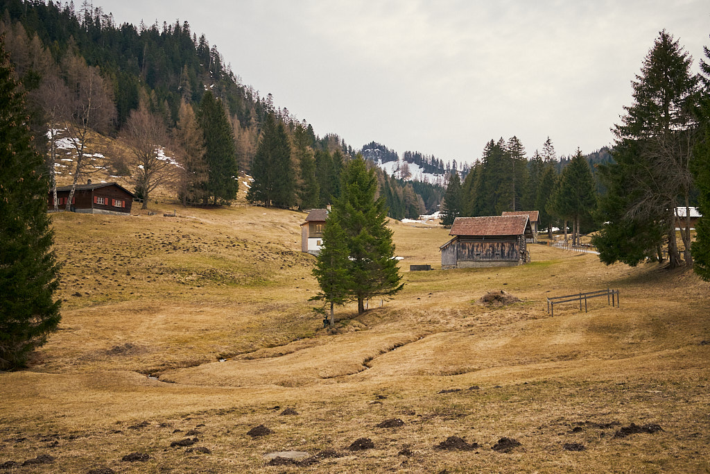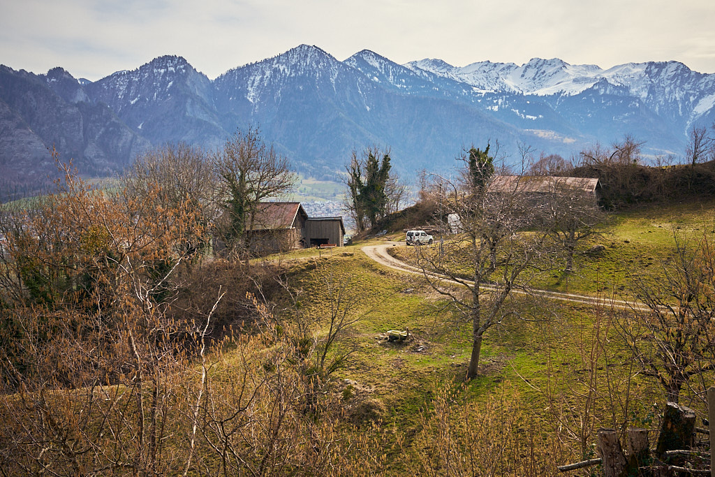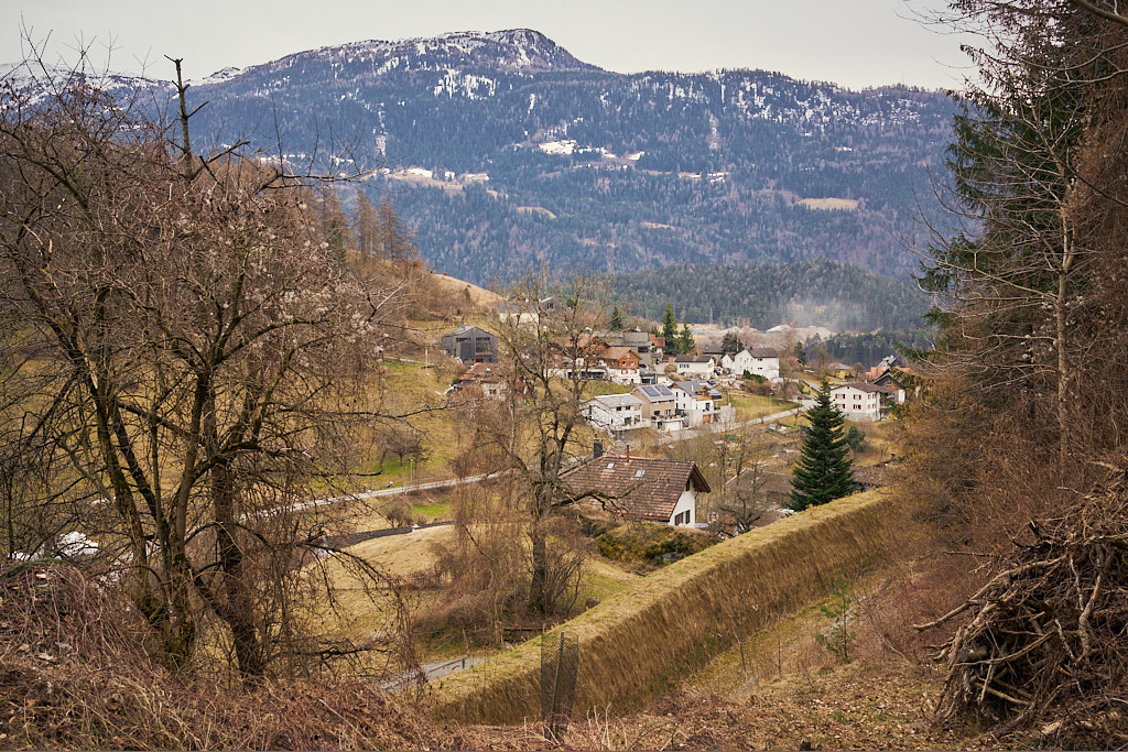 Kurz vor Untervaz verliess ich den Radweg und gelangte über eine Fussgängerbrücke auf die andere Rheinseite und über Felder weiter ins Dorfzentrum. Dort begann der Aufstieg, dessen erster Teil deckungsgleich mit früheren Touren durchs Churer Rheintal nach Norden verlief. Bei P.693 zweigte ich diesmal aber auf einen kurzzeitig sehr anstrengenden Karrenweg zu den Hütten von Pravia ab. Hinter Pravia verbesserte sich die Unterlage dann zu einem normalen Forstweg, dessen Steigung mir allerdings weitere Anstrengungen abnötigte.
