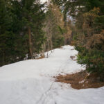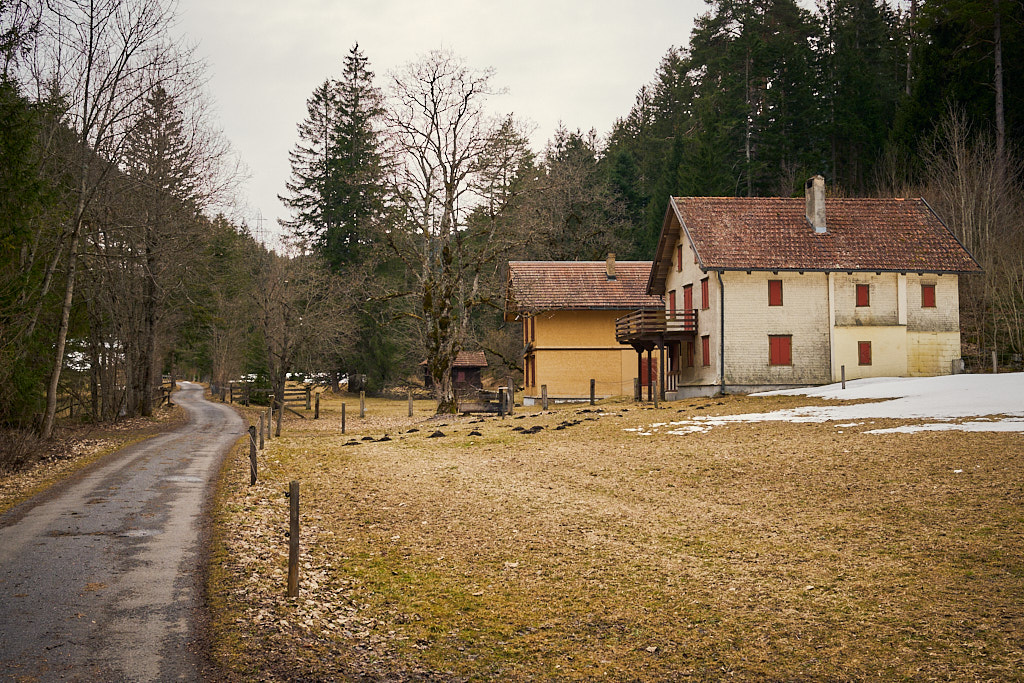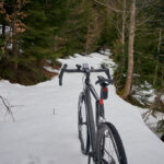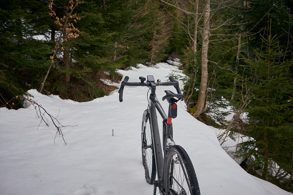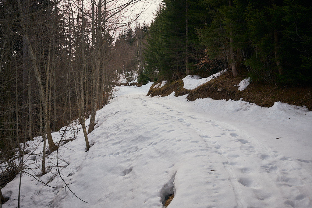 Ab jetzt ging es mehr oder weniger gleichbleibend steil durch den Wald hinauf nach Tanzboden. Auf 1200m erreichte ich dann erstmals die Schneegrenze. Ich war etwas beunruhigt, erschienen diese Hänge und Hügel doch letzthin vom Tal aus schon praktisch schneefrei. Zu allem Übel waren heute dazu noch Holzarbeiter mit schwerem Gerät am Werk, sodass der Waldweg ab Tanzboden in eine anstrengende Schlammpiste mit Schnee auf beiden Seiten überging. Ich schob das Bike an den Baumaschinen vorbei, im hoffnungsvollen Vertrauen auf bessere Wegverhältnisse dahinter. Schon nach der nächsten Kurve wurde diese Erwartung allerdings jäh zerstört, als ich vor einer geschlossenen und tiefen Schneedecke stand. Diese versperrte den immer noch ansteigenden Forstweg ab jetzt, soweit ich sehen konnte. Eine Alternative (ausser der Rückkehr ins Tal) gab es nicht, und den Baggern im Schlamm wollte ich auch kein zweites Mal begegnen.