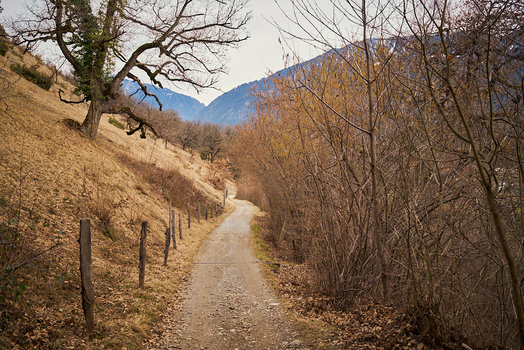 Bisher folgte ich zwischen Tamins und Chur stets dem beschilderten Radweg. Heute entdeckte ich aber eine lohnendere Alternative, die zuerst durch den östlichen Dorfteil von Tamins und danach auf einem idyllischen Karrenweg durch den Wald hinunter zum Rhein führte. Dieser Weg mündete bei Pradamal dann wieder beim üblichen Radweg ein, auf dem ich die restlichen Kilometer über Felsberg bis nach Chur fuhr.