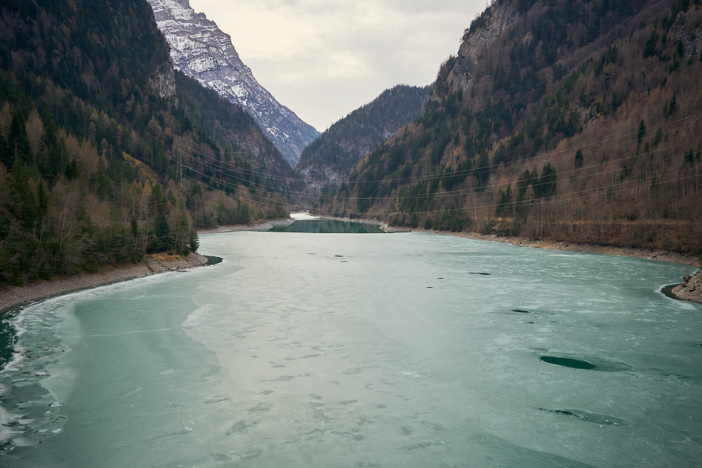 Erst unten auf der Hauptstrasse nach Vättis hellte sich meine Stimmung wieder auf. Die Lufttemperatur war etwas wärmer und dank einer angenehmen leichten Steigung folgte bald auch meine Körpertemperatur. Ich hatte inzwischen angesichts der gerade zurückliegenden Erlebnisse und der umliegenden schroffen weissen Berggipfel der Calanda- und Pizolkette schon leichte Bedenken, den Kunkelspass ohne neuen Schneekontakt erreichen zu können. Zudem war der malerische Magpragg-Stausee von einer leichten Eisschicht bedeckt, was ebenfalls im Kontrast zu letzten Jahr stand. Ich beschloss aber, auf jeden Fall einfach einmal nach Vättis zu fahren und die Situation dort neu zu beurteilen.