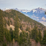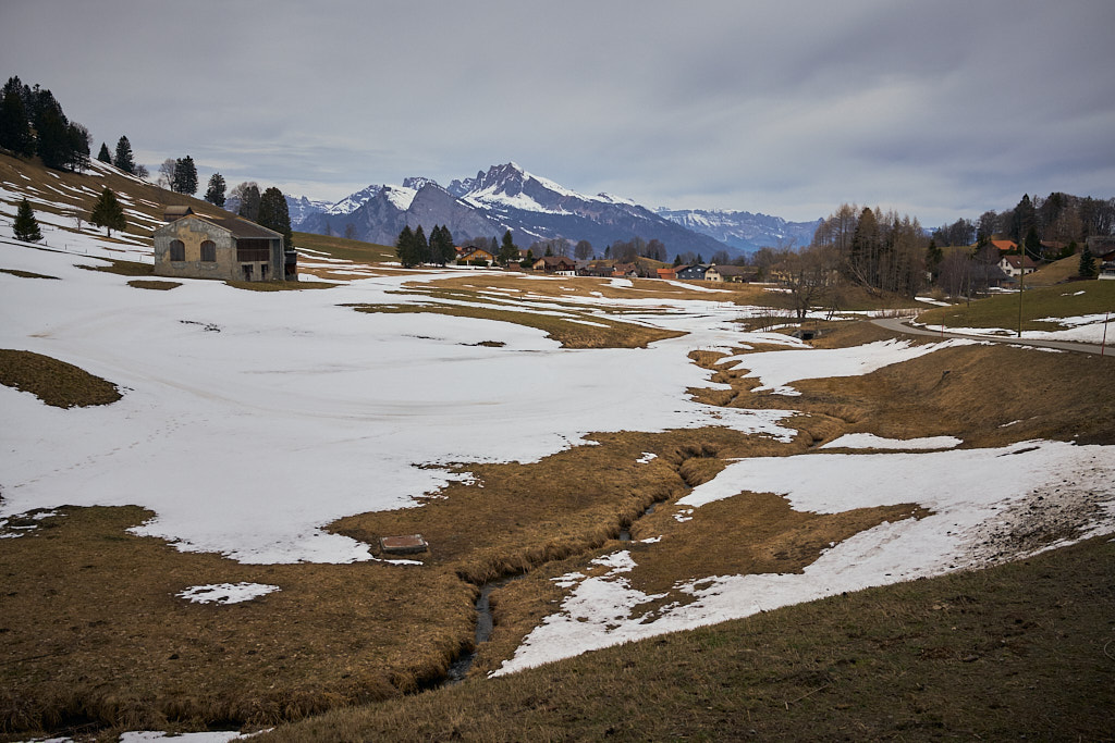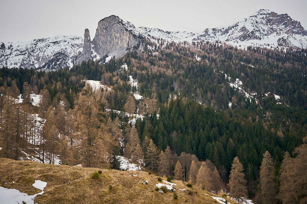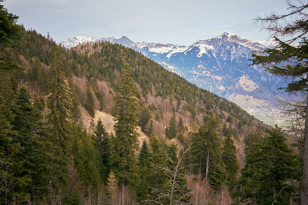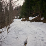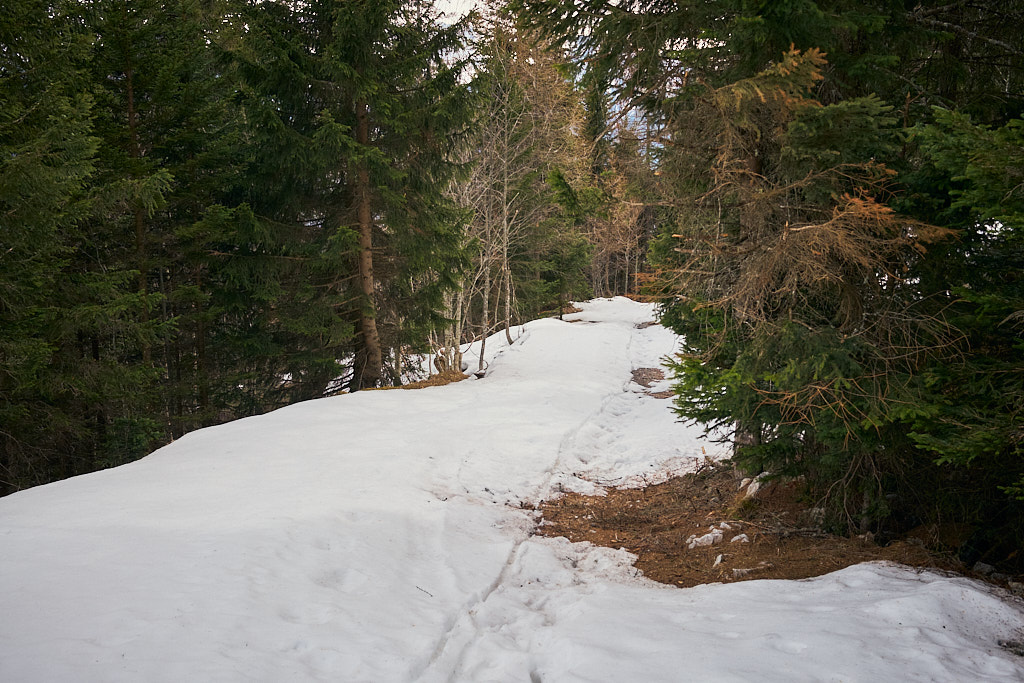 So blieb mir nur noch das anstrengende, meterweise Schneestapfen bergauf mit dem Bike auf der Schulter. Auf 1350m erreichte ich – inzwischen mit klatschnassen Füssen in meinen für solche Aktionen ziemlich ungeeigneten Halbschuhen – einen Wanderweg, der die letzte Wegbiegung des Fahrwegs zum Fürgglichopf etwas abkürzte. Leider lag auch hier sehr viel Schnee, aber ich konnte auch diesen rund 300m langen Abschnitt zwischen Ästen und umgestürzten Baumstämmen mitsamt Bike irgendwann hinter mich bringen. Ich stiess wieder auf den ursprünglichen Fahrweg, der im Gegensatz zu vorhin hier ziemlich ausgetrampelt war. Ski- und Schneeschuhspuren legten nahe, dass die Gipfel der Hügelkette weiter oben offenbar beliebte Ausflugsziele waren.