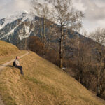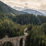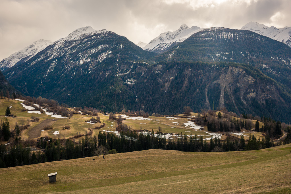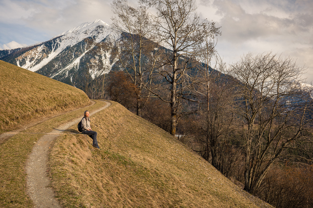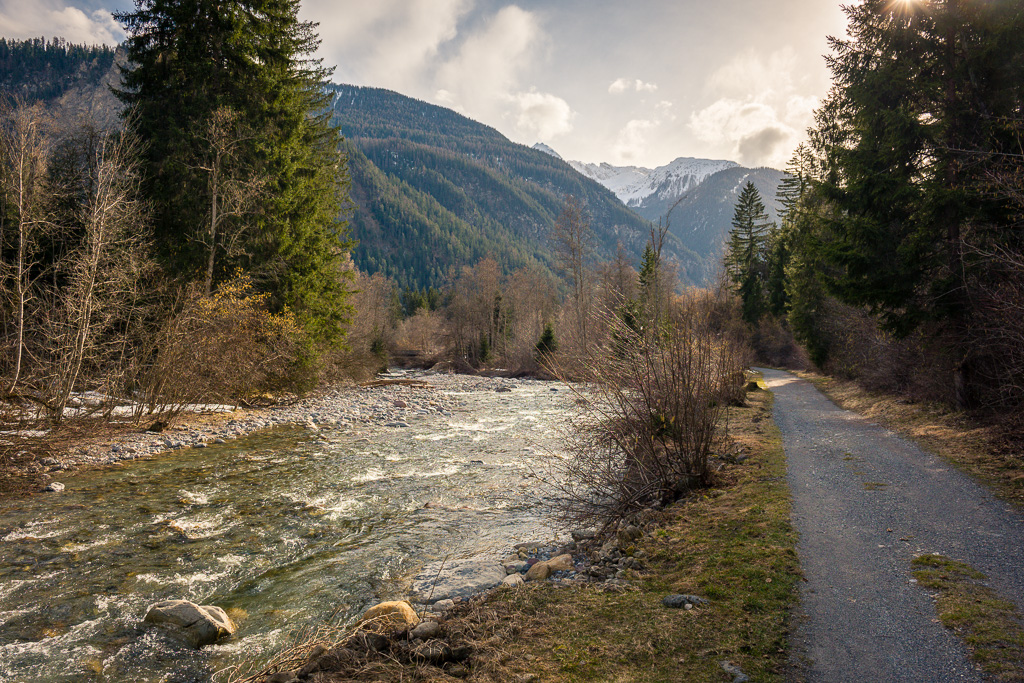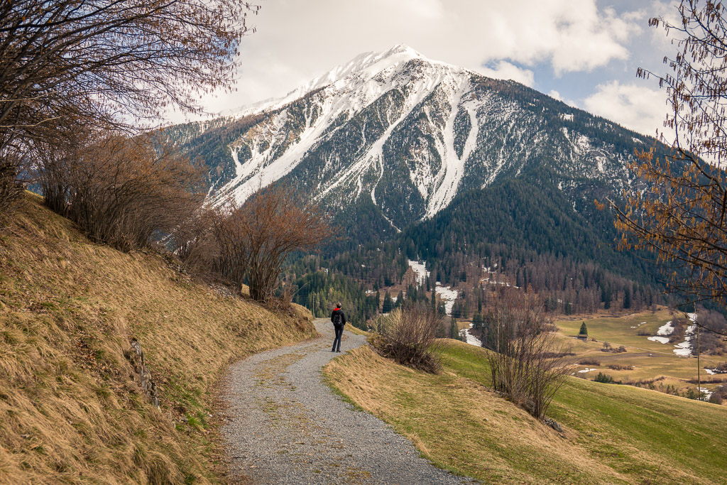 Sonntagsspaziergang mit Blick auf Wiesner Viadukt, Landwasser, die verschneite Muchetta und das frühlingshafte Albulatal.