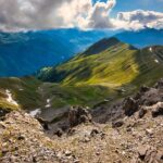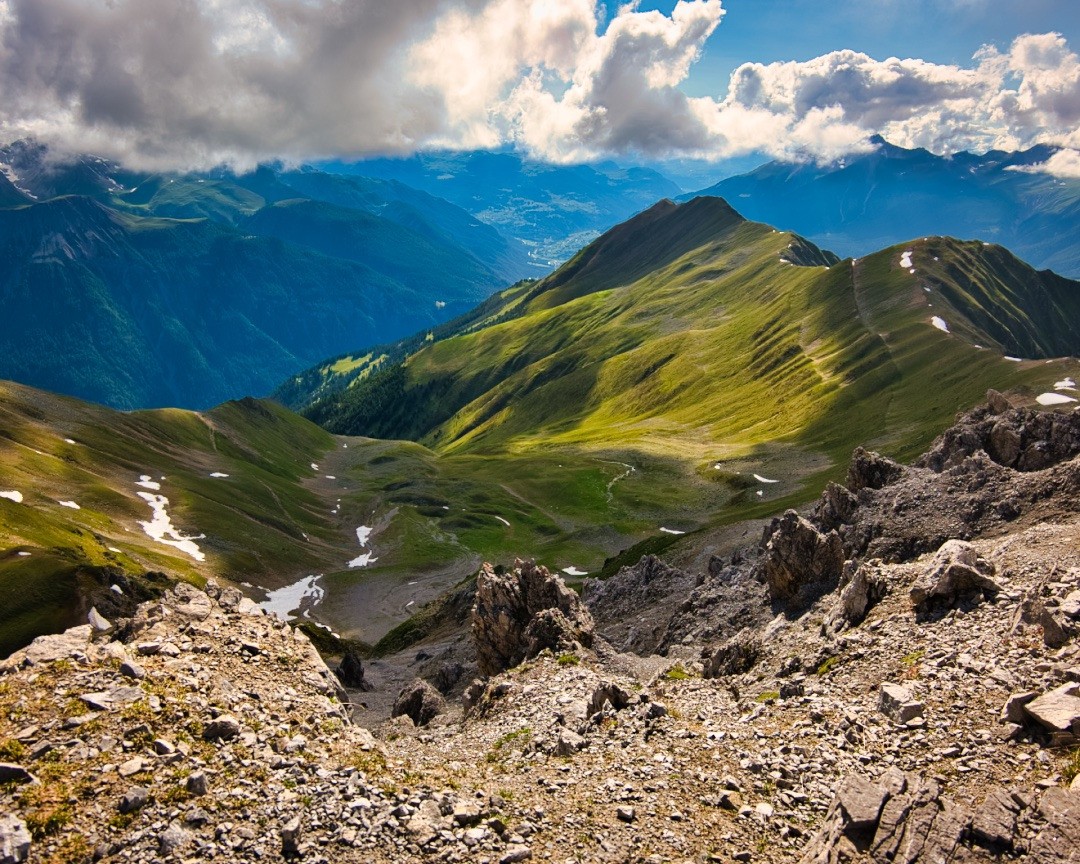 Über die zerfurchte Hügellandschaft von Gruoben geht der Wanderweg in den breiten Gras- und Geröllkessel von Büelen hinauf. Hier wird die langgezogene Felsformationen des Büelenhorns erstmals richtig sichtbar. Rechts vom Gipfelaufbau führt der Weg in Kehren durch die steiler werdenden Grashänge hinauf zum breiten, felsigen Gipfelgrat und man erreicht von hier das Gipfelkreuz mit Buch auf einem ausgetretenen Pfad in wenigen Minuten. Unterwegs mündet auch der Weg ein, der von der Muchetta über den Stulsergrat her kommt.