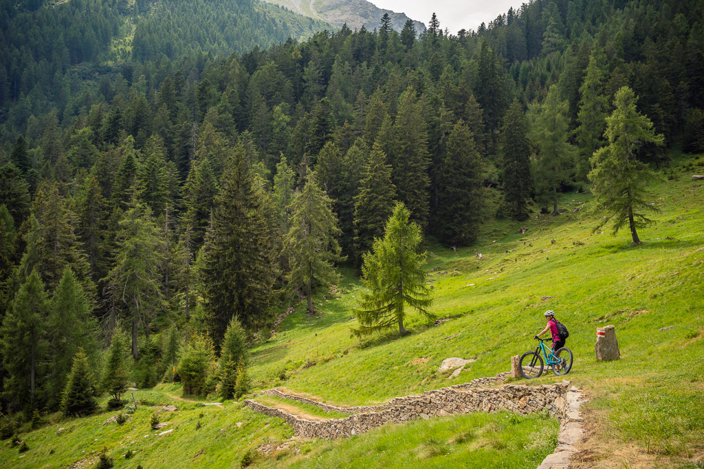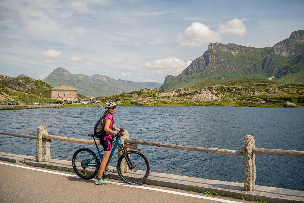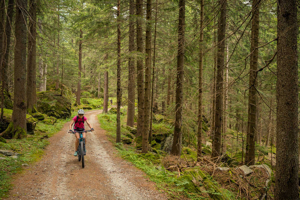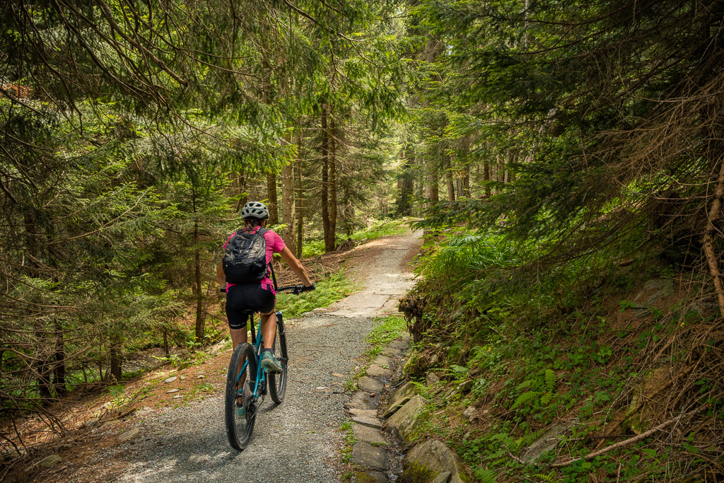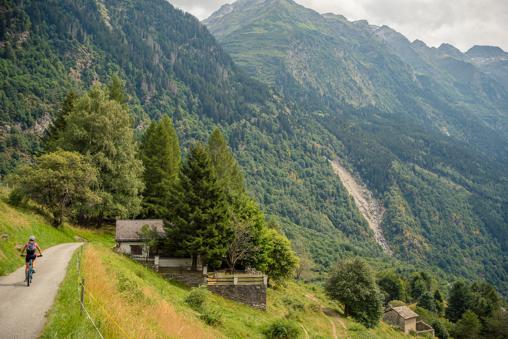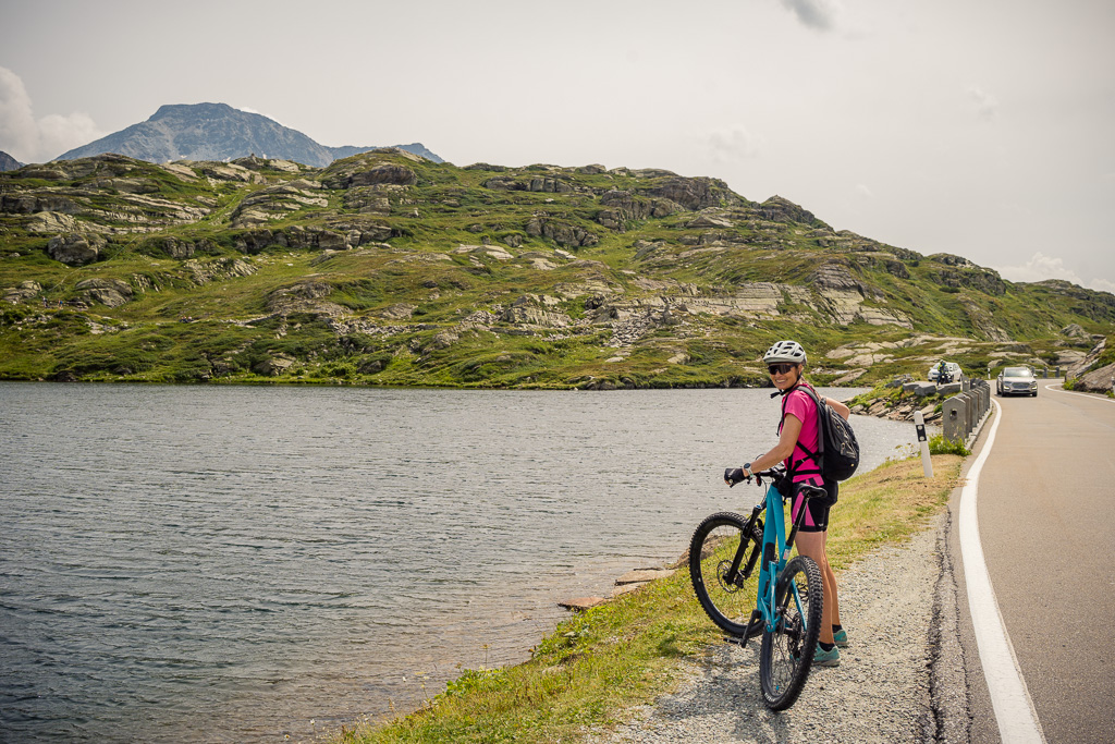Durch die Blechwüste der Autos auf dem Parkplatz der (einige Jahre lang stillgelegten, aber jetzt offenbar wieder teilweise in Betrieb genommenen) Bergbahnen in San Bernardino bahnten wir uns einen Weg zum Anfang der MTB-Route nach Pian San Giacomo. Auf diesem schönen Waldweg hatten wir uns etwas mehr Abgeschiedenheit erhofft, zumindest bis zum Lago d’Isola waren aber auch hier viele Spaziergänger unterwegs. Nach der Staumauer des Sees wurde es aber schnell ruhiger und der Weg wand sich in einer sehr schönen Abfahrt hinunter nach Pian San Giacomo. Ich war froh, hier auf dem Mountainbike zu sitzen, da einige Wegabschnitte doch sehr holprig fürs Gravelbike und für die Handgelenke gewesen wären.
