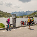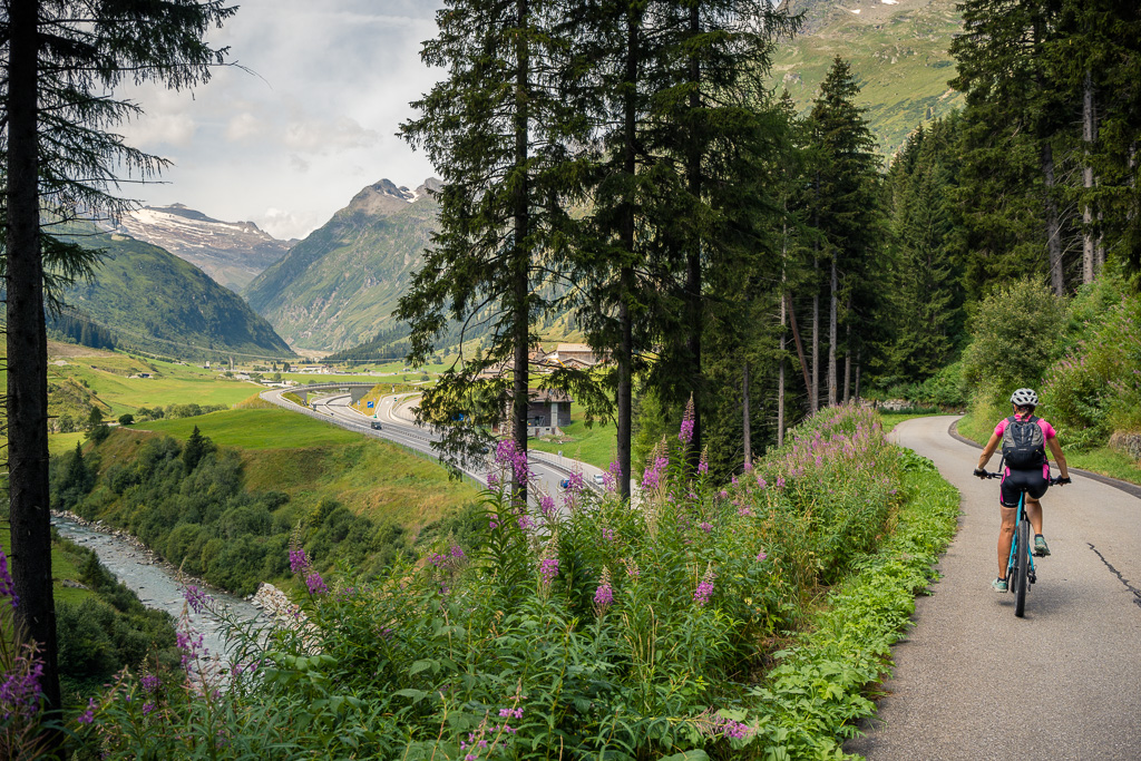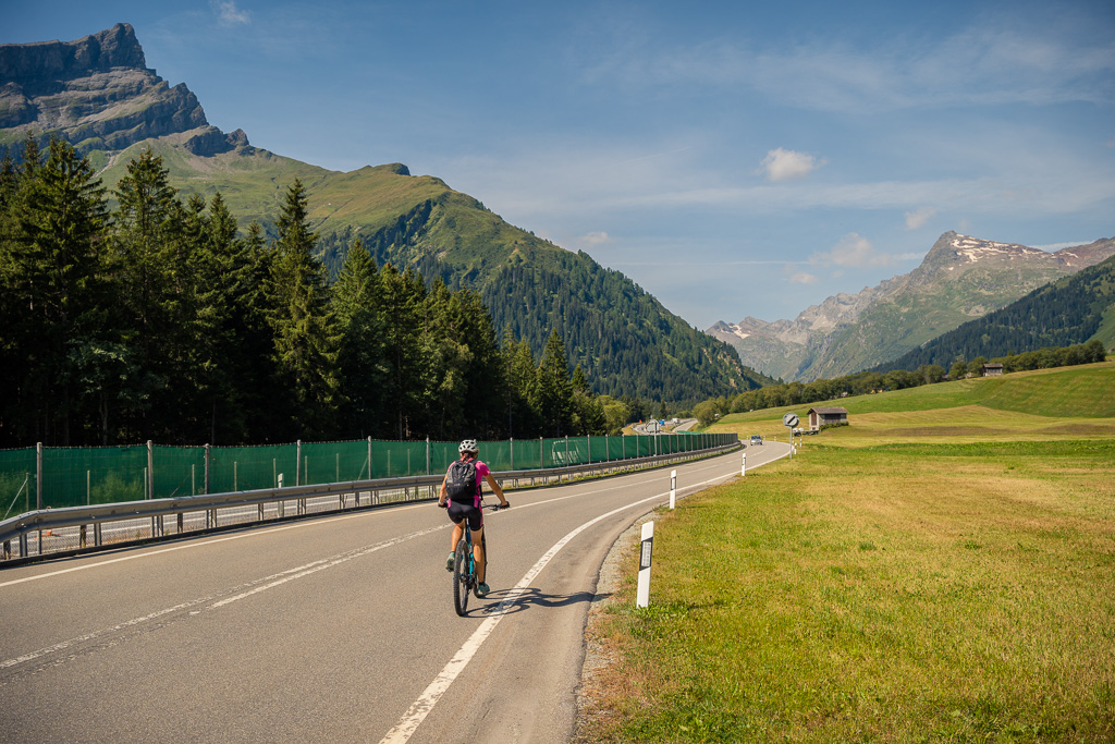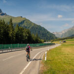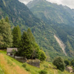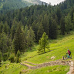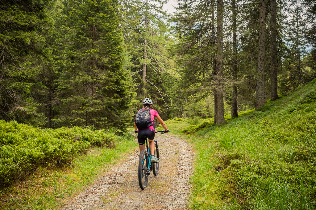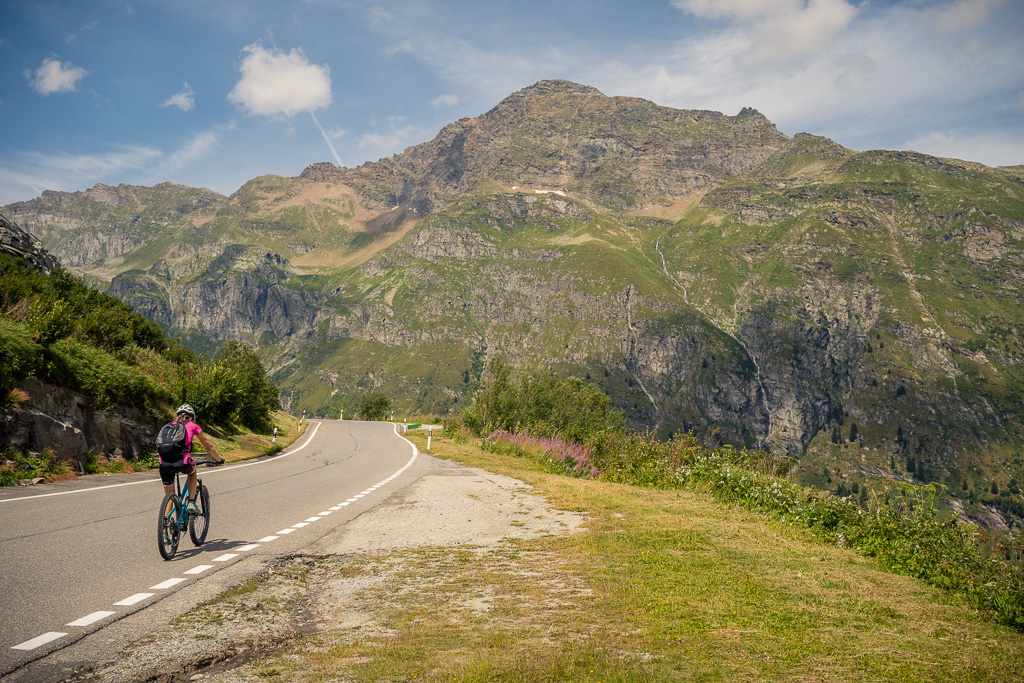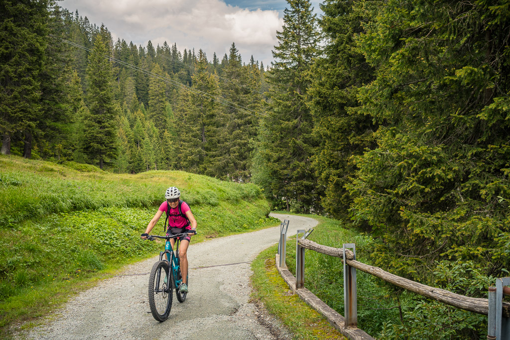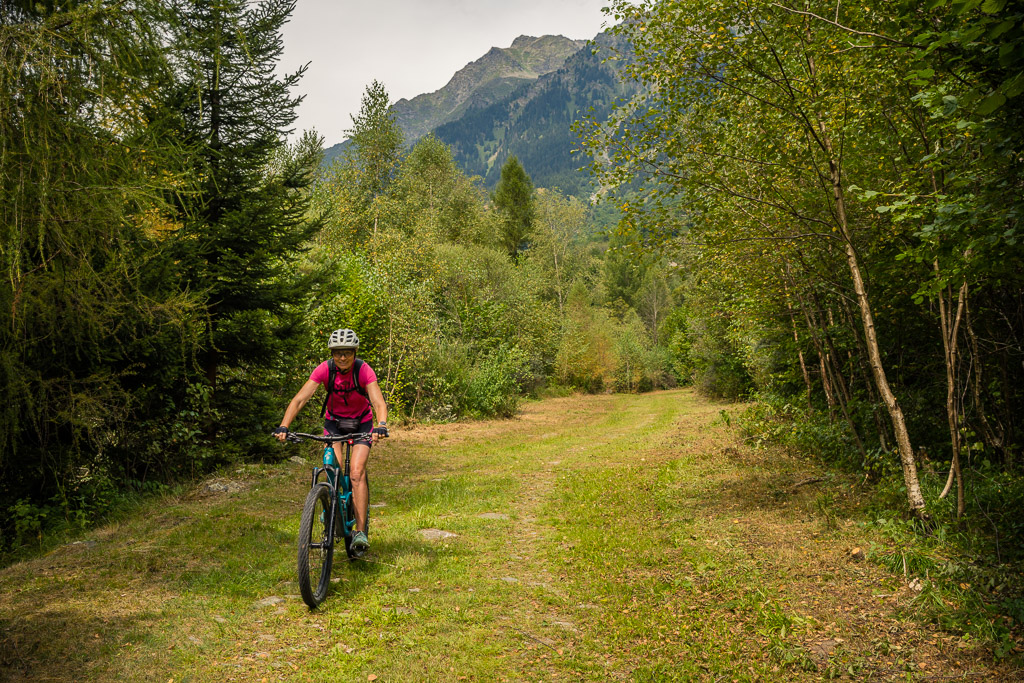 Durch die Blechwüste der Autos auf dem Parkplatz der (einige Jahre lang stillgelegten, aber jetzt offenbar wieder teilweise in Betrieb genommenen) Bergbahnen in San Bernardino bahnten wir uns einen Weg zum Anfang der MTB-Route nach Pian San Giacomo. Auf diesem schönen Waldweg hatten wir uns etwas mehr Abgeschiedenheit erhofft, zumindest bis zum Lago d’Isola waren aber auch hier viele Spaziergänger unterwegs. Nach der Staumauer des Sees wurde es aber schnell ruhiger und der Weg wand sich in einer sehr schönen Abfahrt hinunter nach Pian San Giacomo. Ich war froh, hier auf dem Mountainbike zu sitzen, da einige Wegabschnitte doch sehr holprig fürs Gravelbike und für die Handgelenke gewesen wären.