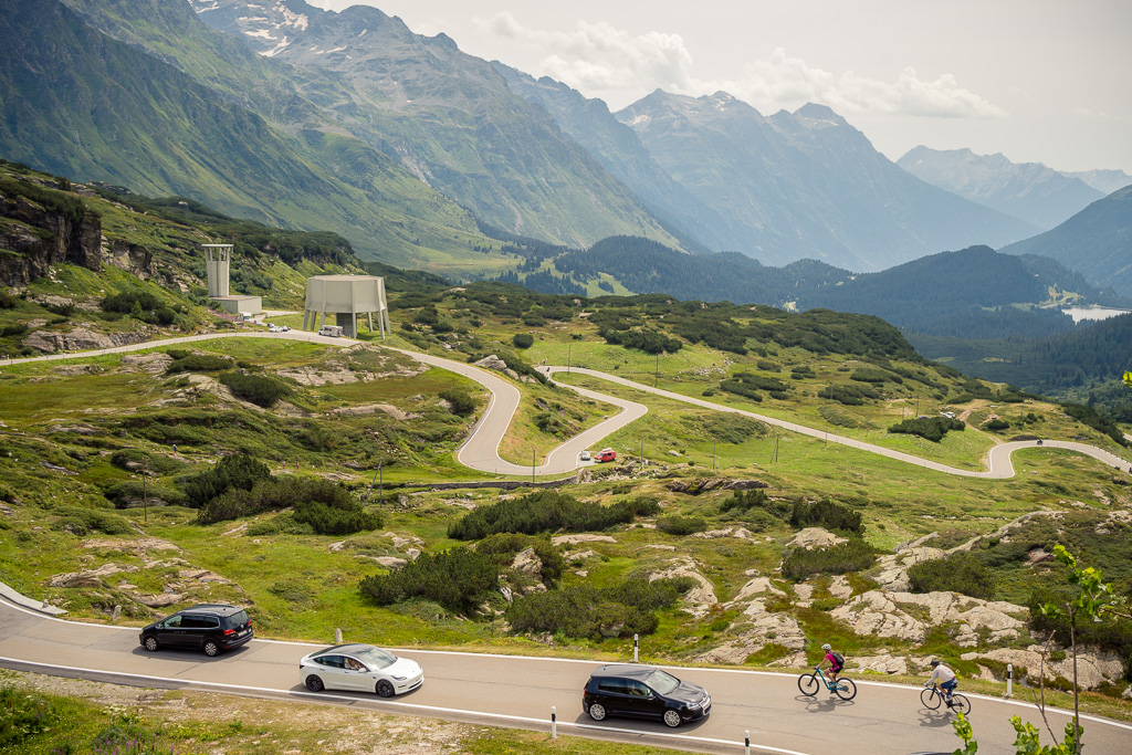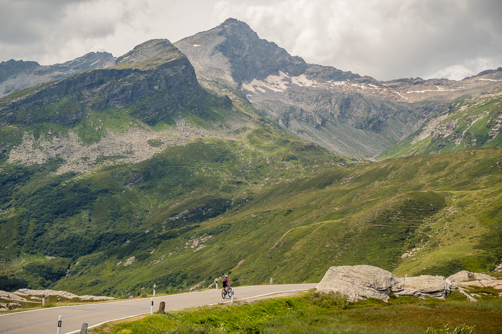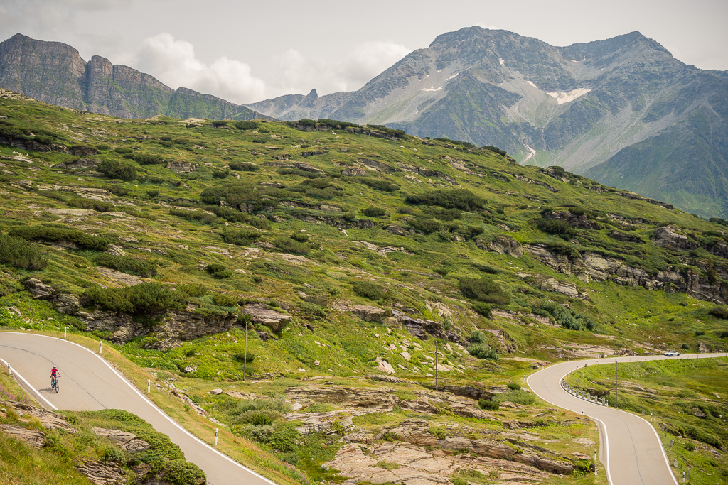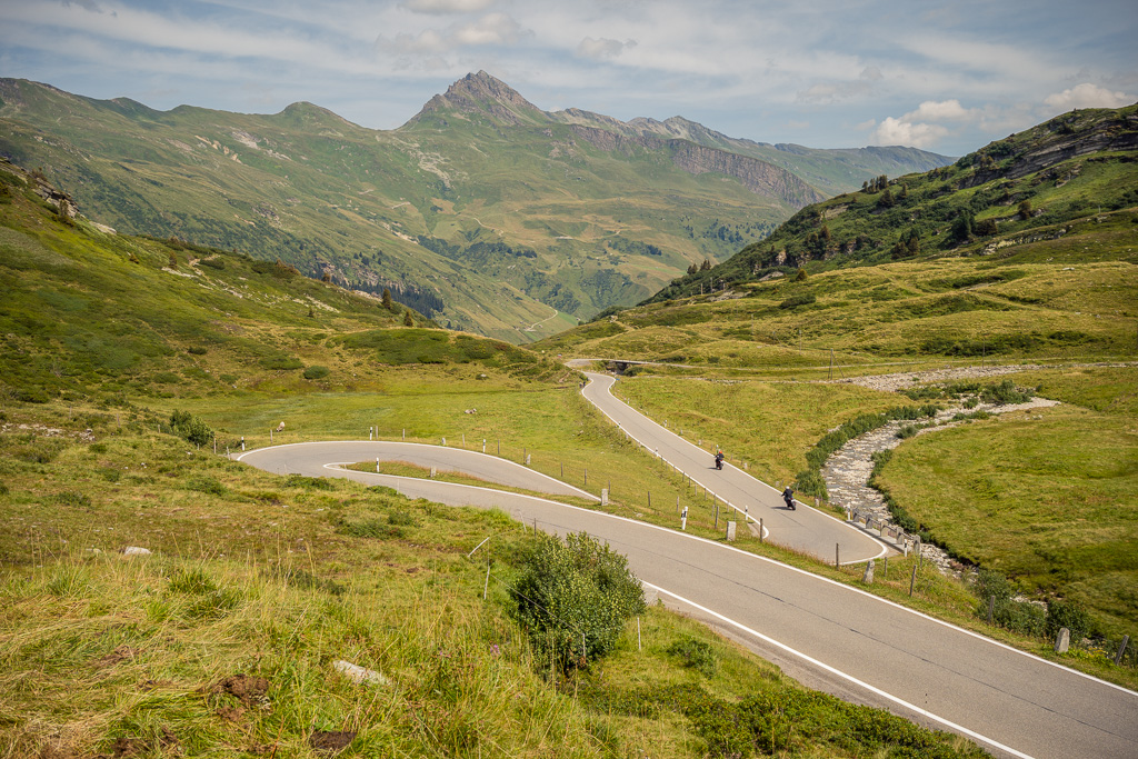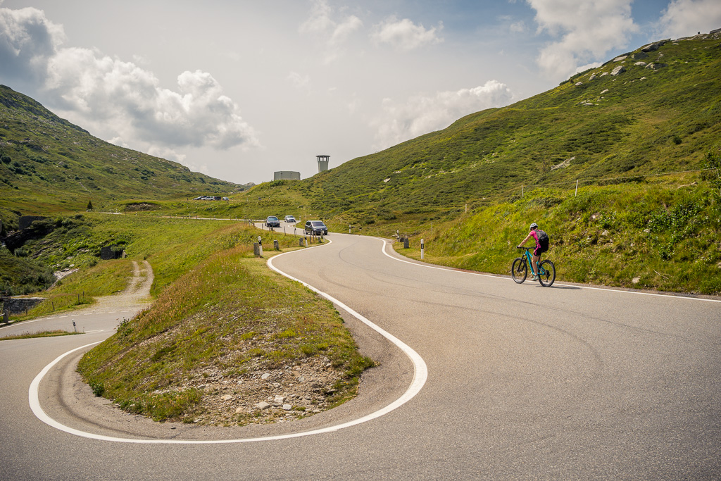 Von Splügen aus mussten wir zuerst auf einem längeren Abschnitt auf Nebenwegen über dem Hinterrhein und der Autostrasse fahren, bis wir überhaupt das Tunnelportal am Fuss der San Bernardino-Passstrasse erreichten. Dort angekommen, machten wir uns an den Aufstieg über die Passstrasse, die im unteren Teil in zahlreichen, wie eine Ziehharmonika zusammengefalteten Haarnadelkurven mit längeren, sehr angenehm zu fahrenden und nur wenig ansteigenden Geraden verlief. Über der Waldgrenze auf der Tällialp zog sich die Strasse dann lang ansteigend in Nord-Süd-Richtung dahin. Es wurde hier deutlich kälter und es wehte uns ein fast eisiger Gegenwind ins Gesicht, aber im Hinblick auf die vorhergesagte Bruthitze im Talkessel um Bellinzona herum wollte ich nicht klagen.