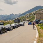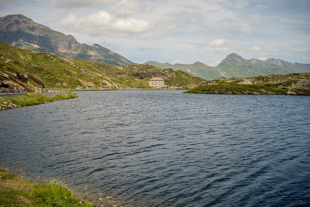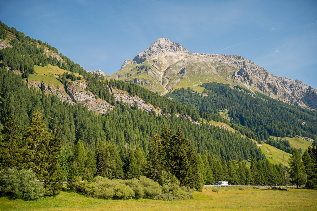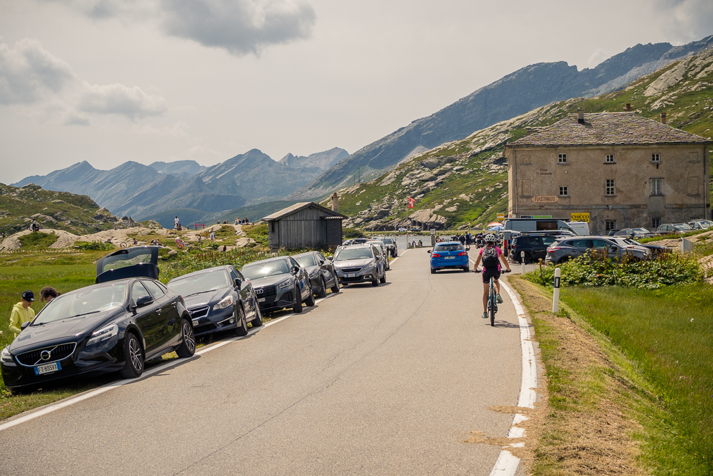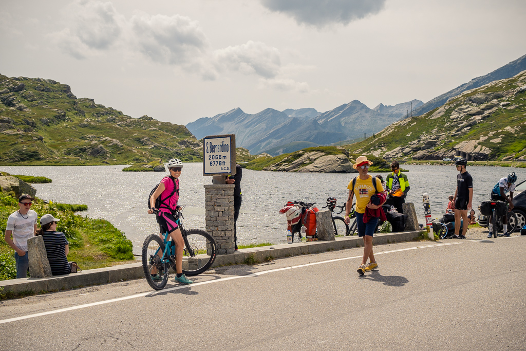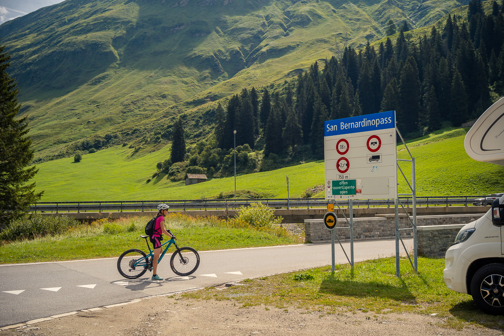 Auf der Abfahrt waren wir fasziniert davon, wie praktisch jeder ebene Grasfleck, jede Park- und Campingmöglichkeit auf beiden Seiten der Strasse von sonnenbadenden oder picknickenden Urlaubern besetzt war. Nach vielen Kurven und einer Baustelle kamen wir dann in San Bernardino an und wurden gleich als nächstes von den voll belegten Parkflächen und den Getümmel dort überrascht. Mit all den italienischen Wortfetzen, die durch die Luft drangen, entstand fast ein Gefühl von Strandurlaub am Mittelmeer, obwohl wir noch mitten in den Bergen waren.