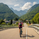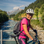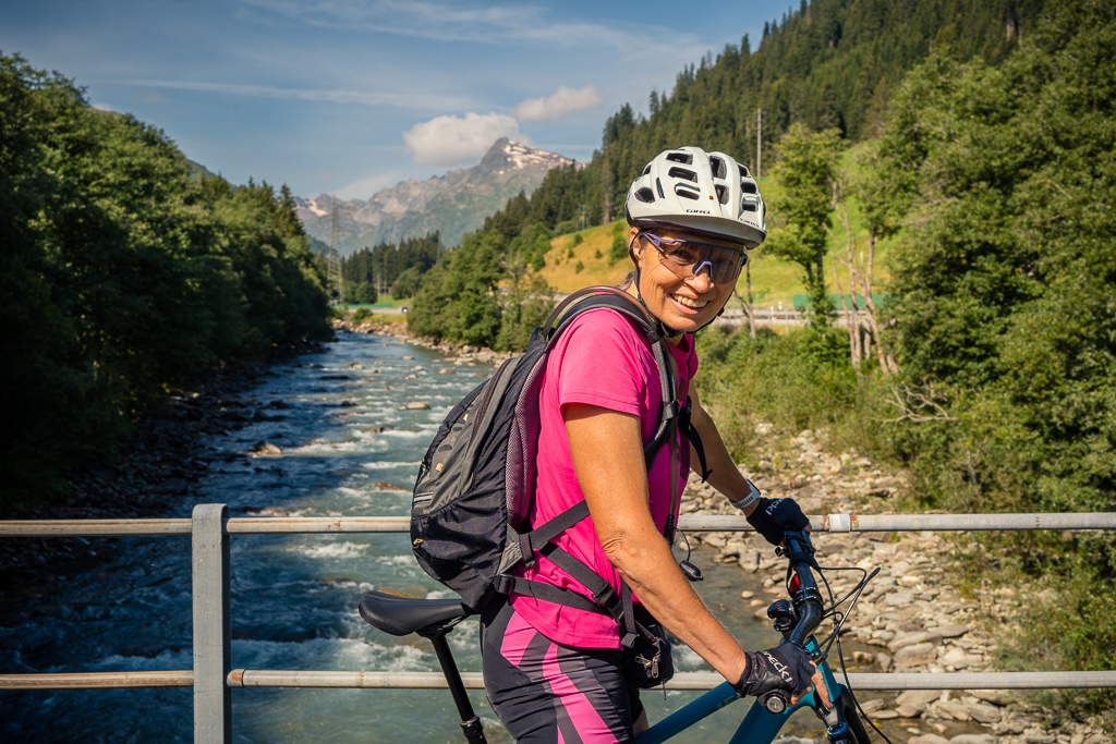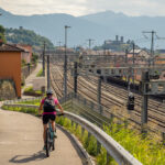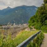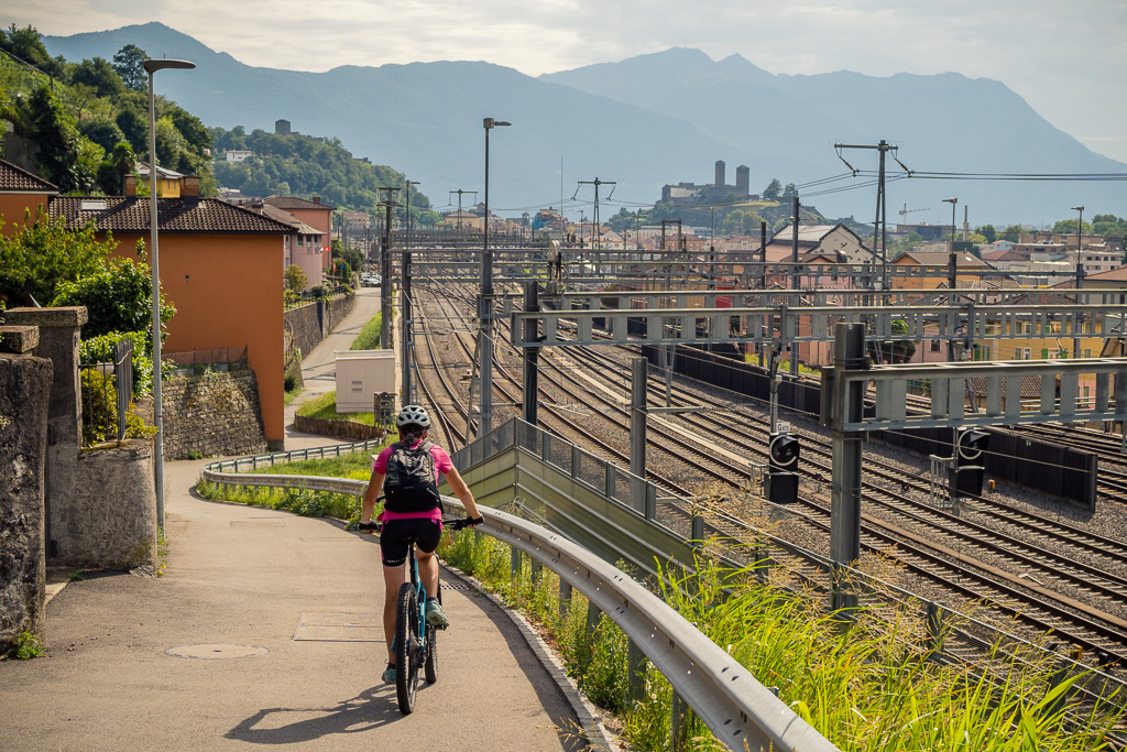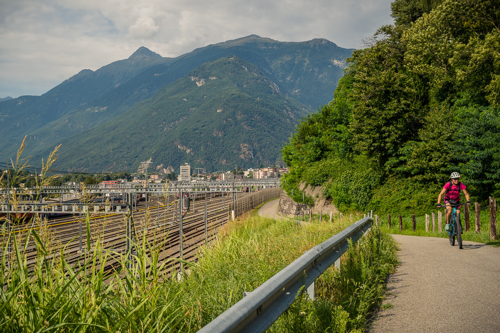 Ansonsten verlief die Tour aber zum Glück ohne weitere Hindernisse. Bei Grono kreuzten wir den Fluss auf einer breiten Brücke mit bester Sicht ins Val Calanca hinein, wo wir in diesem Jahr auch schon eine abenteuerliche Biketour (allerdings auf Leihrädern) bewältigt hatten. Es folgte ein sehr schöner Abschnitt auf ehemaligen Bahngleisen, die nun zu einem Radweg umgebaut waren, und an stillgelegten Bahnhöfen vorbei. Nach Roveredo erreichten wir einen langen Radweg, den wir auf besagter Tour ins Val Calanca auch schon in der Gegenrichtung befahren hatten. Die Siedlungsdichte nahm nun immer mehr zu, das urbane Radwegnetz war aber ausgezeichnet beschildert und zu befahren. Bei Lumino folgte wieder eine Flussüberquerung und ein schönes Waldstück am Grotto Bassa vorbei, einer idyllisch gelegenen Waldgaststätte. Am Schluss ging es in stetem Auf und Ab durch die Wohnviertel und Seitenstrassen von Arbedo hindurch und den Bahngleisen entlang bis zum Bahnhof Bellinzona, wo wir in einer schwungvollen Kurve in den Busbahnhof hineinfuhren und direkt vor dem in wenigen Minuten abfahrenden Expressbus in Richtung Chur (und Splügen) zum Stillstand kamen.