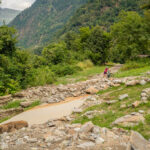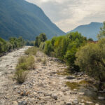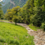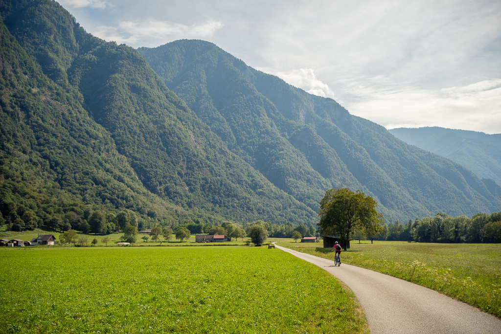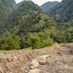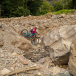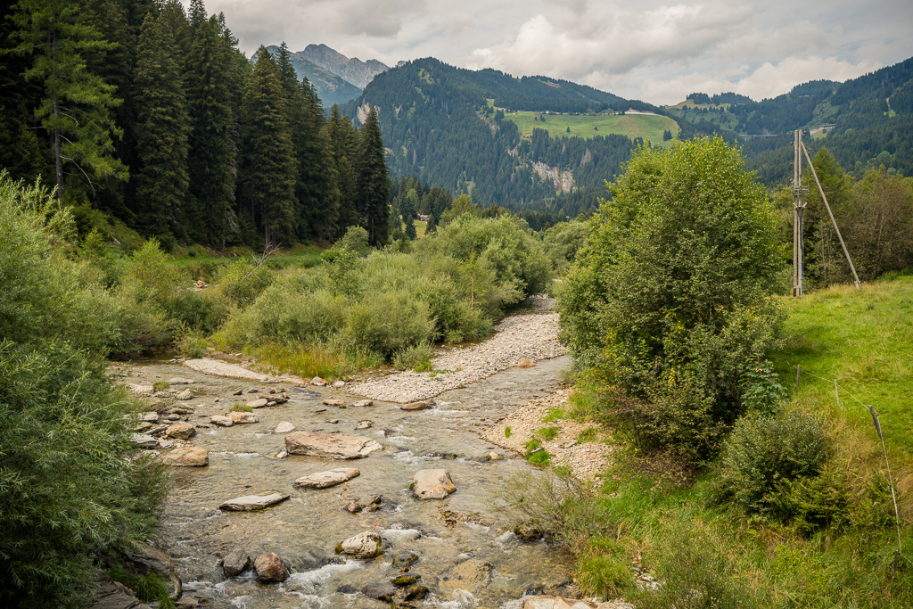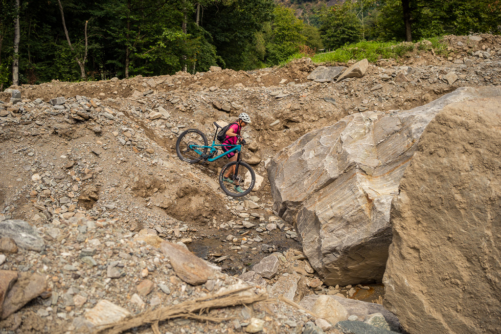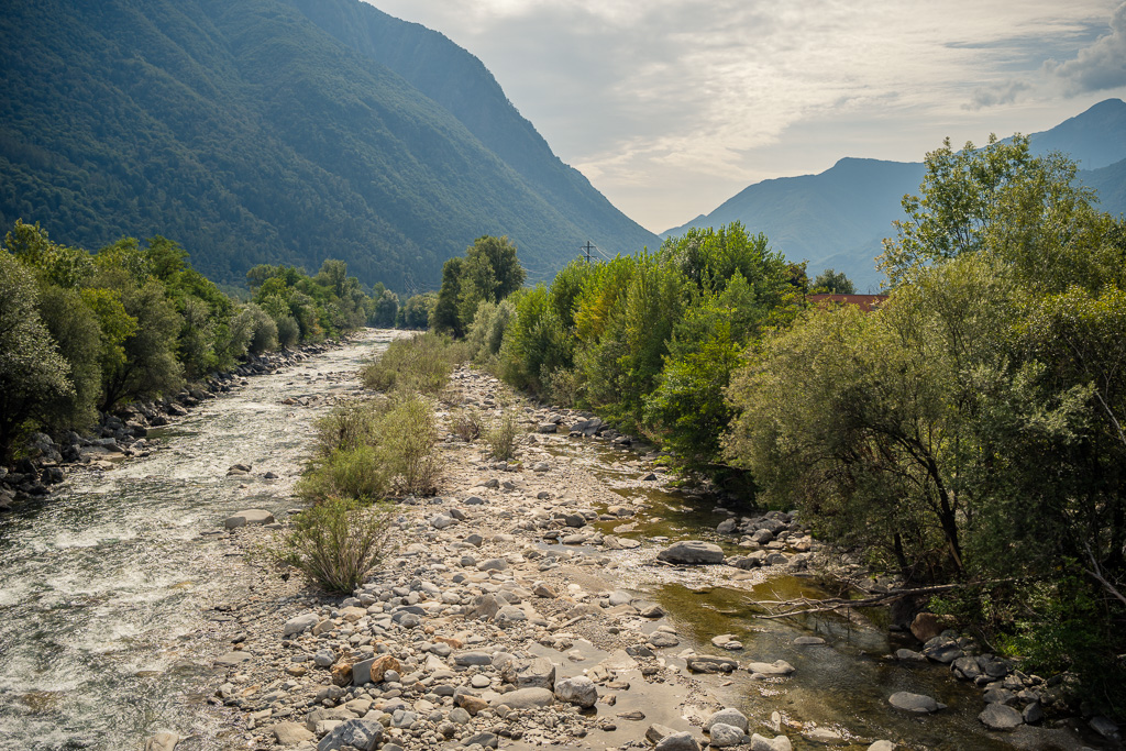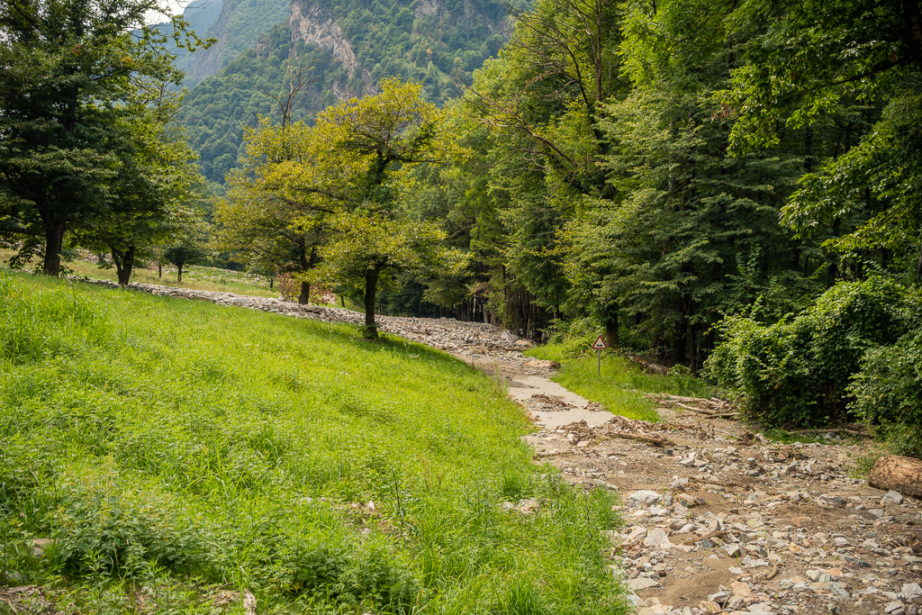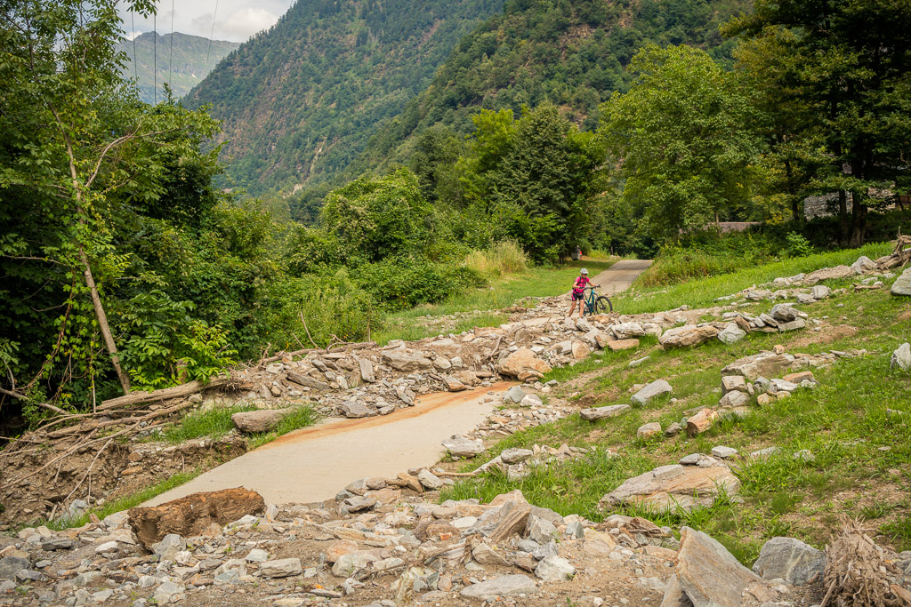 Im weiteren Verlauf trafen wir tatsächlich immer wieder auf Überreste vergangener Überschwemmungen und Murgänge aus den hoch aufragenden Bergflanken zu unserer Seite. Zahlreiche Felsabbrüche klafften auch wie Wunden in den steilen Waldhängen. Trockener Schlamm auf den Wiesen liess auch erahnen, wo überall Wasser hingeflossen sein musste. Trotzdem war unsere Fahrstrecke auch in der am meisten betroffenen Region um Lostallo fast durchgehend befahrbar. «Fast», weil unsere Fahrt dann doch an einer Stelle jäh zum Stillstand kam, als unser Weg die Schlucht vom Val d’Orbel kreuzte. Hier hatte sich auf mehreren Hundert Metern ein gewaltiger Schlamm- und Geröllstrom über die Wiesen und den Fahrweg gewälzt und wir mussten uns mit unseren Bikes im Schlepptau ziemlich mühsam einen Weg durch die Schuttmassen und an ihnen vorbei suchen, bis wir wieder festen Grund unter den Rädern hatten.