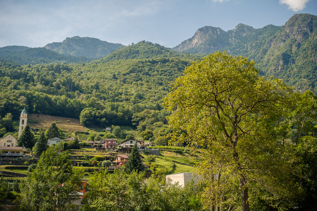 In Pian San Giacomo fuhren wir ein kurzes Stück auf der Strasse entlang, bis der Radweg wieder links zur nächsten Etappe hinunter nach Mesocco abbog. In zahlreichen Kurven und immer wieder unter der dicht befahrenen Autostrasse zum San Bernardino-Tunnel hindurch, zuletzt auf einer (beim letzten Mal ebenfalls nicht versuchten) MTB-Wegvariante kamen wir bei den Hinterhöfen von Mesocco an. Hier war im Juni für mich Endstation, als ich anschliessend mit dem Bus zurück nach Splügen fuhr. Heute waren wir jedoch gut im Zeitplan, es war früher Nachmittag und nach unseren Berechnungen müssten die noch verbleibenden 33 km nach Bellinzona problemlos bis zum Abend zu schaffen sein.