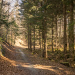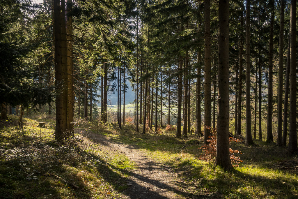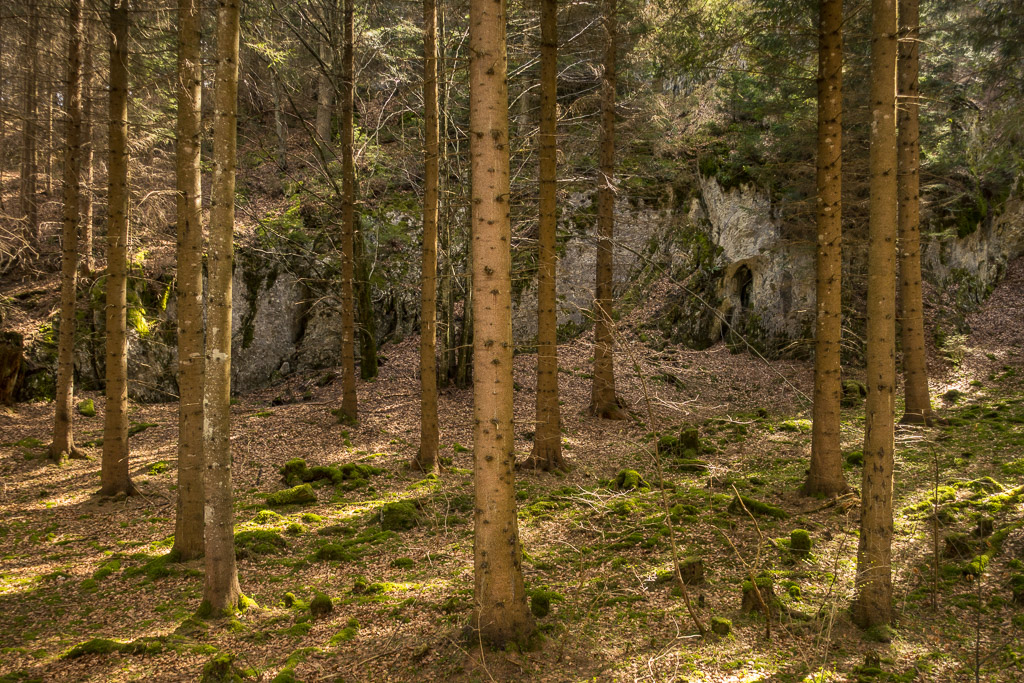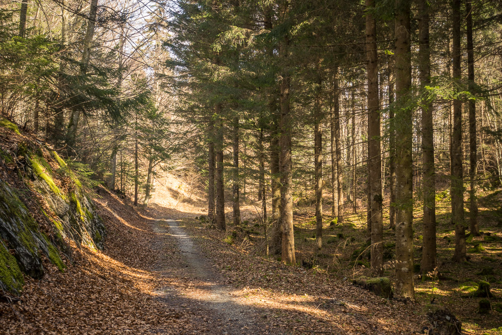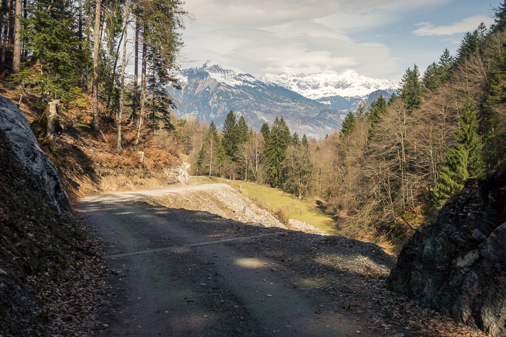 Etwas einfacher, dann wieder äusserst steil fuhr und schob ich das Bike weiter zur Einmündung einer Forststrasse, die von Oldis nördlich von Haldenstein heraufkam. Beim nächsten Mal würde ich wohl gleich von Anfang an über Oldis bis hierher aufsteigen. Ein zweites, sehr mühsames Steilstück mit Schiebestrecke folgte bei Rängg, danach eine schöne Passage durch den Forwald bis zum Bärenhag.