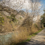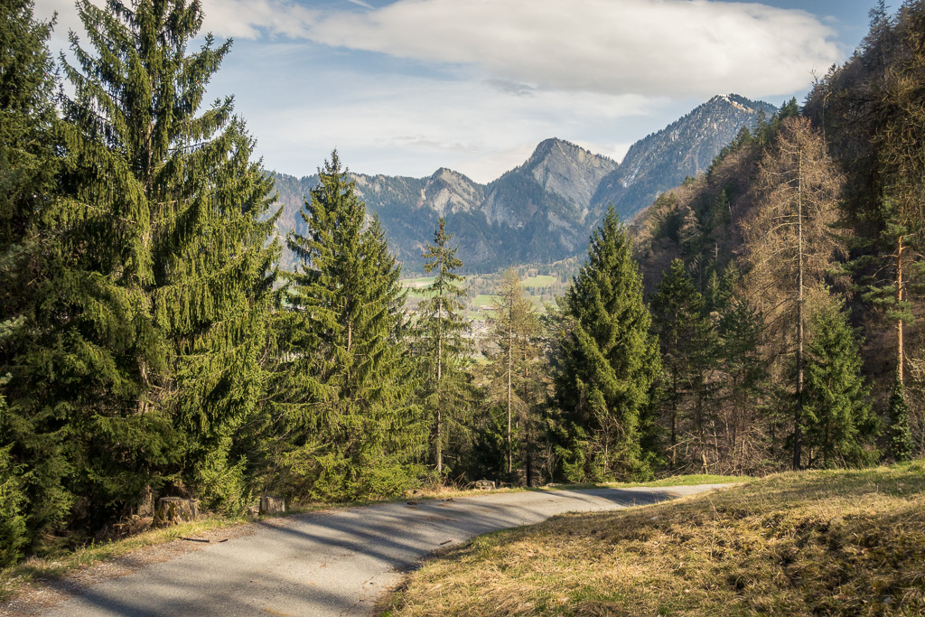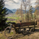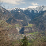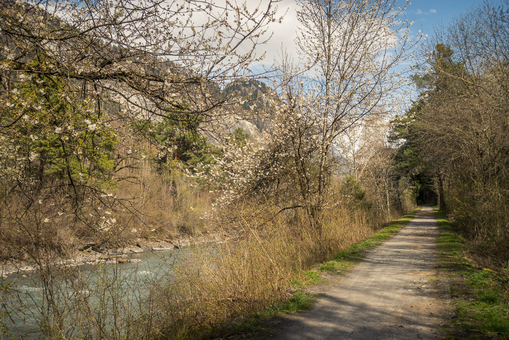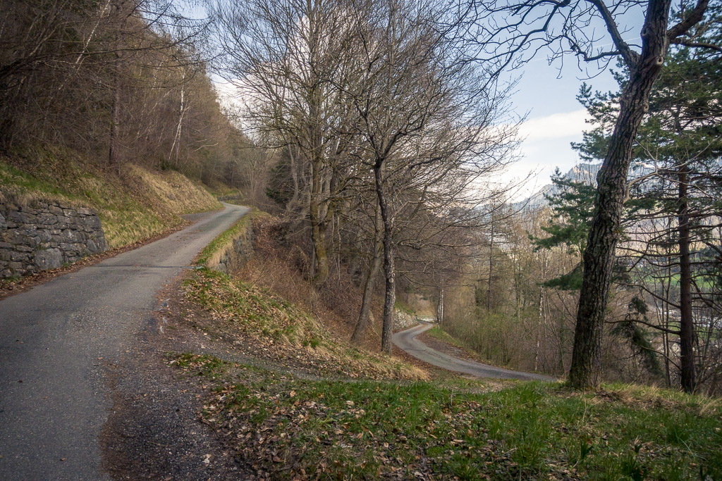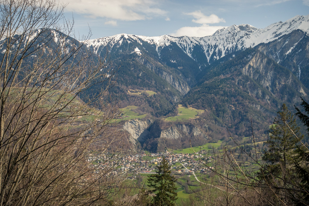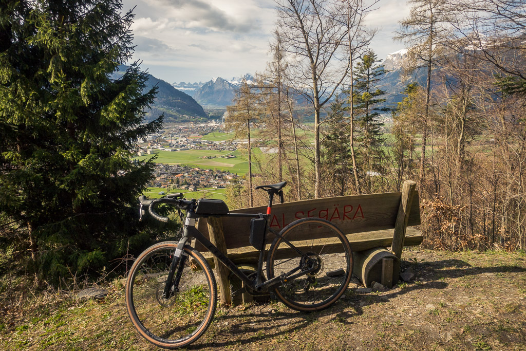 Auf einem Uferweg mit vielen blühenden Bäumen am Fluss Landquart gelangte ich zum Eingang ins Prättigau bei Chlus, wo ich das letzte Mal in der Gegenrichtung von Klosters herunterkam. Statt der Veloroute durch die verschiedenen Dörfer bis nach Chur zu folgen, wählte ich diesmal einen dritten Aufstieg in den Fallwald auf der östlichen Talseite. Diese Steigung entpuppte sich erneut als sehr mühsam und wohl besser geeignet für ein Mountainbike. Etwas später bei Bawald hatte ich mich erneut mit der Routenplanung vertan und musste das Bike bis zum Anfang eines höhergelegenen befahrbaren Waldwegs mühsam über einen steilen Wanderweg in Richtung Burgruine Falkenstein hinaufschieben und -tragen. Dort waren die grössten Mühen dann überstanden und von nun an verlief die Route in stetem Auf und Ab hoch über Zizers vorbei nach Trimmis.